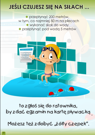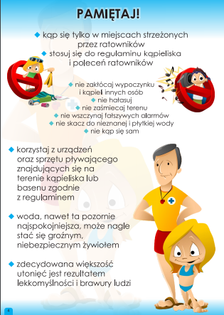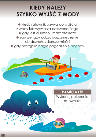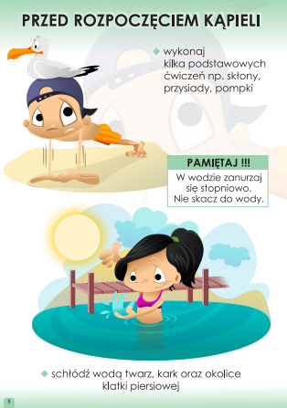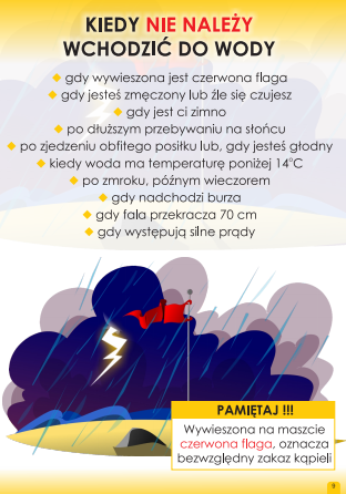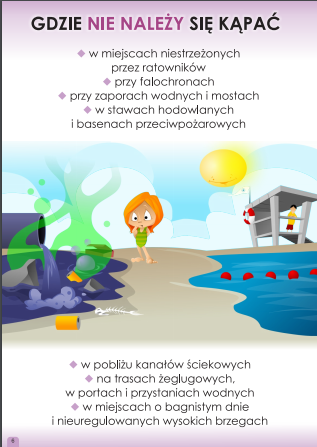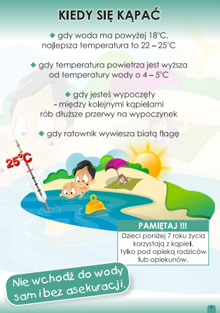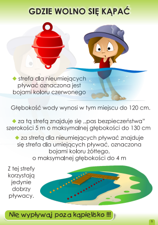 - Kąpmy się tylko w miejscach dozwolonych i pod opieką dorosłych. Jeśli miejsca strzeże ratownik – zawsze stosujmy się do jego poleceń.