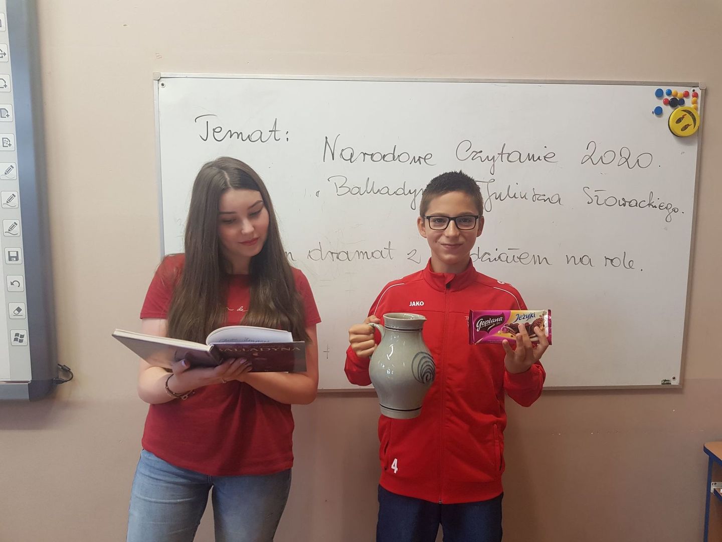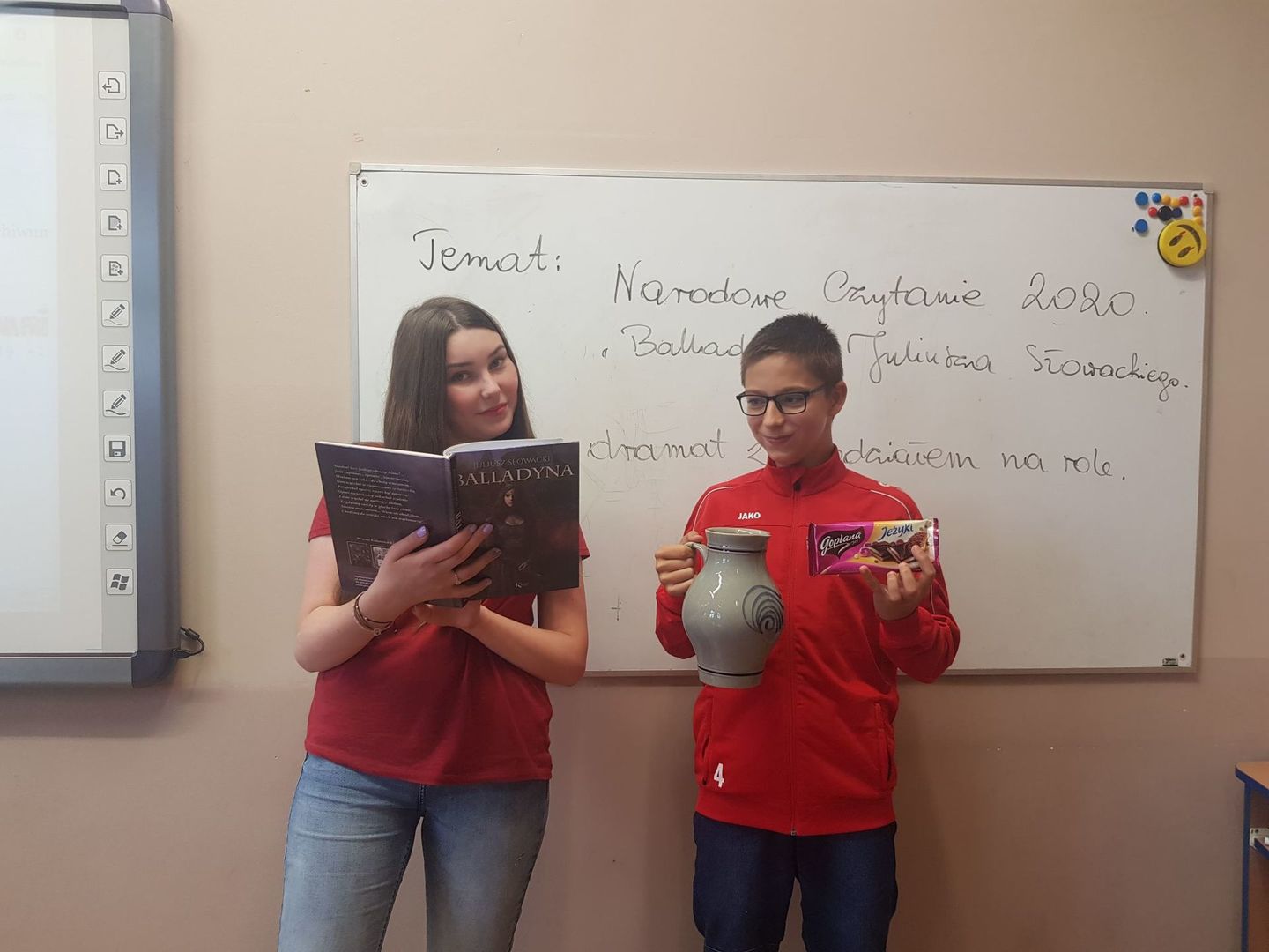 Akcja Narodowe Czytanie organizowana jest przez Prezydenta RP od 2012 roku. Została zainicjowana wspólną lekturą Pana Tadeusza Adama Mickiewicza. W tym roku utworem zaproponowanym do odczytania jest Balladyna Juliusza Słowackiego. Uczniowie klasy 8a i 8b wraz z nauczycielkami języka polskiego na piątkowej lekcji odczytali fragment dramatu oraz powtórzyli symbolikę i motywy w utworze. Wspólne czytanie utworu odbędzie się w sobotę 5 września 2020 roku.
