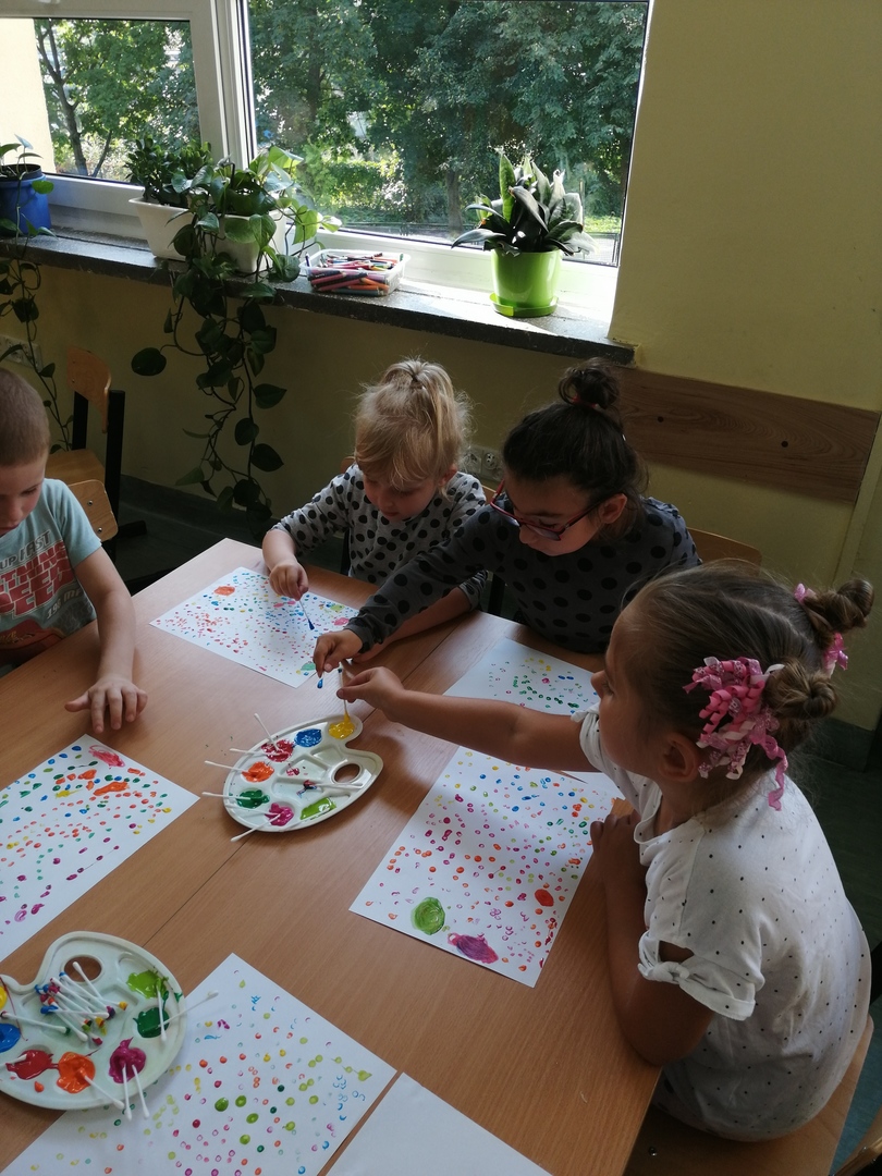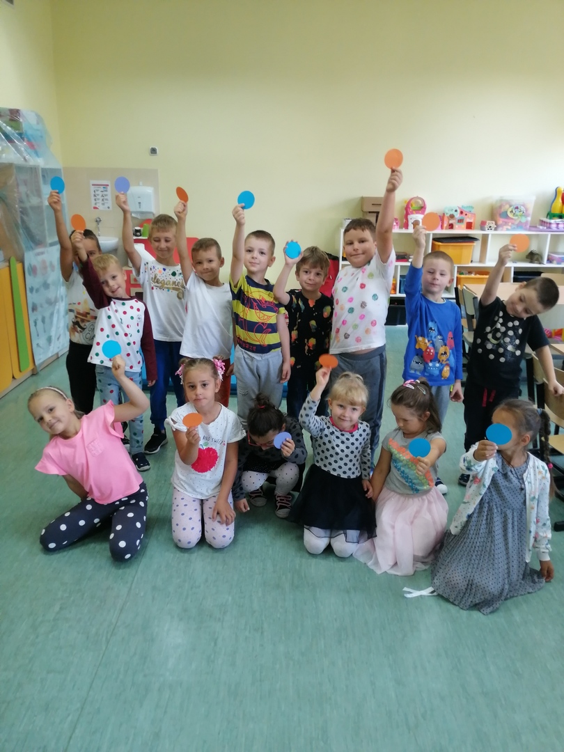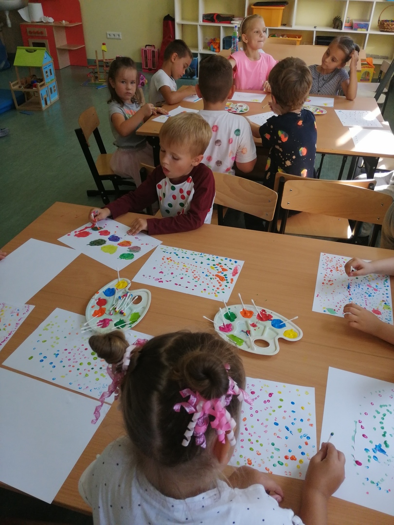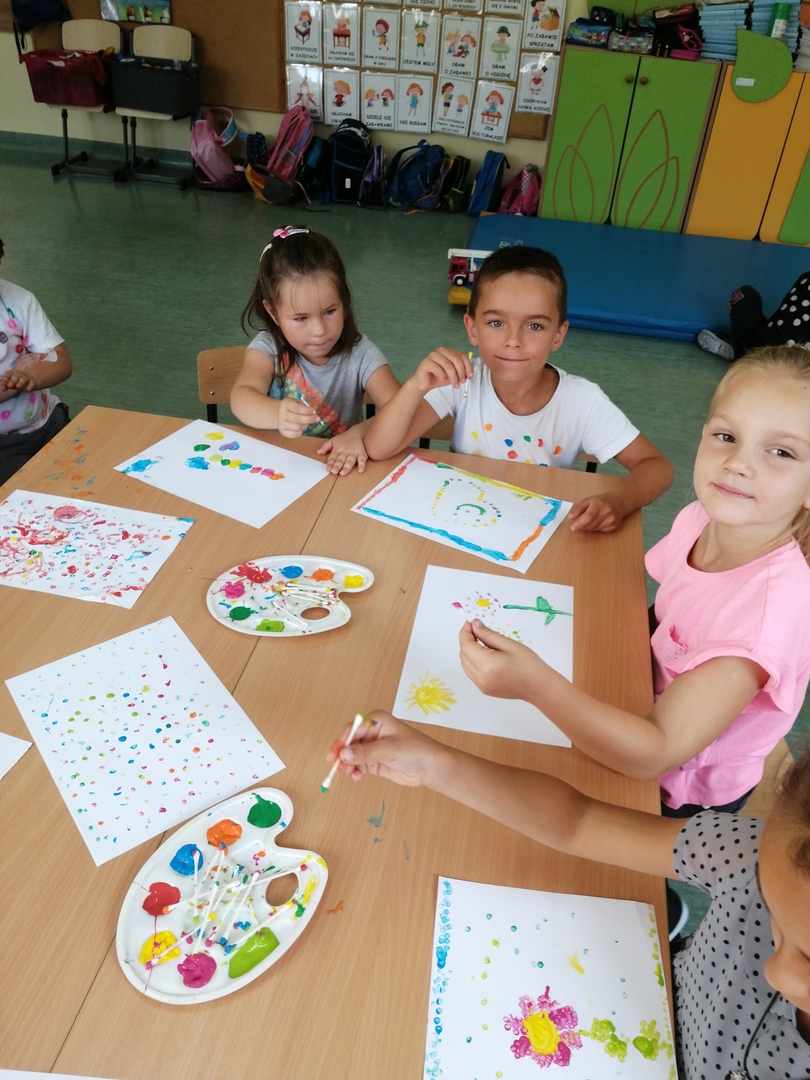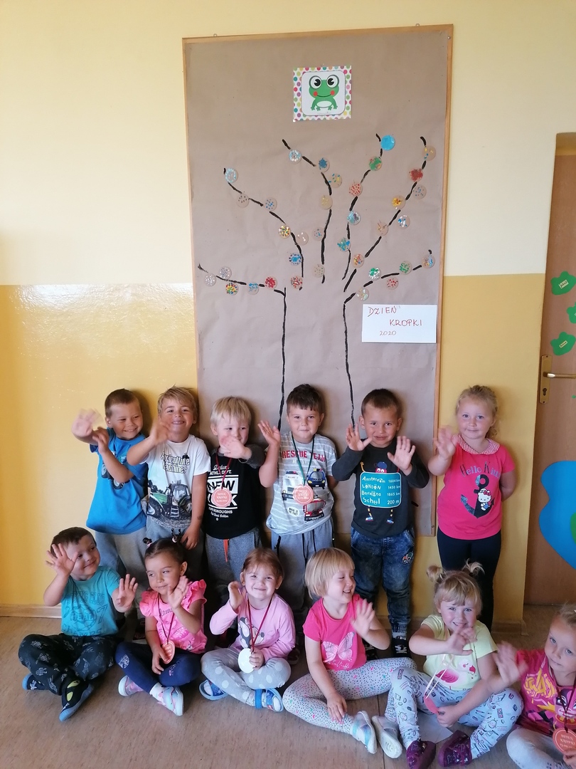 Historia Vashti z książki „The Dot” Petera H. Reynoldsa zapoczątkowała Międzynarodowy Dzień Kropki obchodzony na całym świecie 15 września. Przedszkolaki z oddziałów przedszkolnych i uczniowie klasy I w Dobrej również włączyli się w obchody święta kreatywności, talentu i odwagi w pokonywaniu trudności a kropki towarzyszyły dzieciom przez cały dzień. Obchody Dnia Kropki rozpoczęliśmy właśnie od poznania losów małej Vashti, która dzięki kropce uwierzyła w siebie. Historia ta uświadomiła dzieciom, że każdy z nich ma jakieś ukryte talenty, które gdzieś drzemią głęboko i czekają na ich odkrycie. Kropki królowały nie tylko na ubraniach, ale również w zabawach ruchowych, dydaktycznych i podczas tworzenia kropkowych, fantazyjnych obrazków.