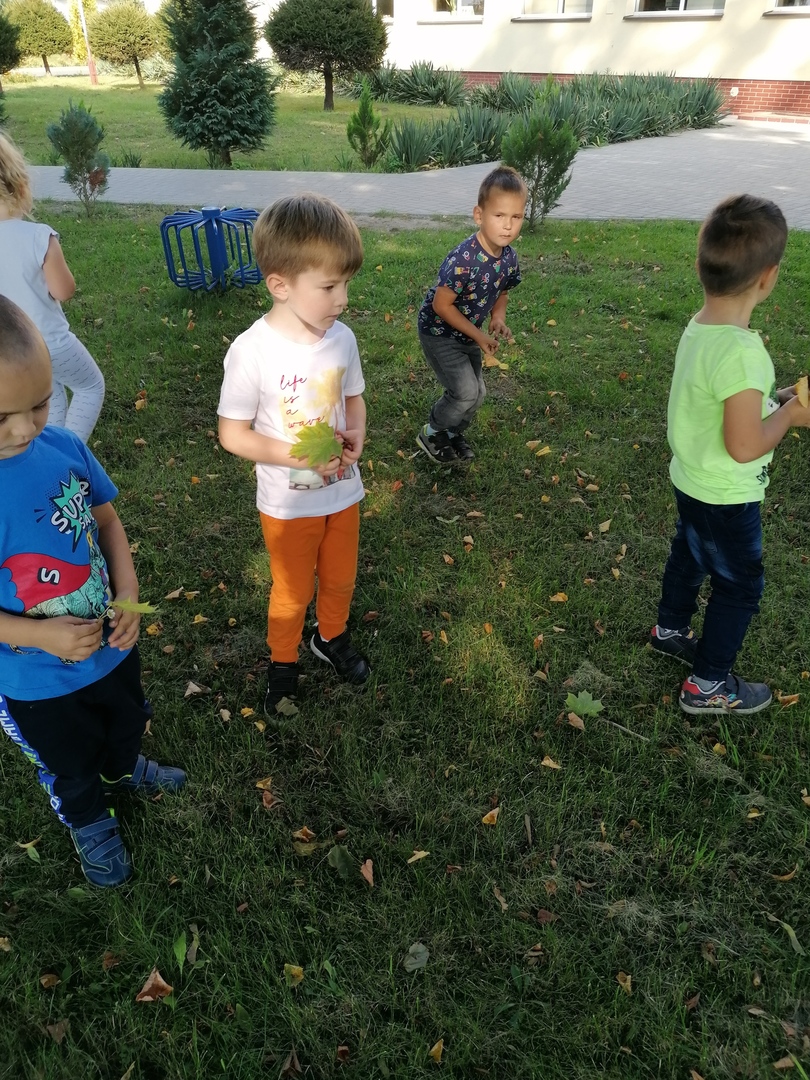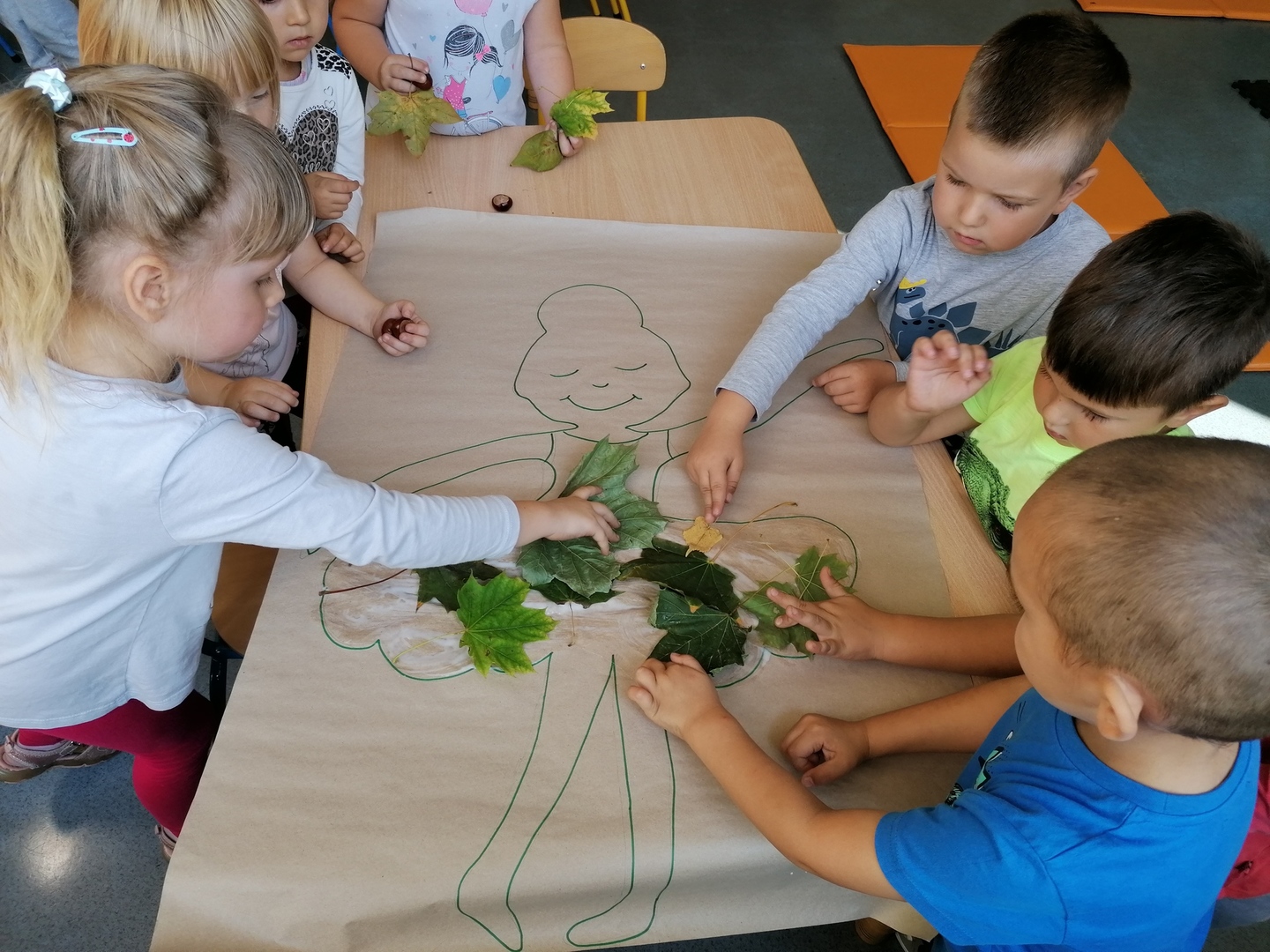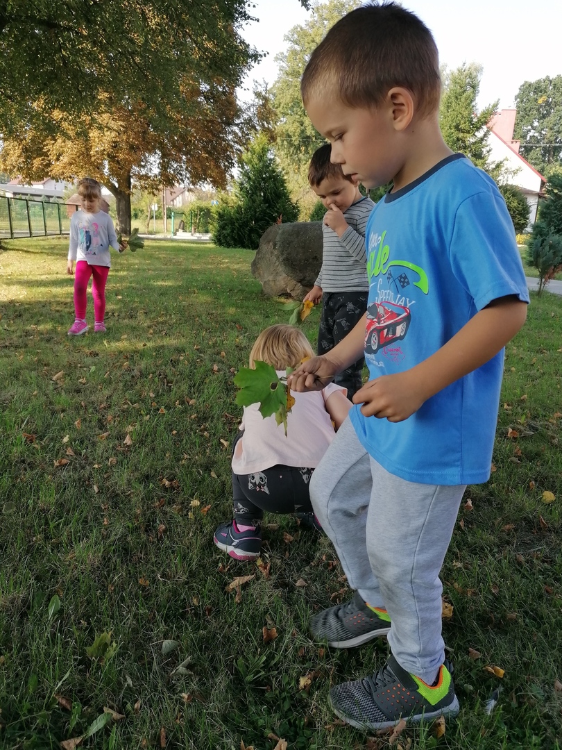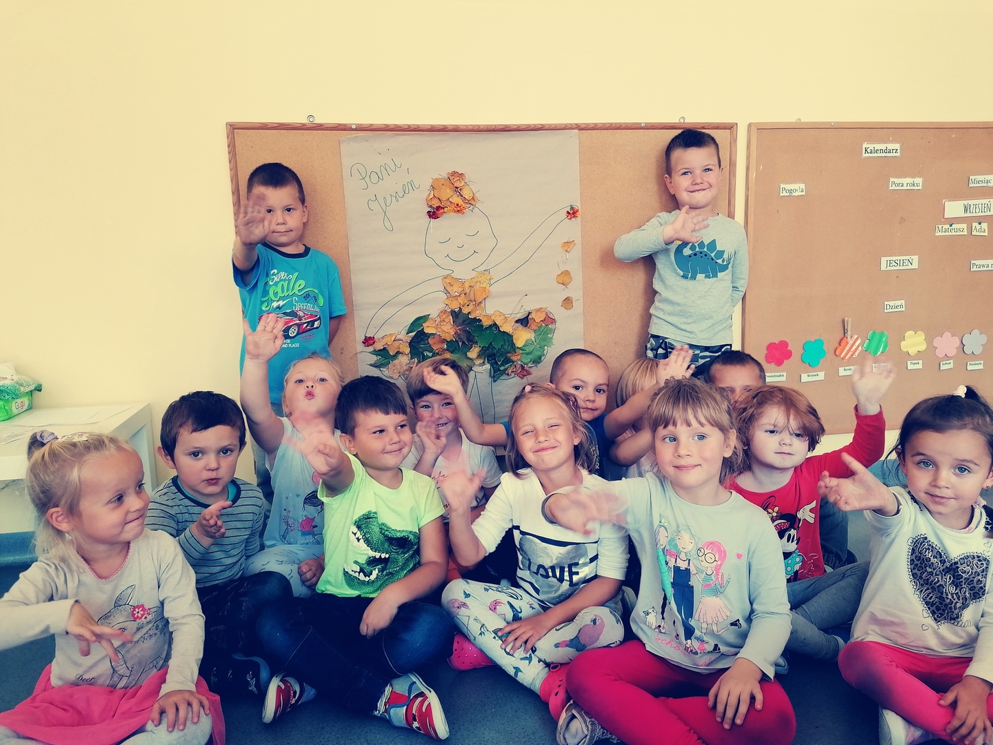 Już wszystkie przedszkolaki wiedzą że Jesień to jedna z pór roku, a zauważyć ją można w porannych mgłach przymrozkach, odlatujących ptakach i oczywiście w pięknych kolorowych liściach. Ten dzień obfitował w zabawy o tematyce jesiennej, poprzez które dzieci przyswoiły sobie wiadomości o rozpoczynającej się właśnie porze roku. Poznaliśmy kolorowe liście, porządkowaliśmy je, przeliczaliśmy zbiory, odgadywaliśmy zagadki, wykonywaliśmy jesienne tańce, nie zabrakło również zabaw ruchowych. Po wykonaniu wszystkich zadań mogliśmy wykonać „liściastą suknię Pani Jesień”.