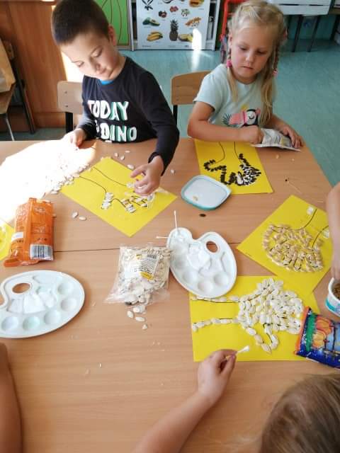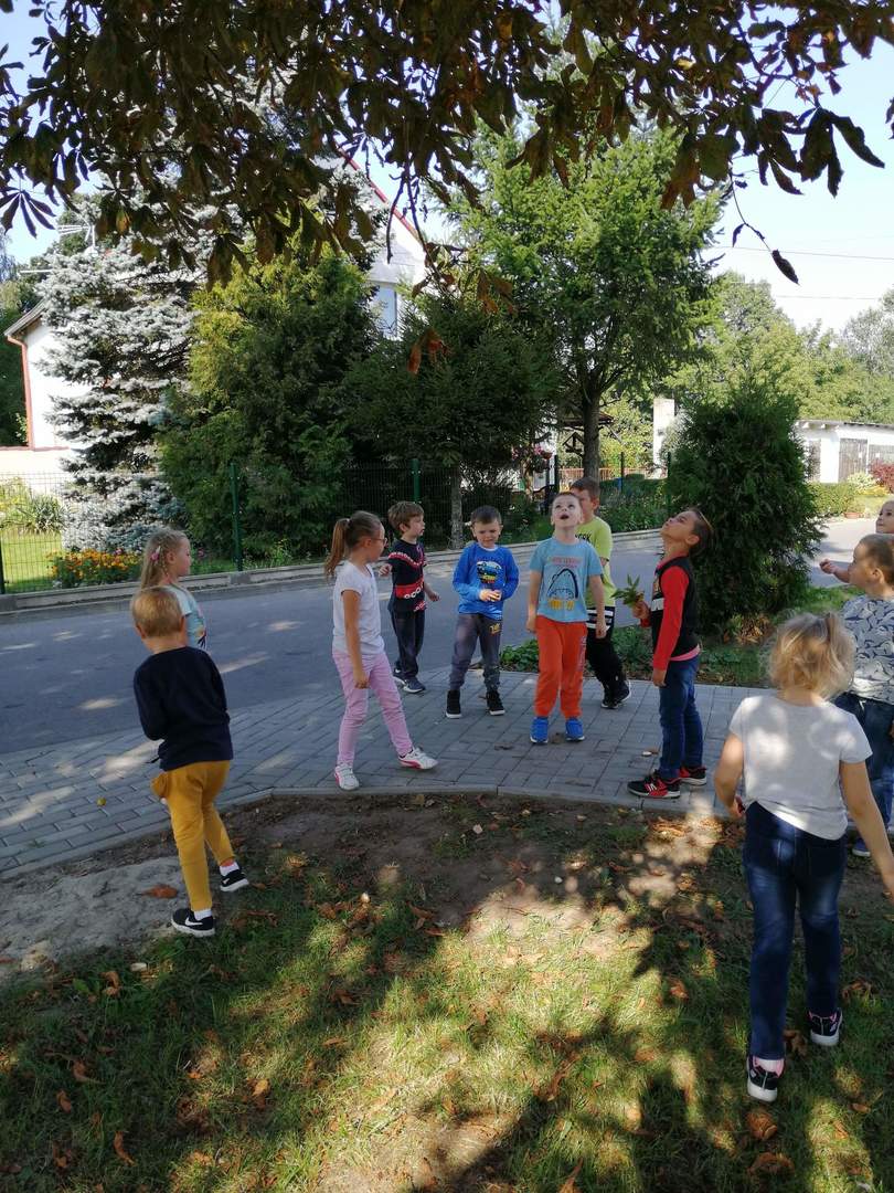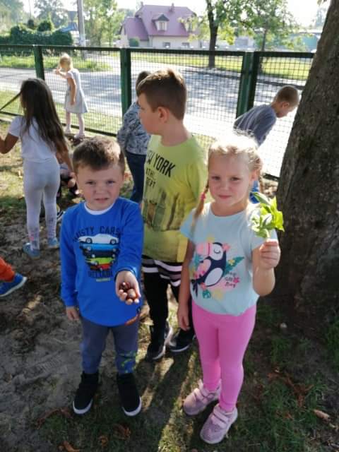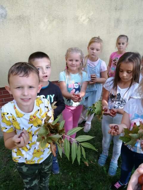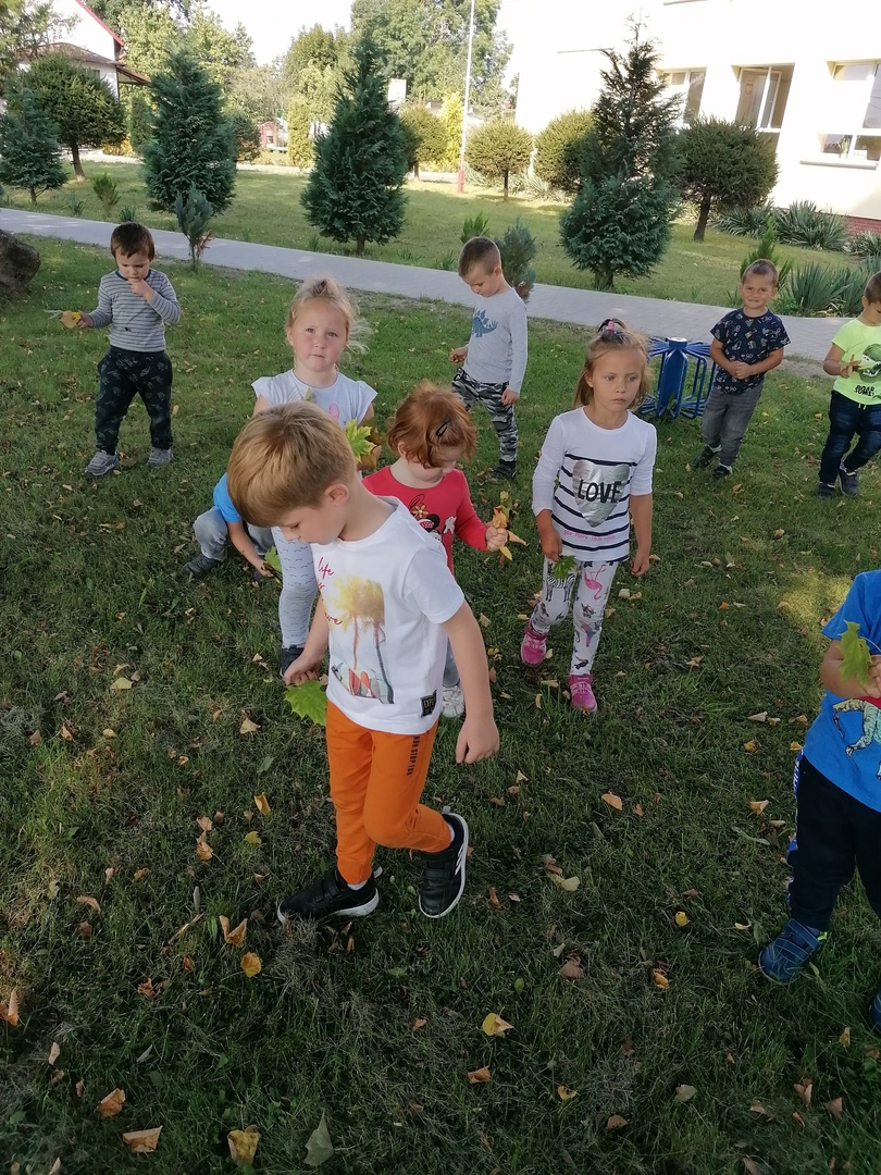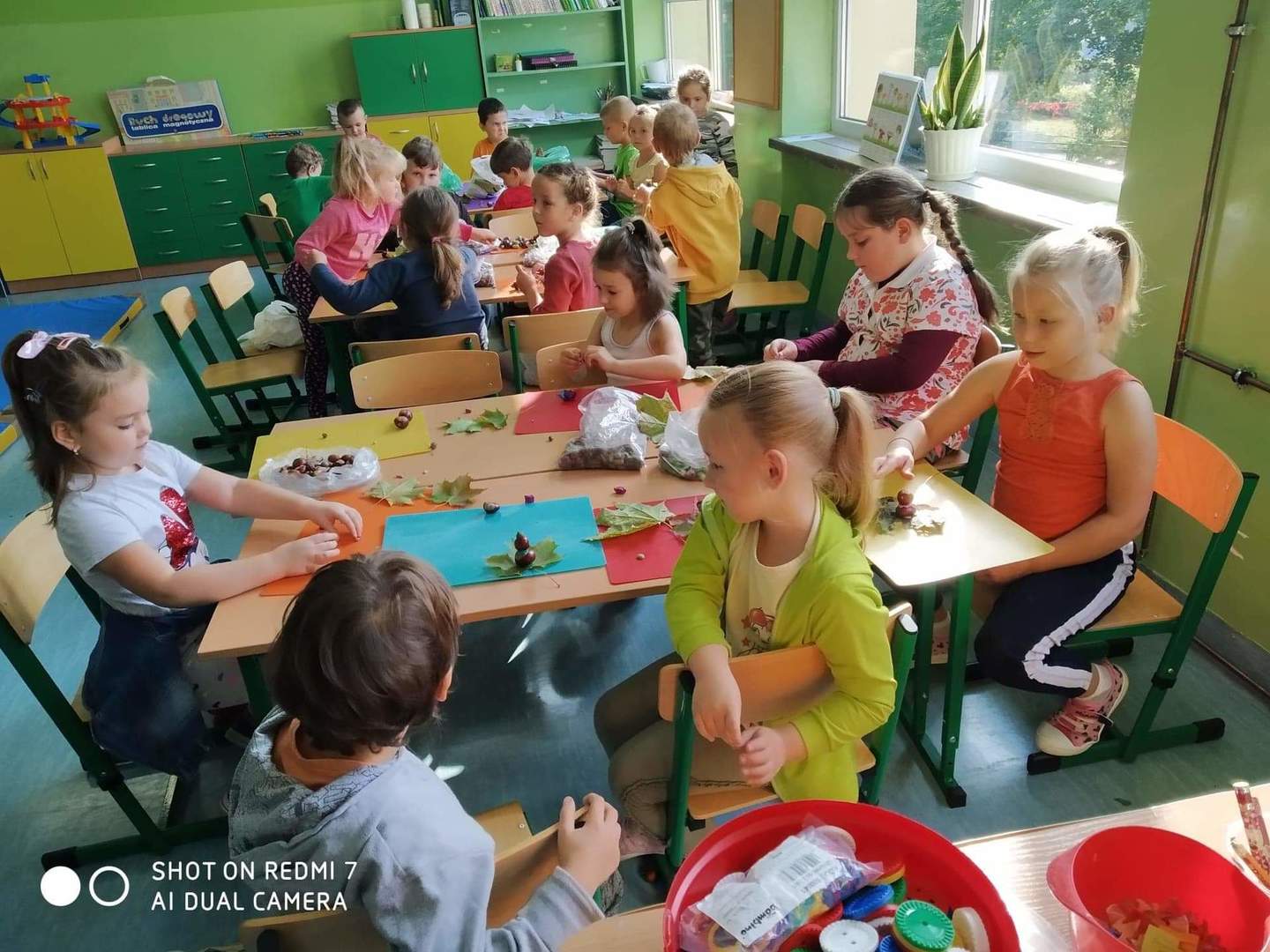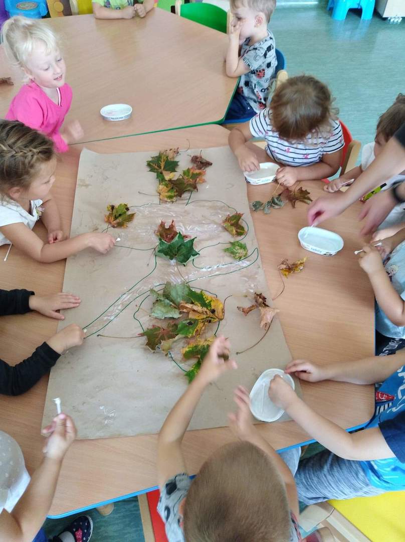 Już wszystkie przedszkolaki wiedzą że Jesień to jedna z pór roku, a zauważyć ją można w porannych mgłach przymrozkach, odlatujących ptakach i oczywiście w pięknych kolorowych liściach. Ten dzień obfitował w zabawy o tematyce jesiennej, poprzez które dzieci przyswoiły sobie wiadomości o rozpoczynającej się właśnie porze roku. Poznaliśmy kolorowe liście, porządkowaliśmy je, przeliczaliśmy zbiory, odgadywaliśmy zagadki, wykonywaliśmy jesienne tańce, nie zabrakło również zabaw ruchowych. Po wykonaniu wszystkich zadań mogliśmy wykonać „liściastą suknię Pani Jesień”.