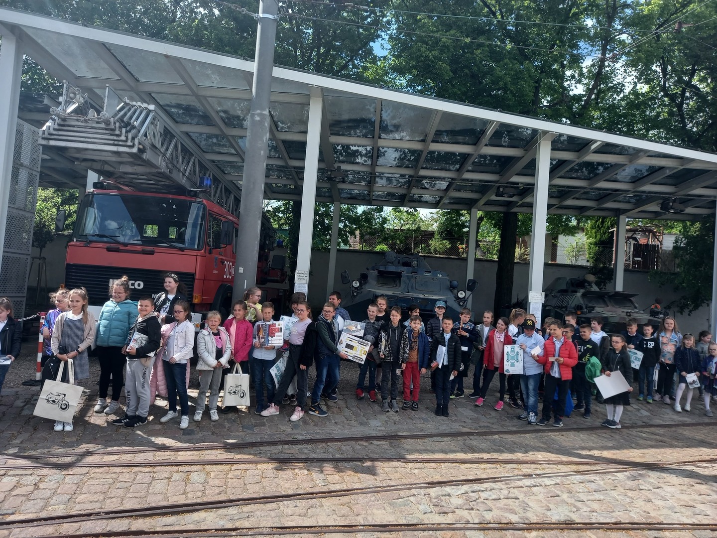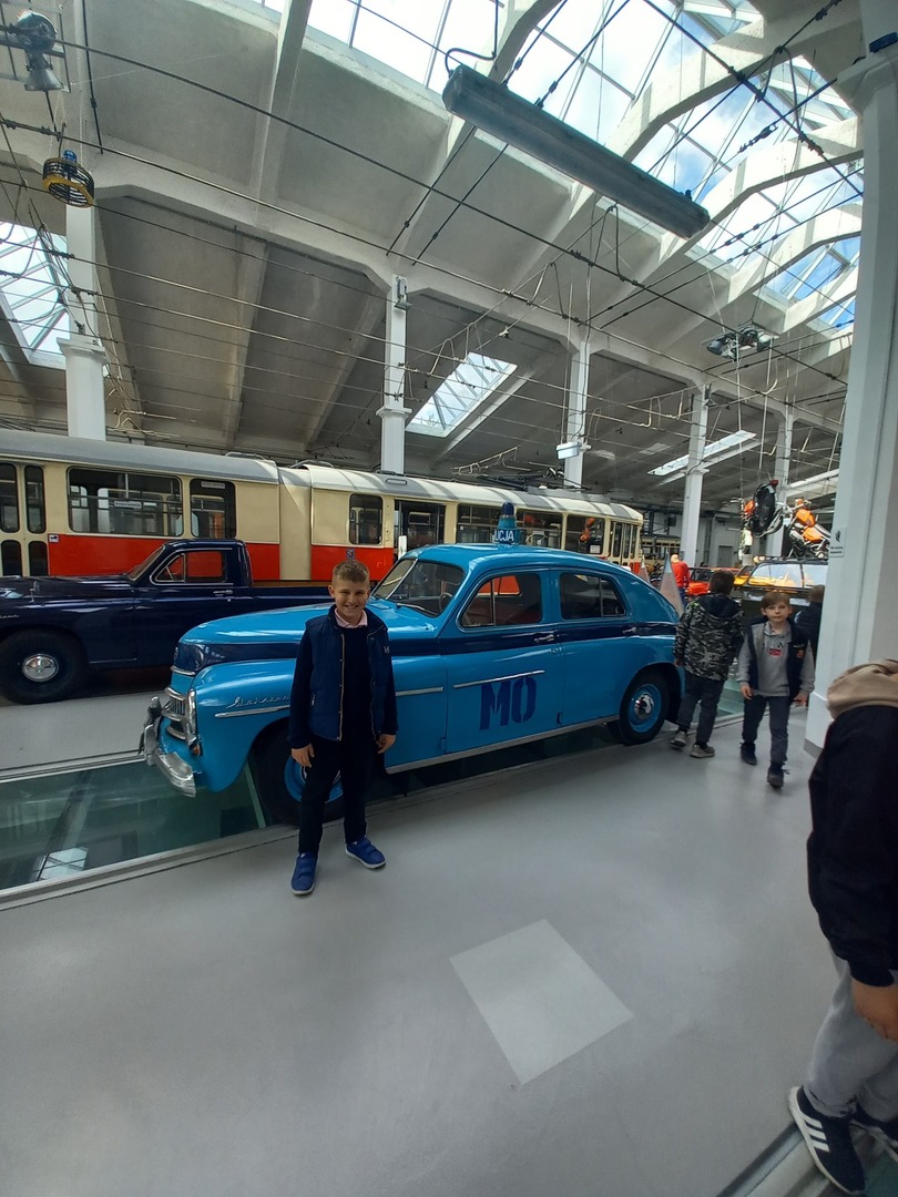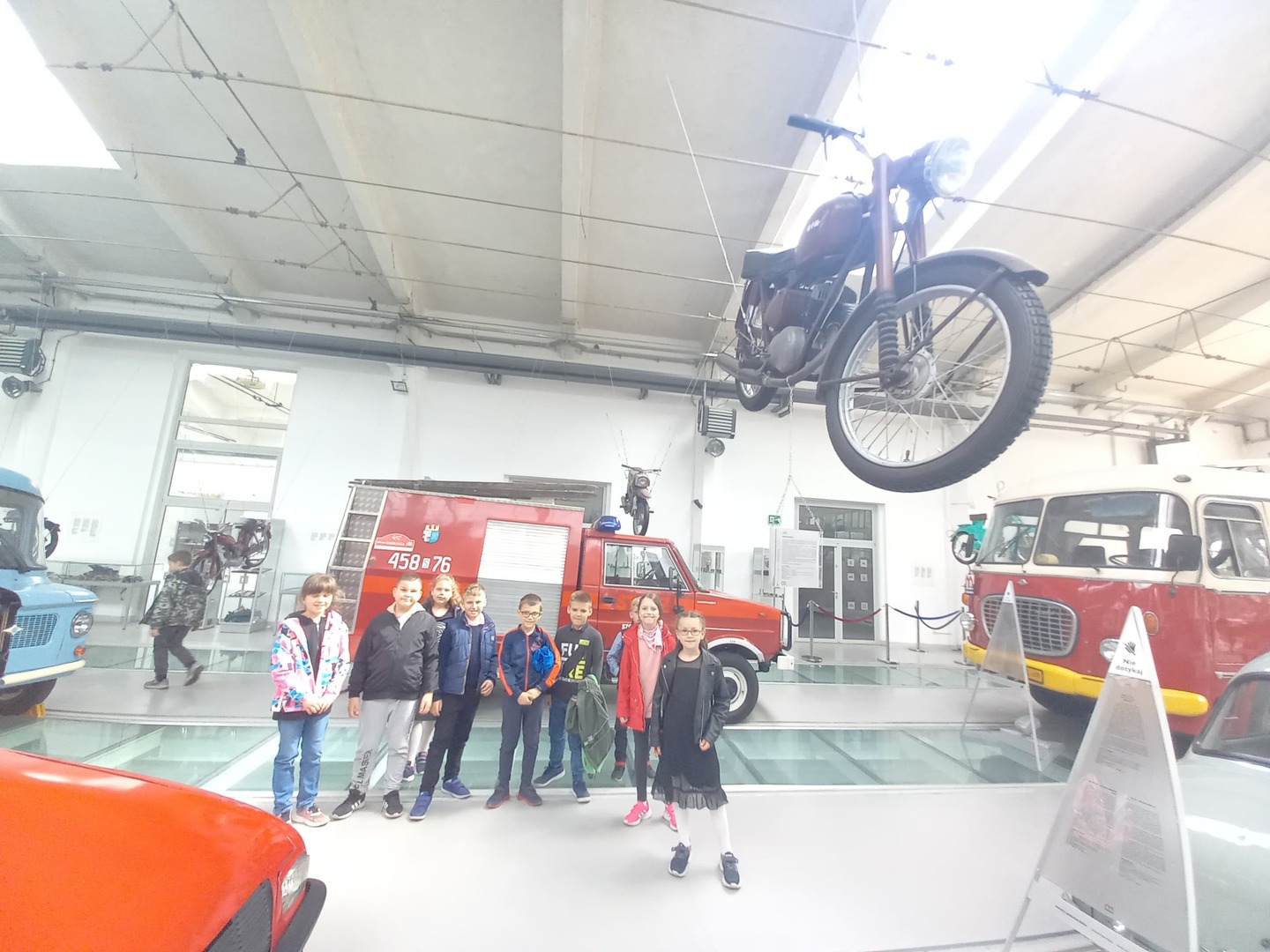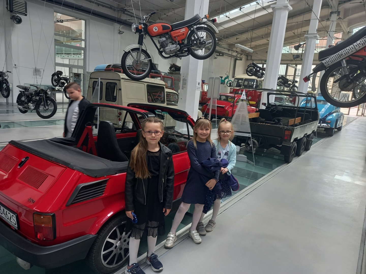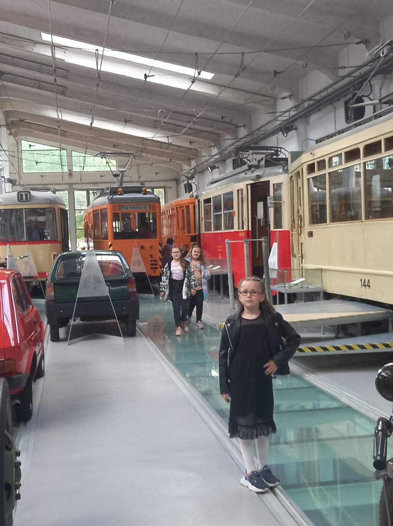 Następnie odwiedziliśmy Muzeum Techniki i Komunikacji w Szczecinie. Dzieci mogły zobaczyć zarówno pojazdy przedwojenne, jak i powojenne (zabytkowe tramwaje, jednoślady, samochody osobowe), oraz usłyszeć pracę silników ówczesnych pojazdów i usiąść w symulatorze tramwaju z wizualizacją rzeczywistego Szczecina. Uczniowie byli zachwyceni eksponatami znajdującymi się w Muzeum, szczególną uwagą obdarzyły samochody o ponad stuletniej historii oraz motocykle i tramwaje. Dowiedziały się kto to jest motorniczy. Z dużym zaciekawieniem oglądały również stare maszyny do pisania, do szycia, jak również radioodbiorniki i telewizory z dziewiętnastego wieku.Motoryzacyjna wycieczka okazała się wspaniałą lekcją historii.