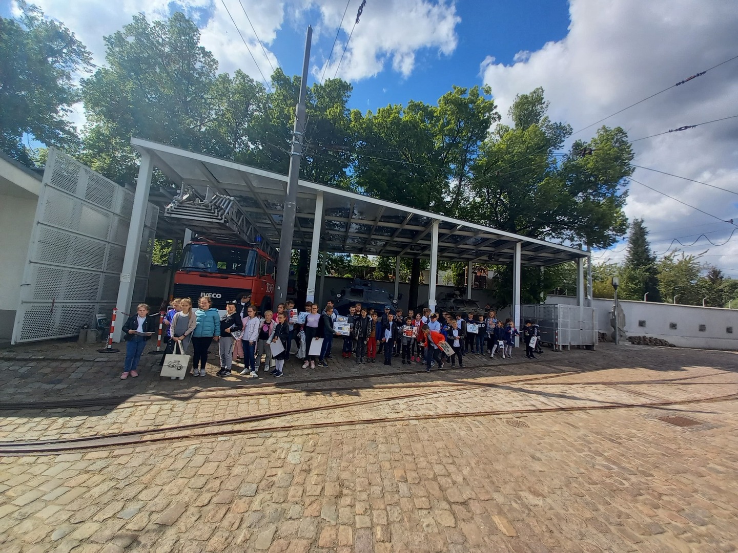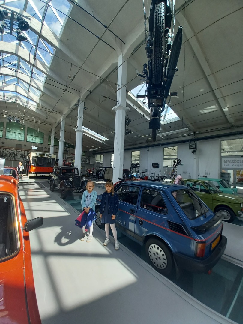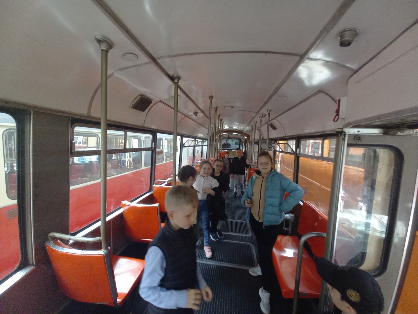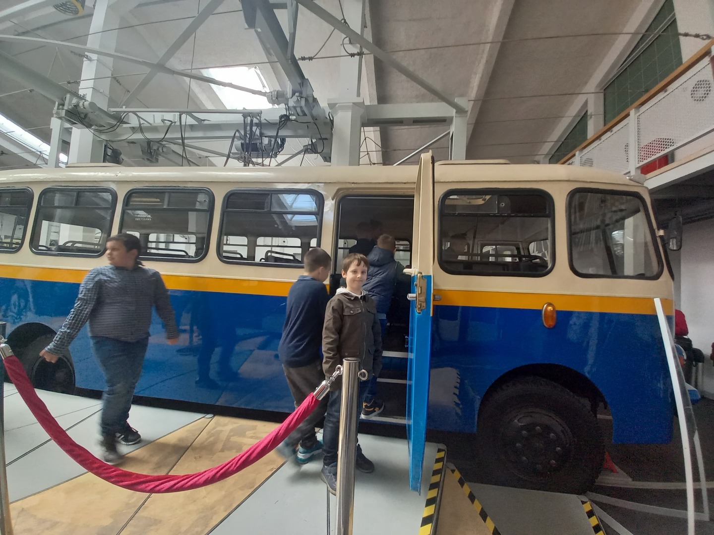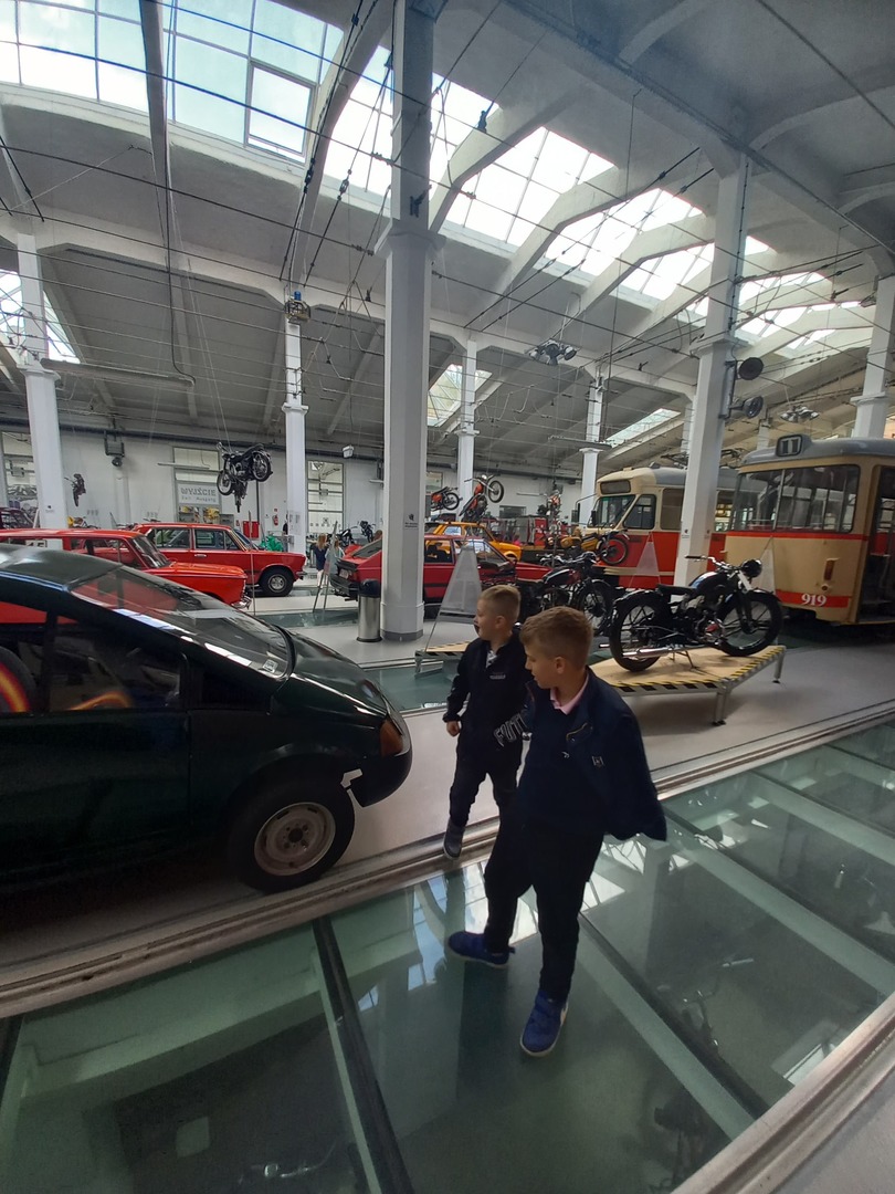 Następnie odwiedziliśmy Muzeum Techniki i Komunikacji w Szczecinie. Dzieci mogły zobaczyć zarówno pojazdy przedwojenne, jak i powojenne (zabytkowe tramwaje, jednoślady, samochody osobowe), oraz usłyszeć pracę silników ówczesnych pojazdów i usiąść w symulatorze tramwaju z wizualizacją rzeczywistego Szczecina. Uczniowie byli zachwyceni eksponatami znajdującymi się w Muzeum, szczególną uwagą obdarzyły samochody o ponad stuletniej historii oraz motocykle i tramwaje. Dowiedziały się kto to jest motorniczy. Z dużym zaciekawieniem oglądały również stare maszyny do pisania, do szycia, jak również radioodbiorniki i telewizory z dziewiętnastego wieku.Motoryzacyjna wycieczka okazała się wspaniałą lekcją historii.