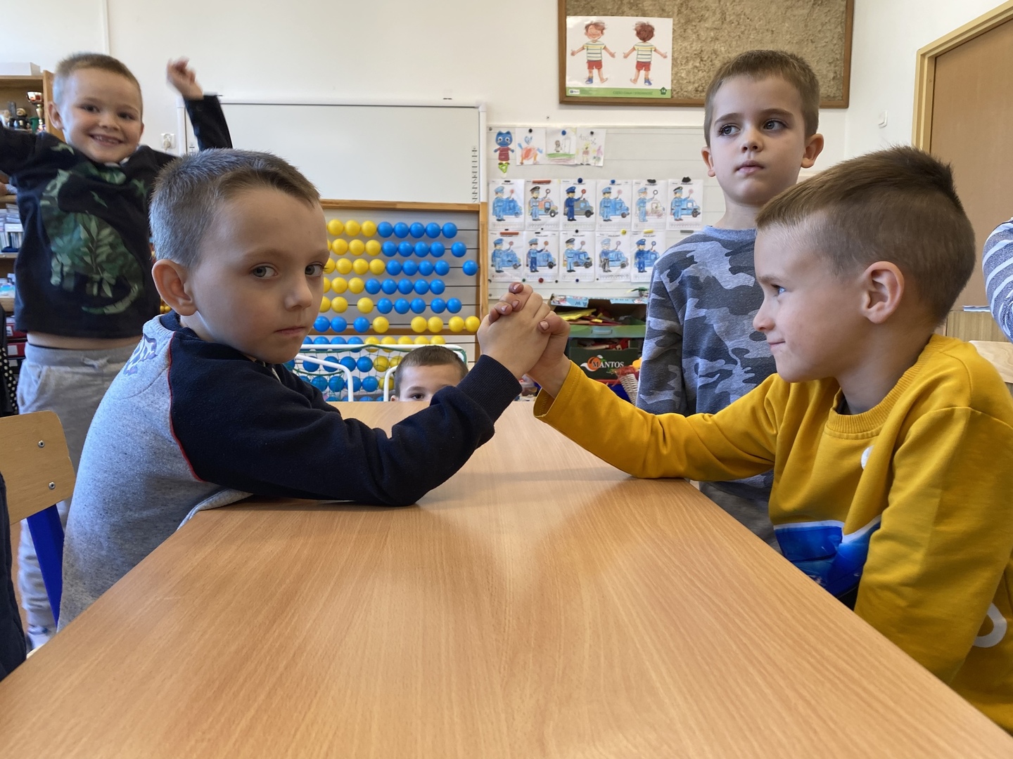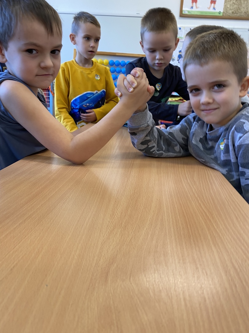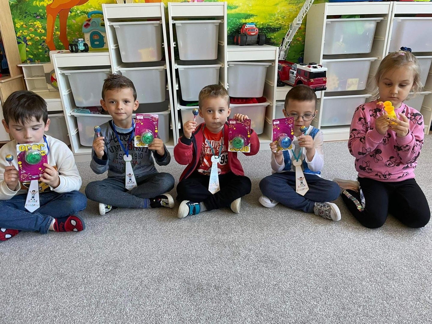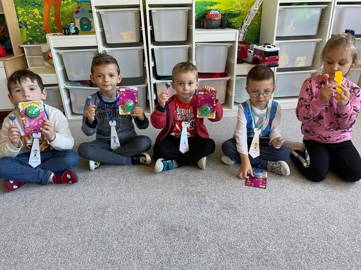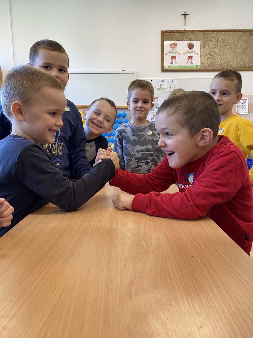 Dzień już od rana rozpoczął się nietypowo, bo od wspólnie oglądanej przez wszystkie grupy bajki. Później były życzenia od koleżanek, gromkie sto lat, wręczanie drobnych upominków przygotowanych przez rodziców i pamiątkowych dyplomów. W czasie zajęć też było trochę inaczej niż zwykle. Niektórzy zostali Supermenami, inni mogli pozować do portretu wykonywanego przez koleżankę lub sami się sportretować. Część chłopców miała okazję poćwiczyć strzały na bramkę i popróbować sił podczas siłowania się na rękę.