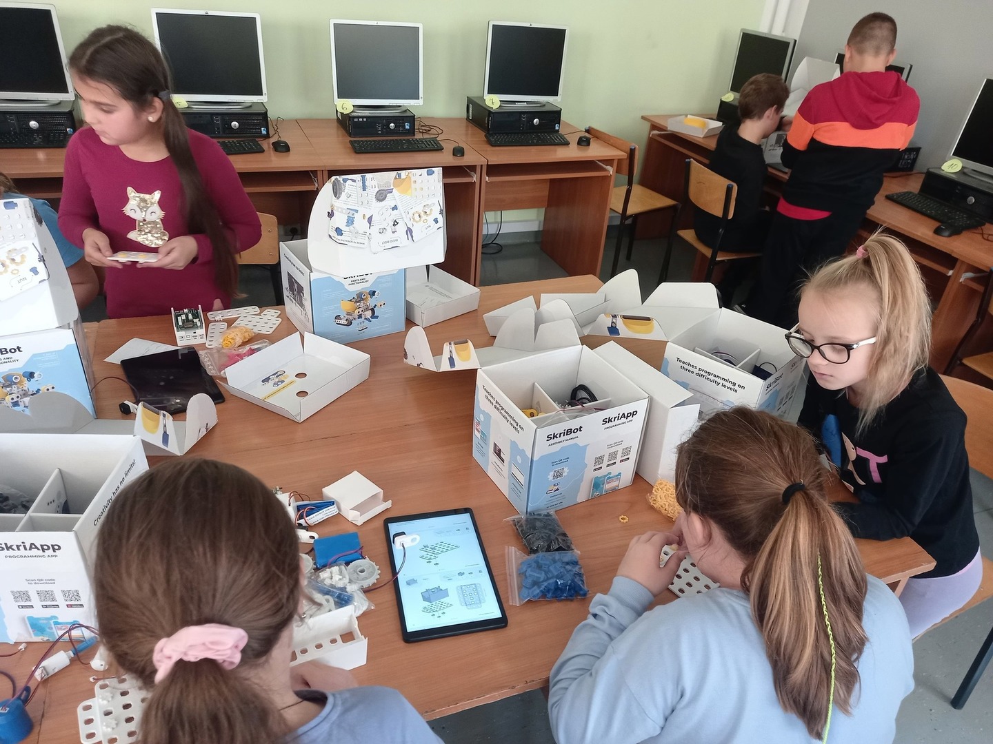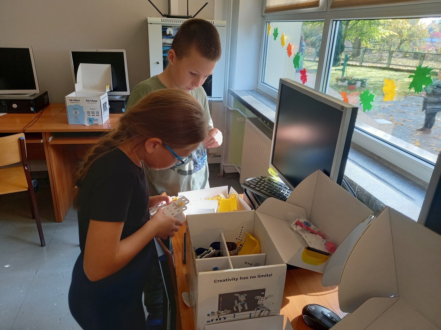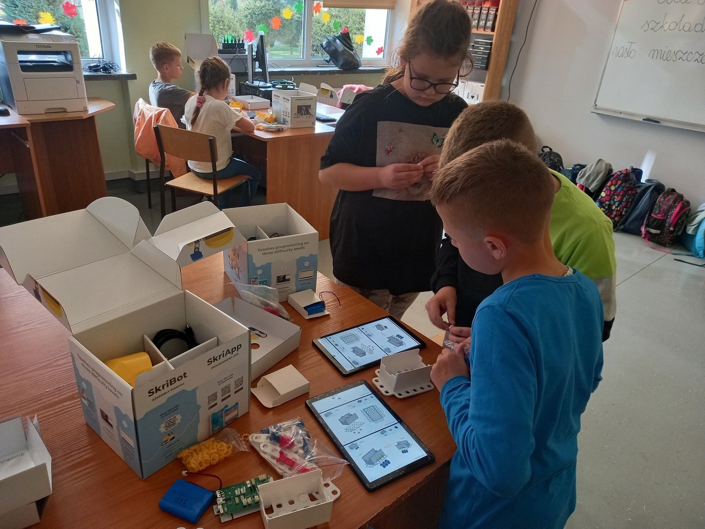 Uczniowie klasy 3a podczas zajęć edukacji informatycznej rozpoczęli swoją przygodę ze SkriBotem, zestawem zakupionym w ramach programu Laboratoria Przyszłości.