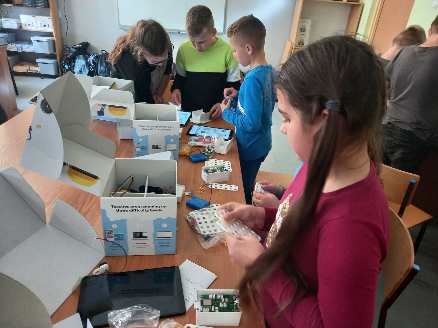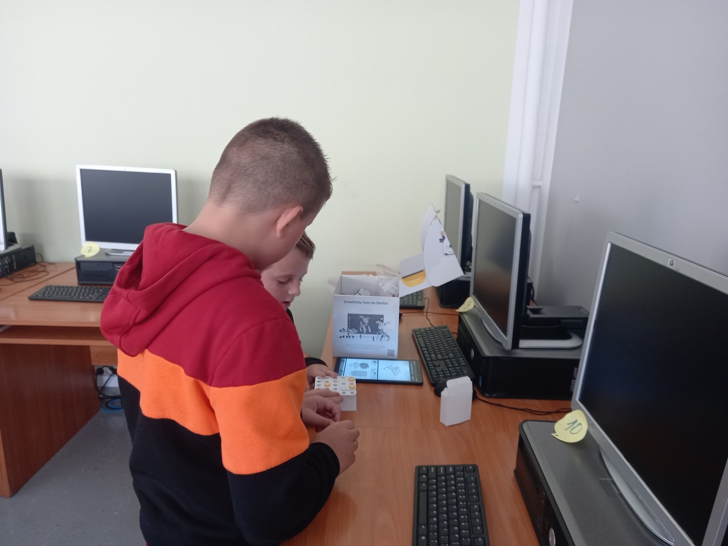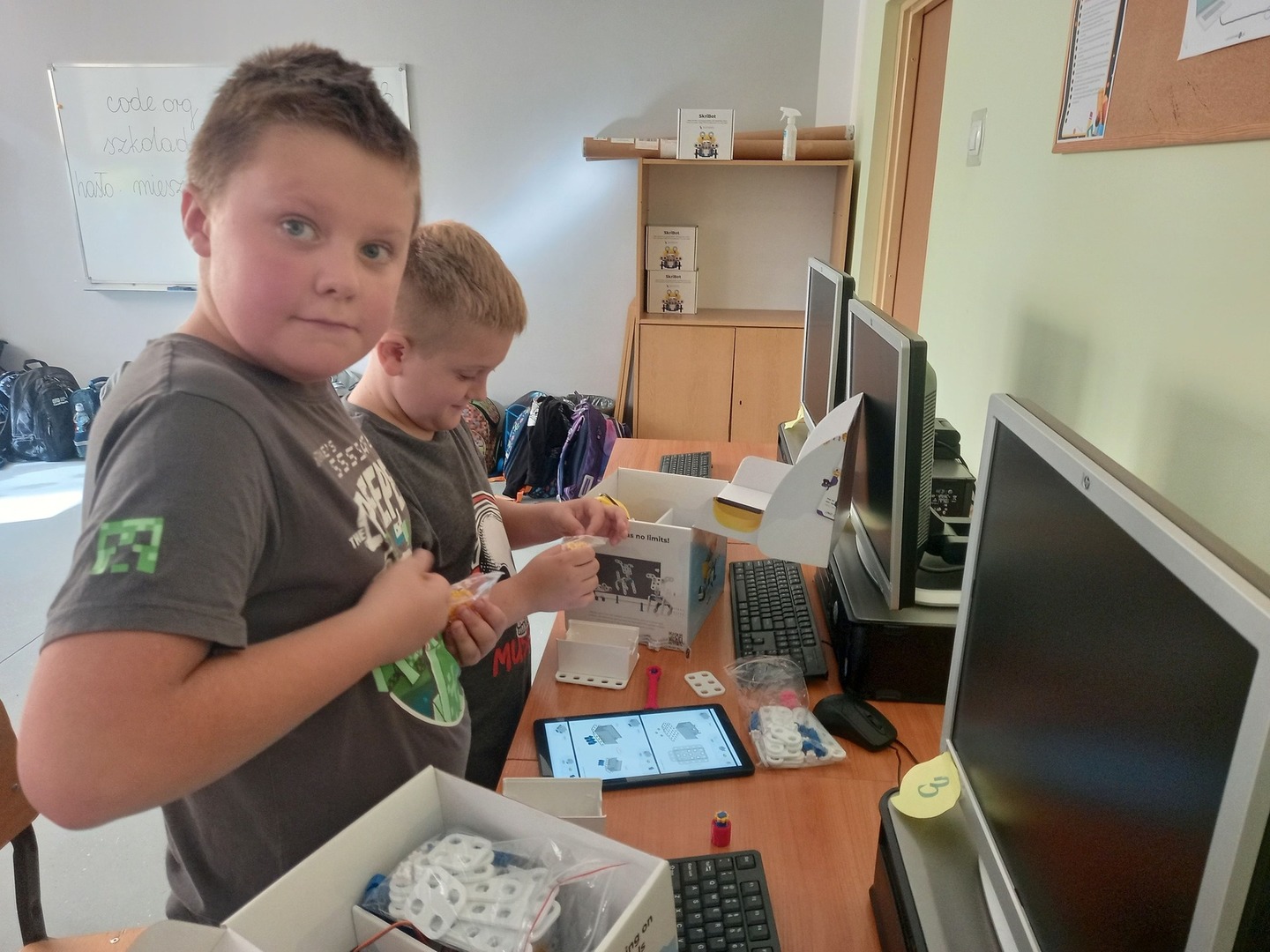 Uczniowie klasy 3a podczas zajęć edukacji informatycznej rozpoczęli swoją przygodę ze SkriBotem, zestawem zakupionym w ramach programu Laboratoria Przyszłości.