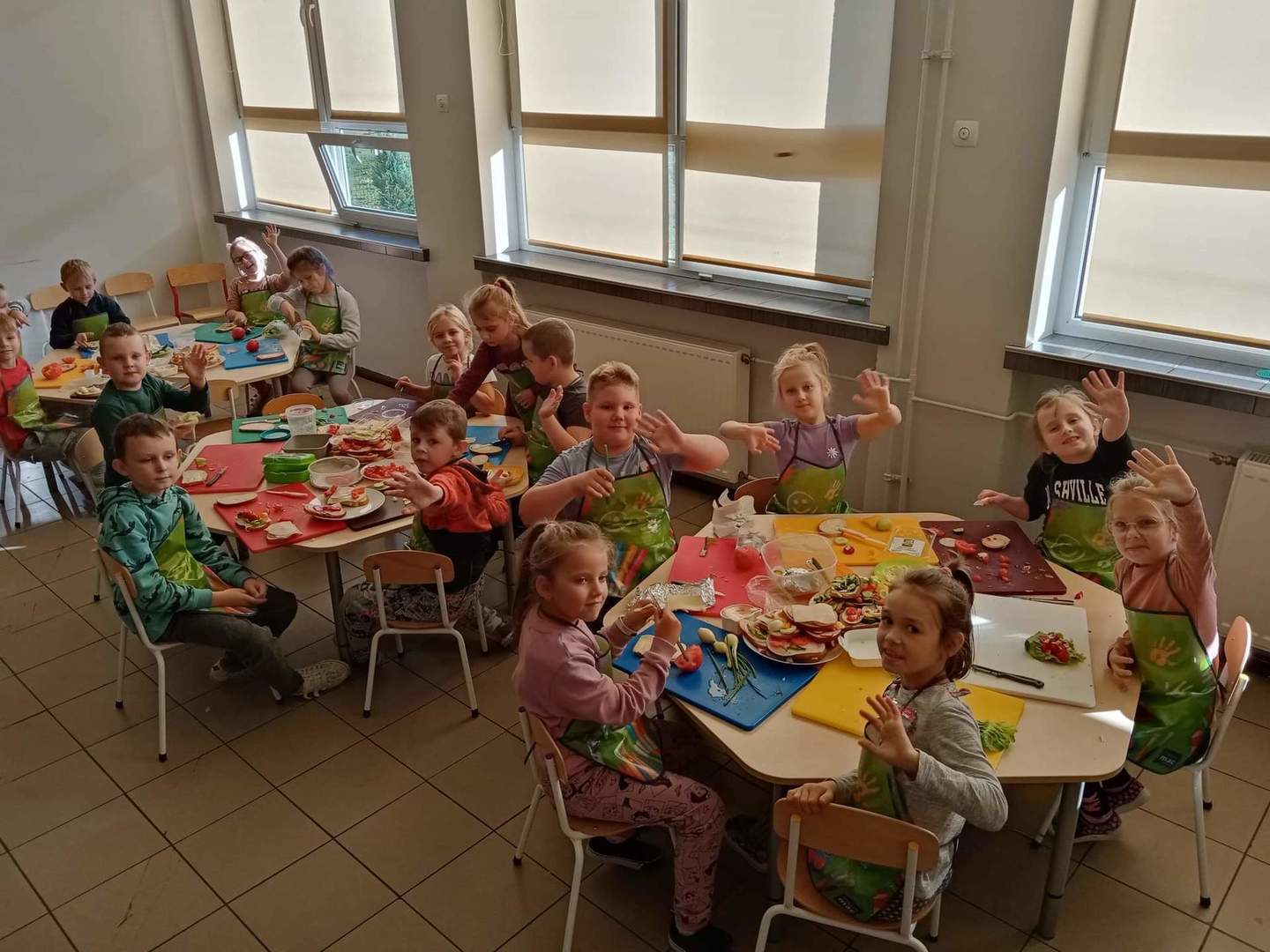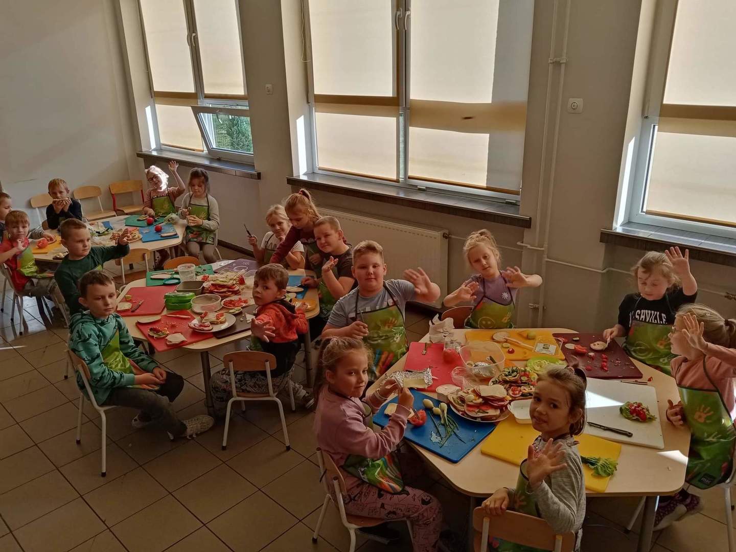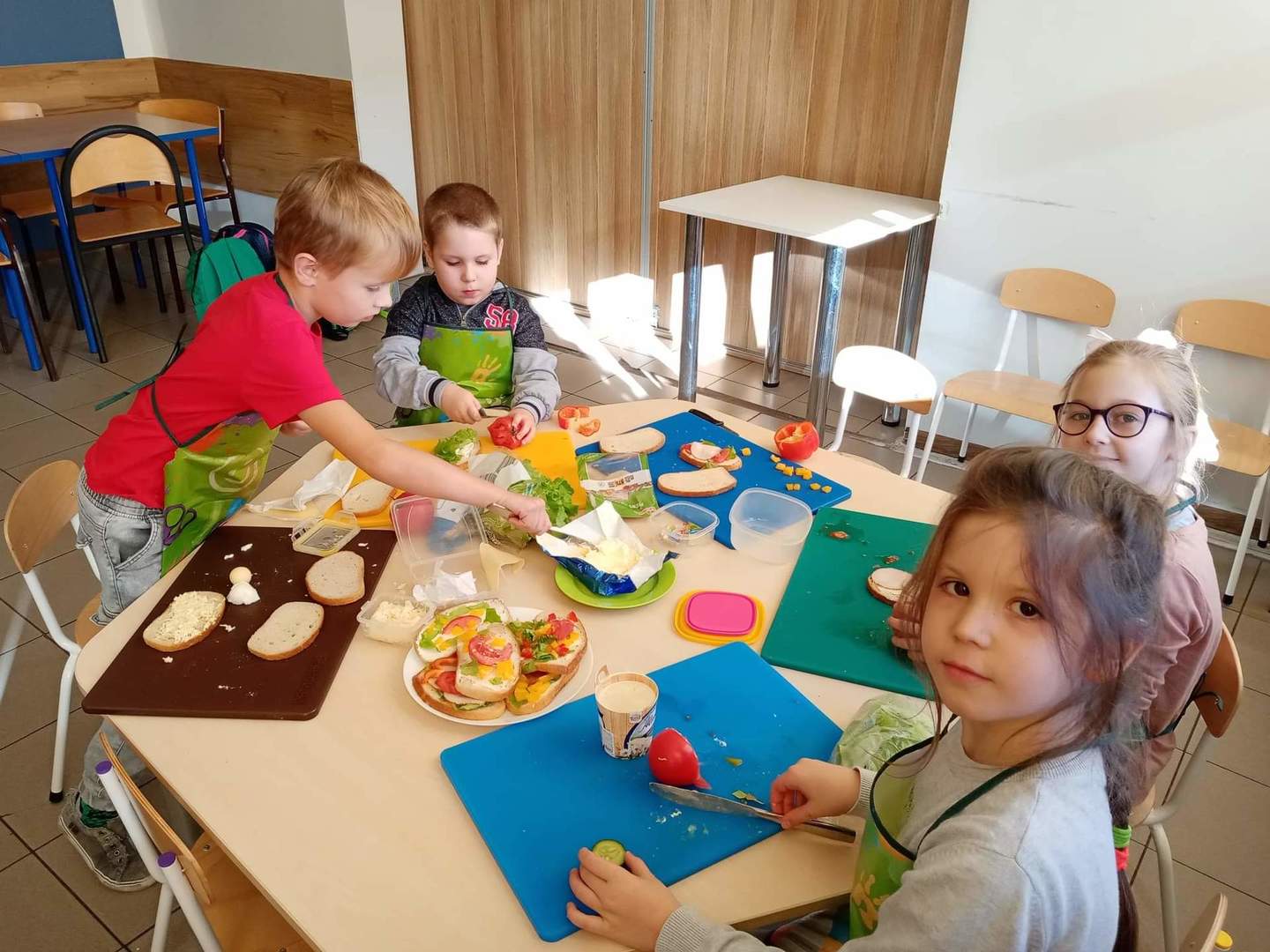 Dzisiaj podjęliśmy wyzwanie - samodzielne wykonanie smacznych i zdrowych kanapek, na których znalazły się dary jesieni z naszych ogrodów, m. in. kolorowe papryki, rzodkiewki, pomidory, ogórki, szczypiorek.