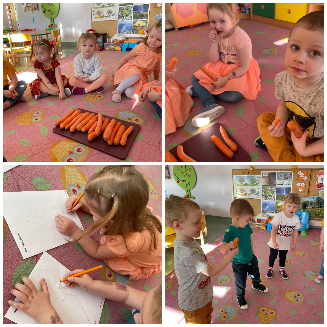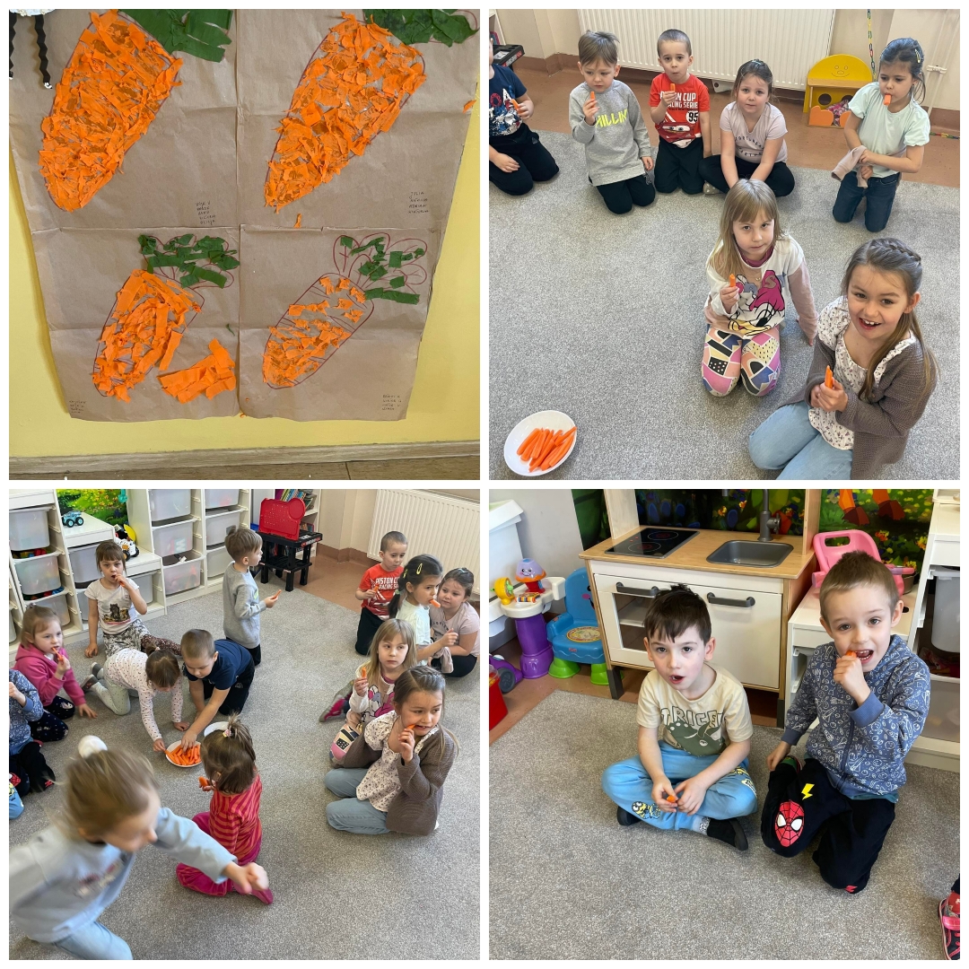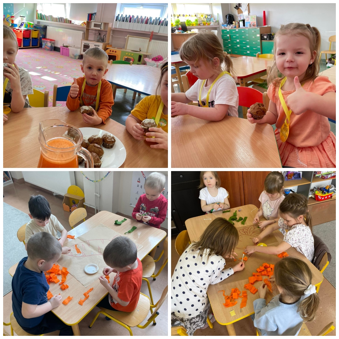 Biedronki🐞, Jagódki🫐 i Pszczółki 🐝 poszerzyły wiedze na temat marchwi i jej odmian, a także doskonaliły umiejętności pracy w grupie. Dzieci brały udział w zabawach muzycznych, ruchowych, plastycznych. Odgadywały zagadki o warzywach, rozpoznawały marchewkę wśród innych warzyw, układały w całość pocięte obrazki z marchewką. Było robienie soku marchewkowego i chrupanie surowej marchewki oraz pieczenie babeczek z marchewką. Śmiechu i zabawy było co niemiara - ale o to właśnie chodziło, żeby ten dzień był wyjątkowy inny od wszystkich - marchewkowy - zakręcony. Po takiej dawce witamin, śmiechu i zabawy na pewno wszystkie przedszkolaki będą zdrowe, piękne i uśmiechnięte.