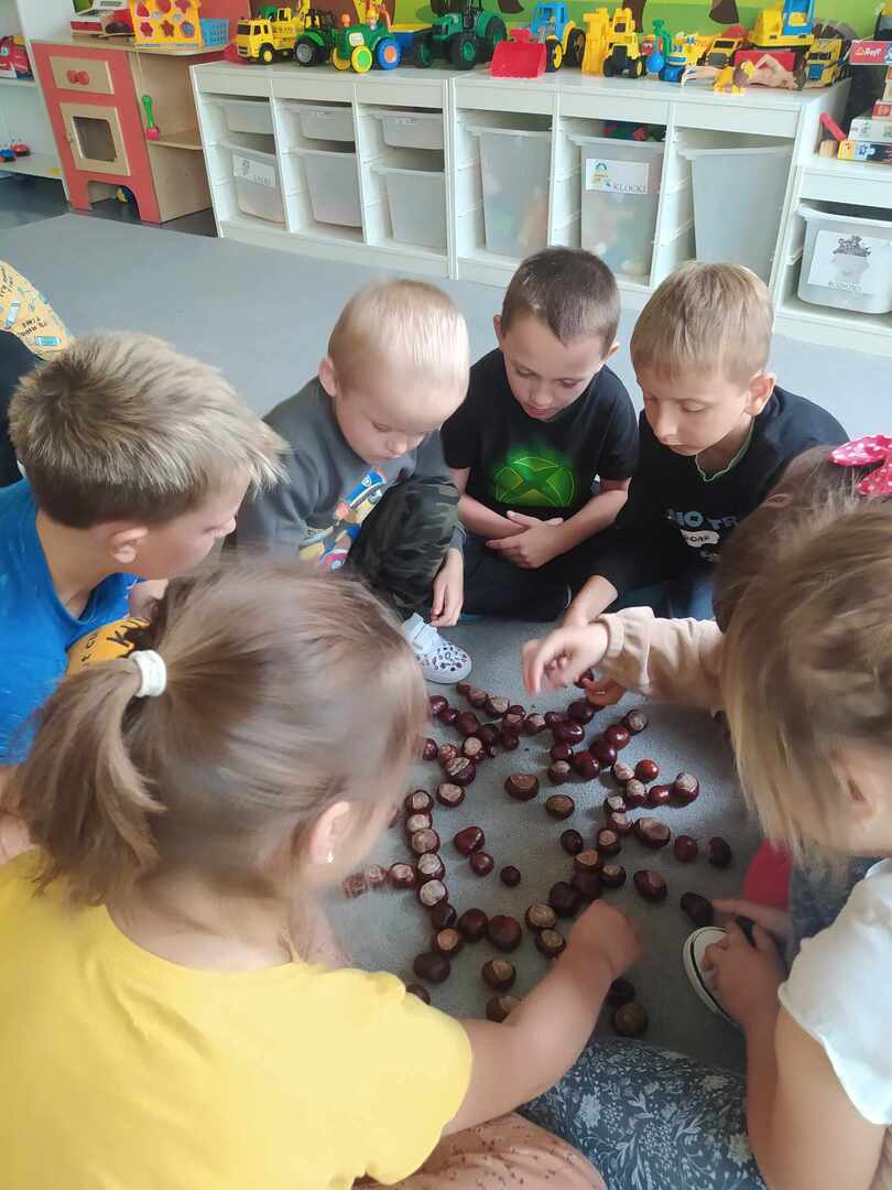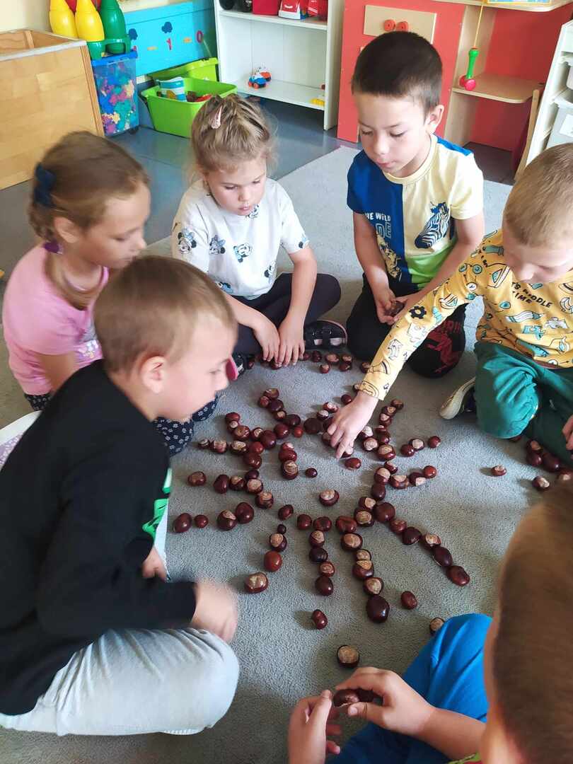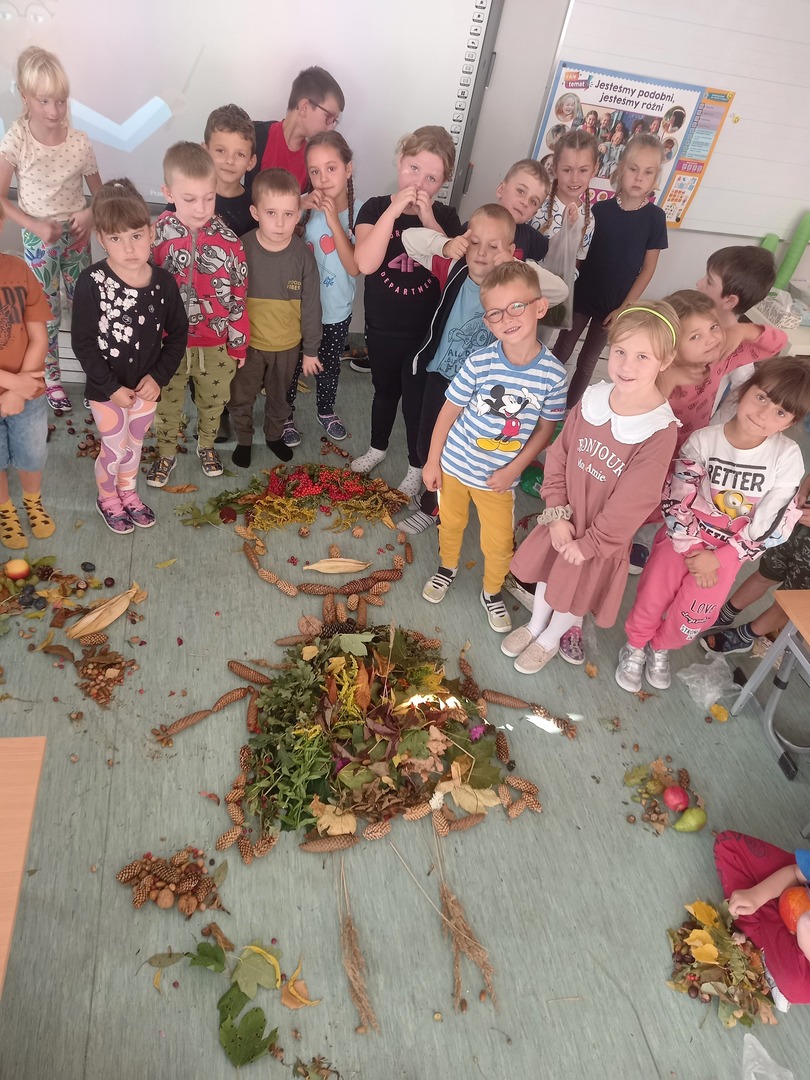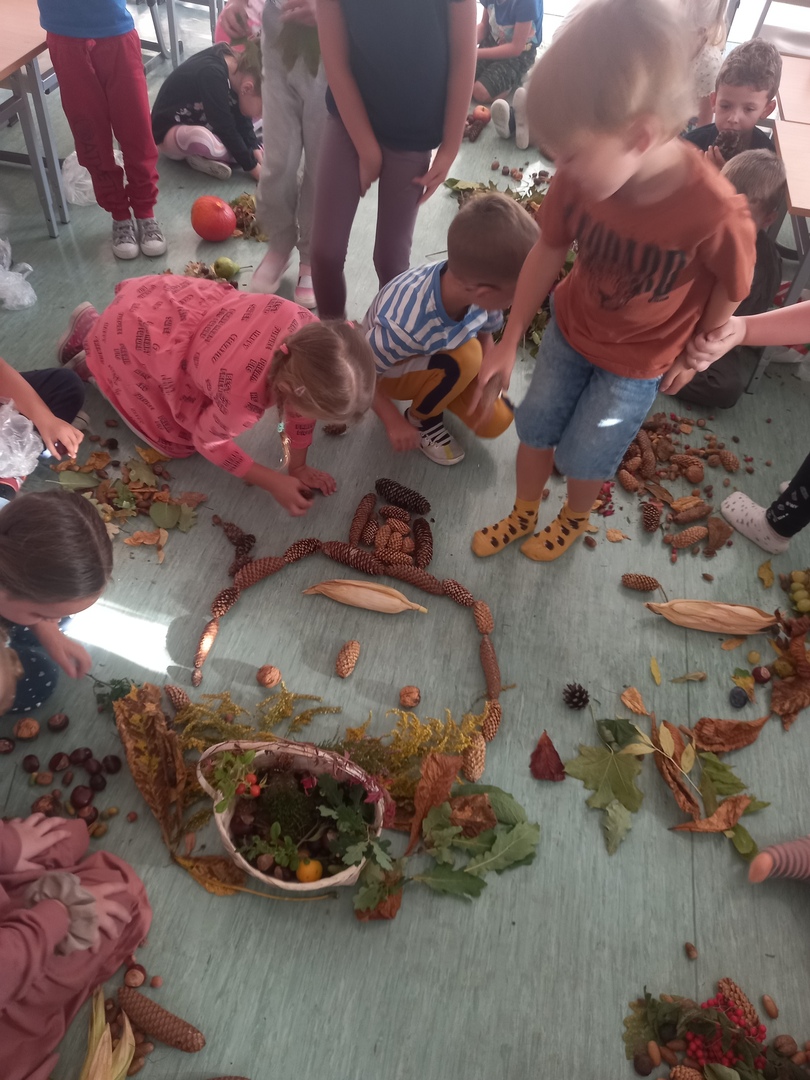 22 września dzieci z oddziałów przedszkolnych powitały najbardziej kolorową ze wszystkich pór roku- jesień. Tego dnia przedszkolaki udały się do parku, w celu poszukiwania oznak jesieni. W salach przedszkolnych powstały kąciki jesienne, w których zgromadzone zostały dary jesieni, przyniesione przed dzieci. Z kolorowych liści, kasztanów i żołędzi przedszkolaki stworzyły piękne korony oraz panią jesień. W tym dniu ochoczo rozwiązywali jesienne zagadki oraz brali udział w zabawach matematycznych z wykorzystaniem kasztanów. Nie zabrakło również kolorowych prac plastycznych. Wspólna praca twórcza przyniosła dzieciom wiele radości.