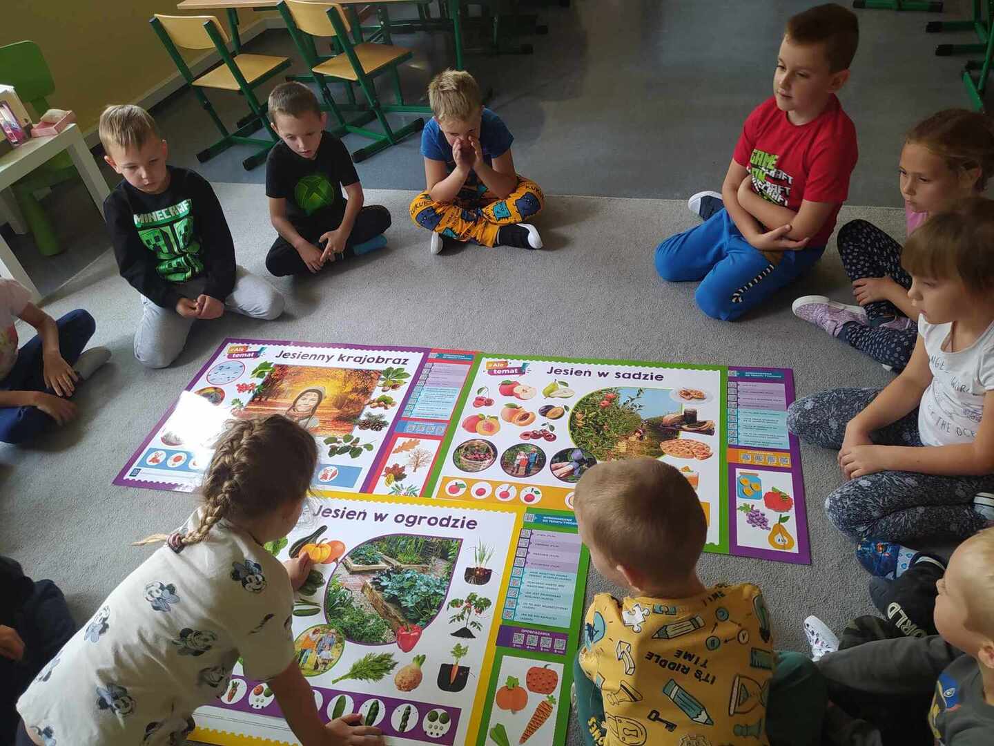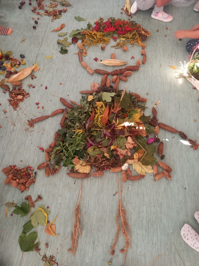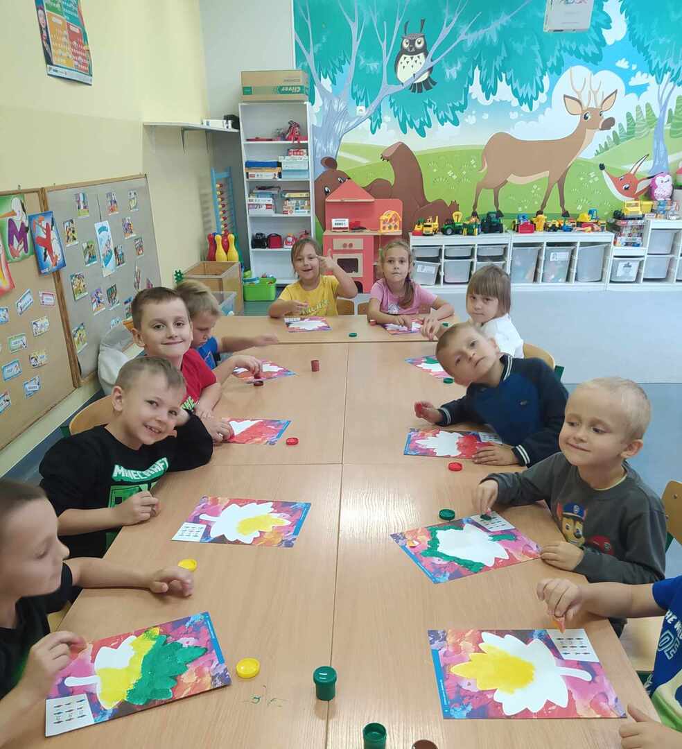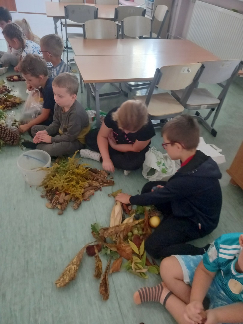 22 września dzieci z oddziałów przedszkolnych powitały najbardziej kolorową ze wszystkich pór roku- jesień. Tego dnia przedszkolaki udały się do parku, w celu poszukiwania oznak jesieni. W salach przedszkolnych powstały kąciki jesienne, w których zgromadzone zostały dary jesieni, przyniesione przed dzieci. Z kolorowych liści, kasztanów i żołędzi przedszkolaki stworzyły piękne korony oraz panią jesień. W tym dniu ochoczo rozwiązywali jesienne zagadki oraz brali udział w zabawach matematycznych z wykorzystaniem kasztanów. Nie zabrakło również kolorowych prac plastycznych. Wspólna praca twórcza przyniosła dzieciom wiele radości.