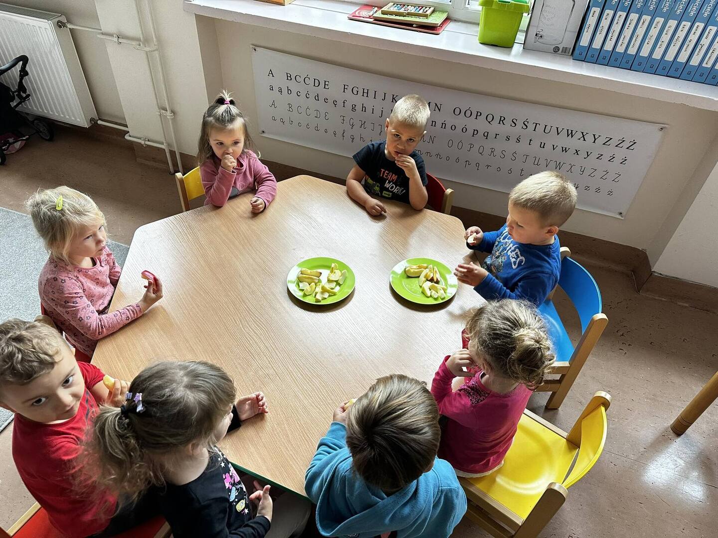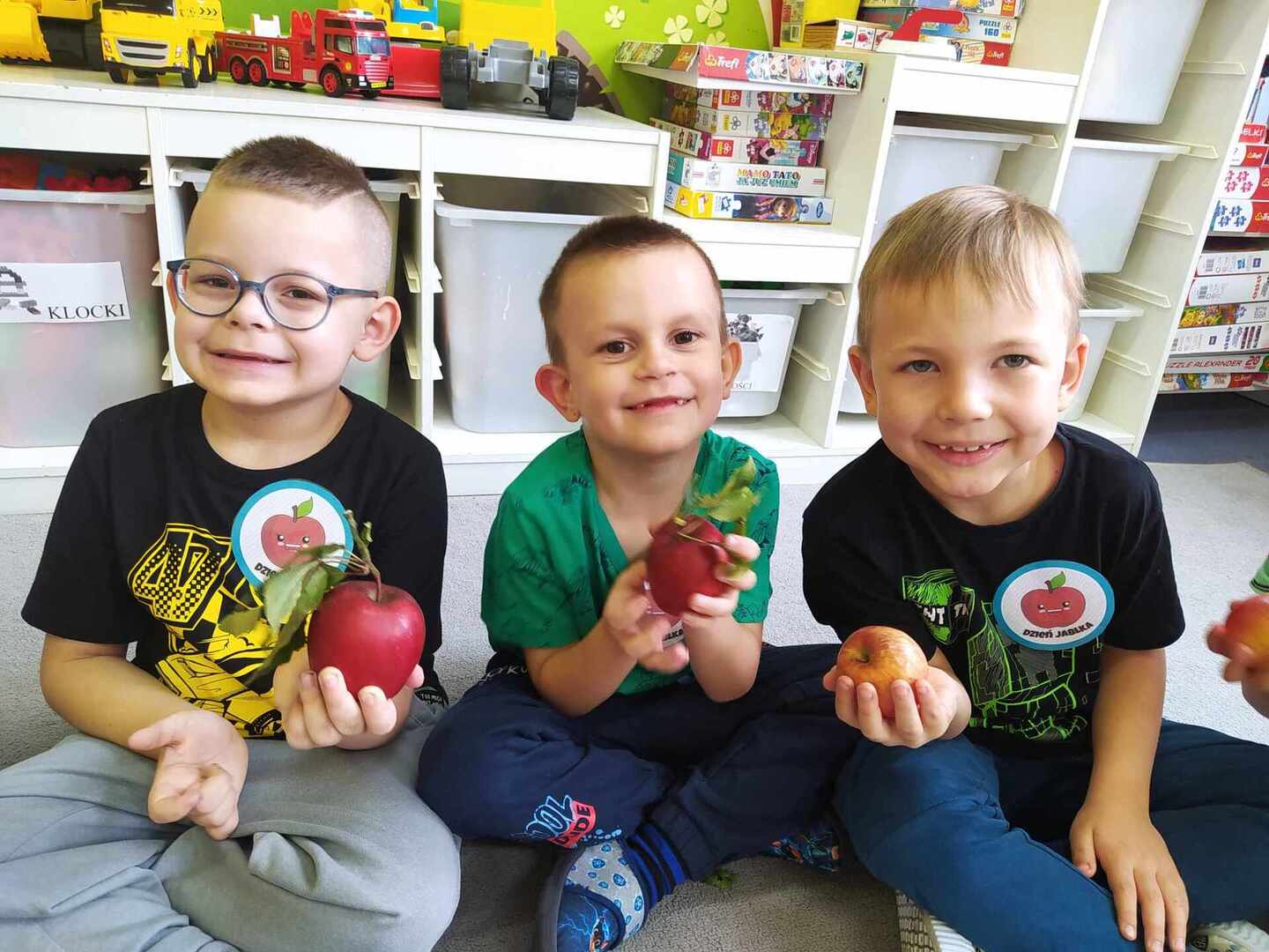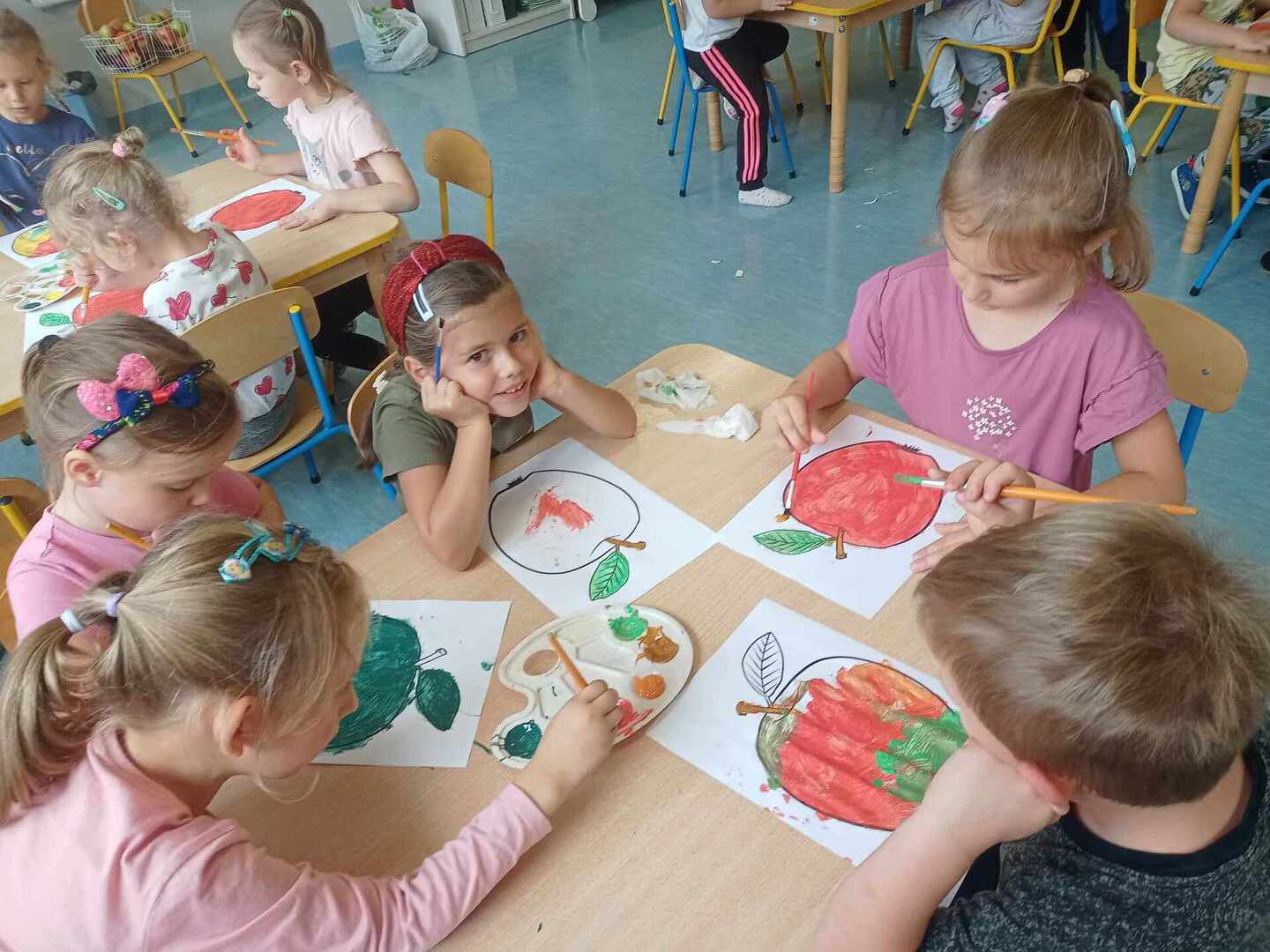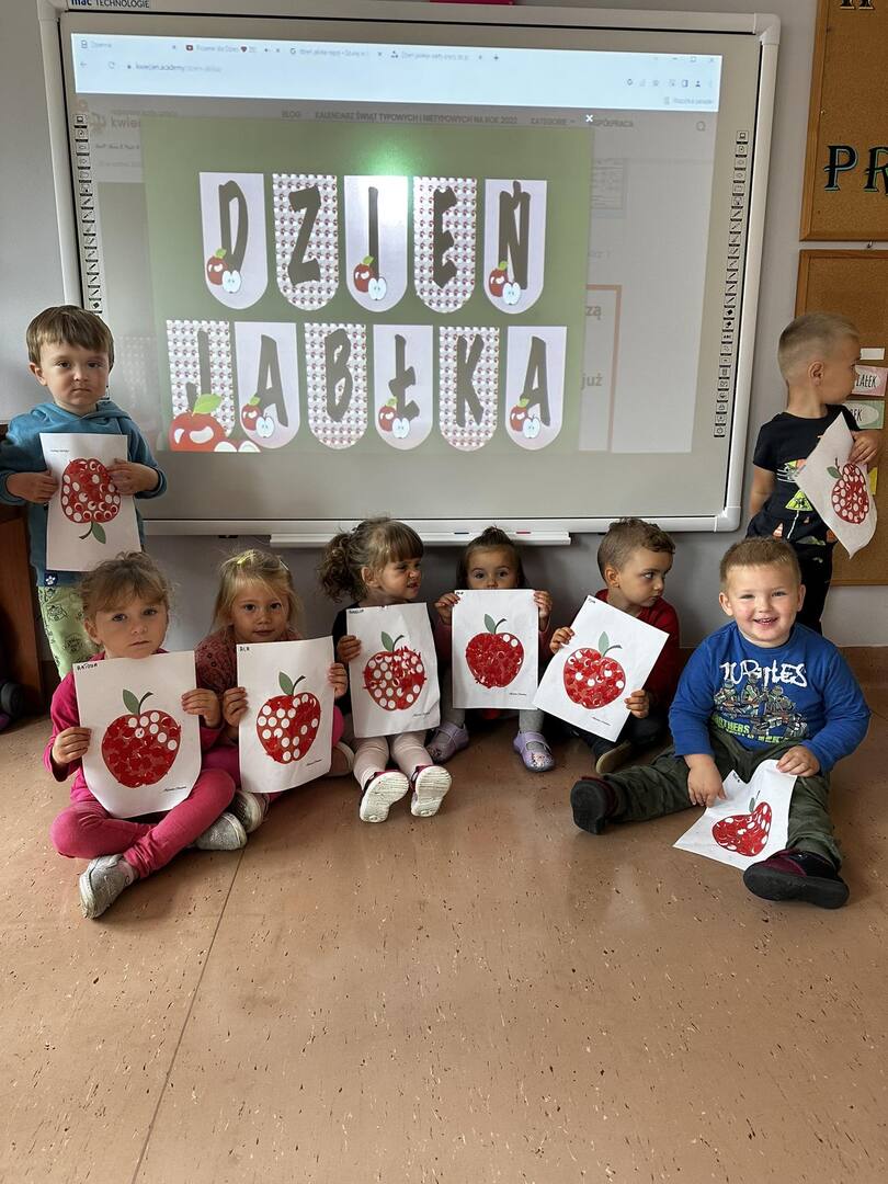 Dnia 2 października 2023r. w naszym przedszkolu obchodziliśmy Dzień Jabłka. Dzieci poszerzały wiedzę o jabłku. Poznawały kształt, zapach, kolor i smak. Ponadto rozwiązywały zagadki, słuchały wiersza. Przedszkolaki ze smakiem degustowały jabłuszka oraz sok jabłkowy. Wykonały również prace plastyczną przedstawiającą jabłko. Zajęcia i zabawy przeprowadzone w ten sposób zachęcają dzieci do sięgania po owoce.