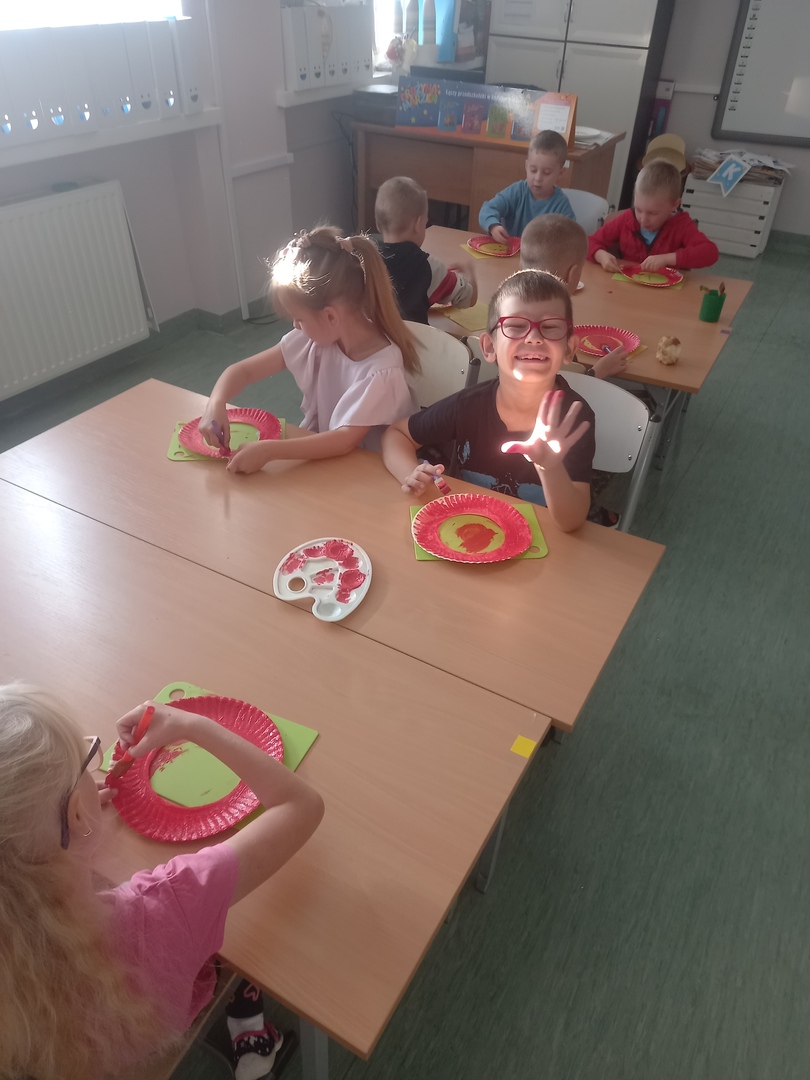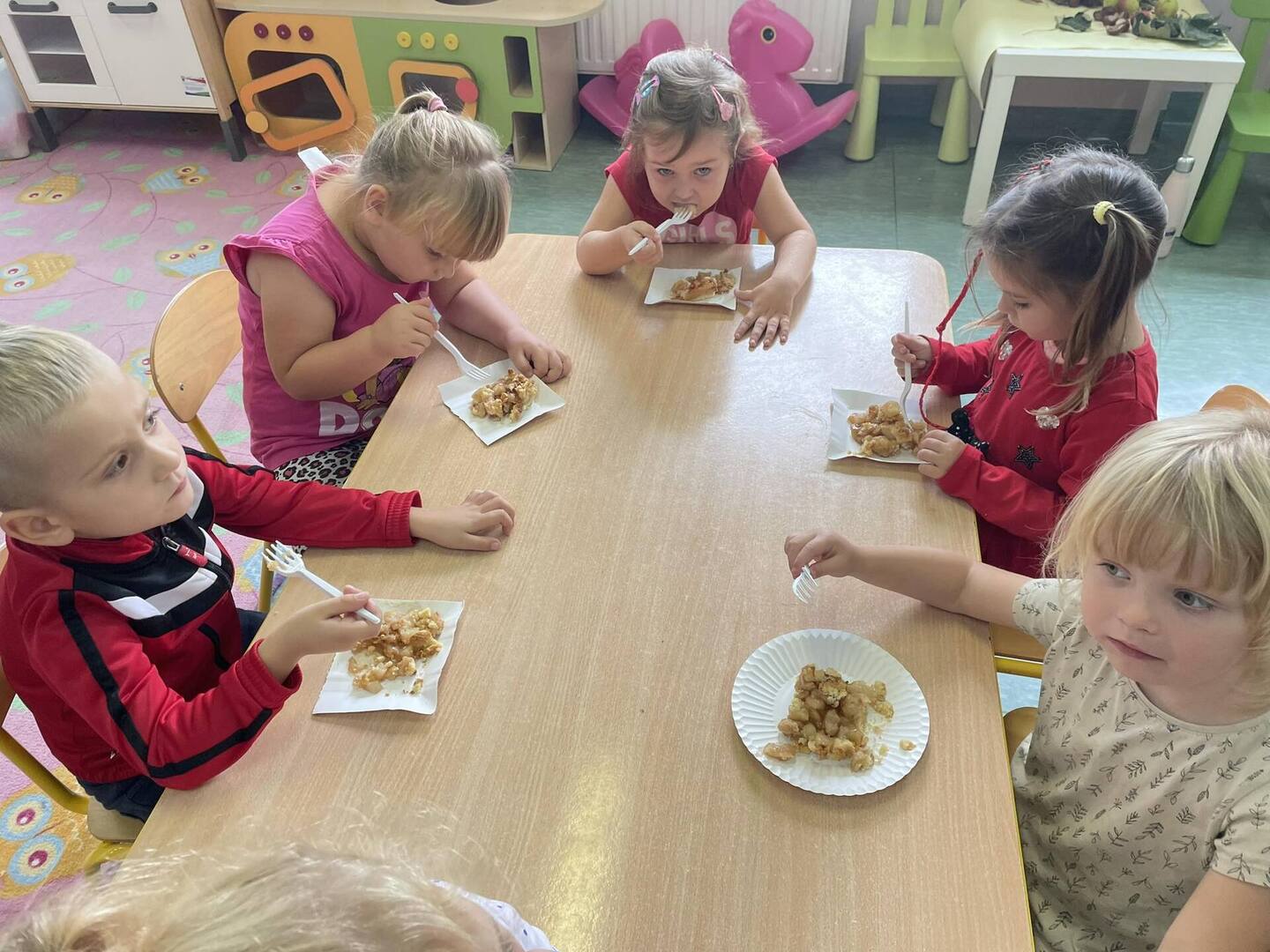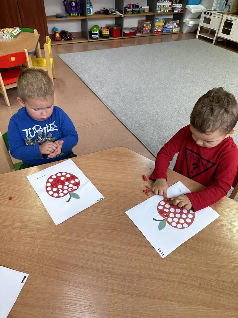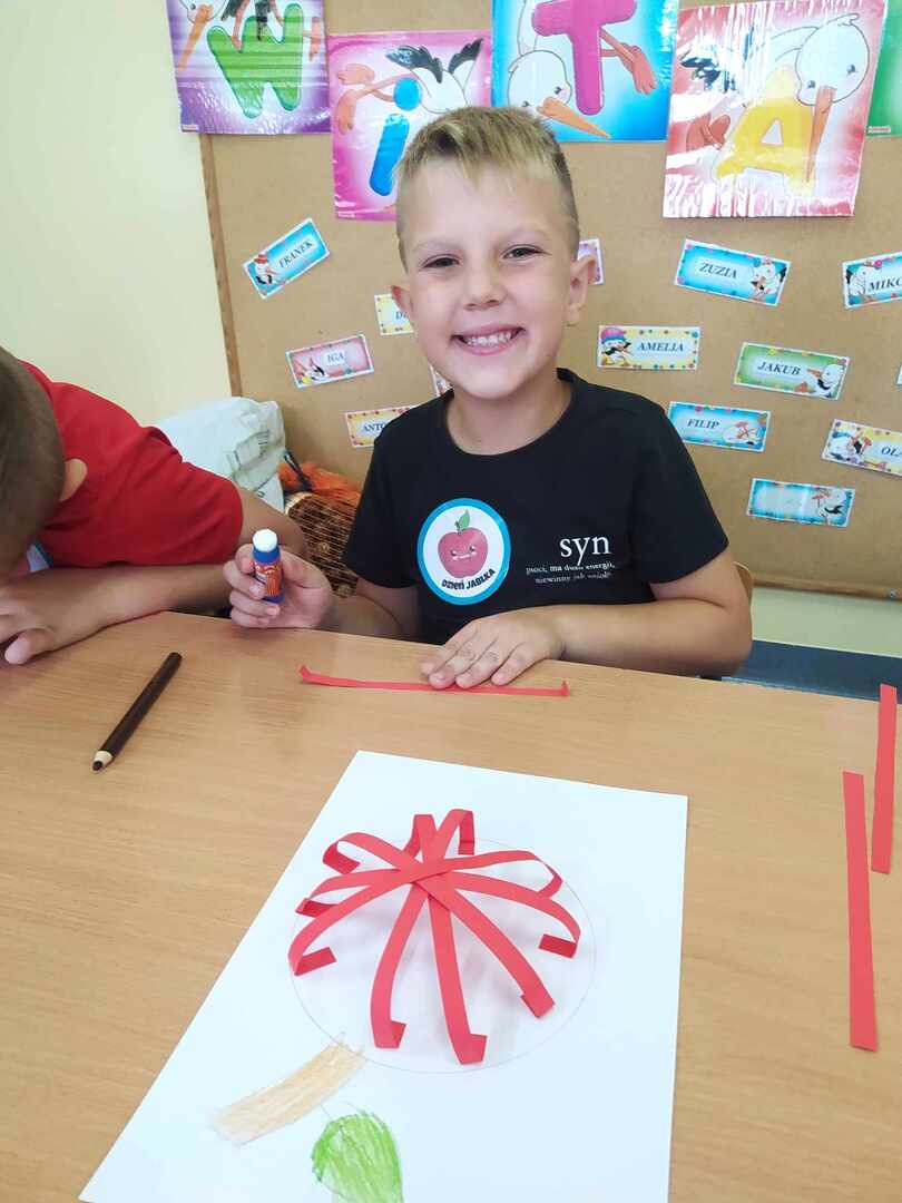 Dnia 2 października 2023r. w naszym przedszkolu obchodziliśmy Dzień Jabłka. Dzieci poszerzały wiedzę o jabłku. Poznawały kształt, zapach, kolor i smak. Ponadto rozwiązywały zagadki, słuchały wiersza. Przedszkolaki ze smakiem degustowały jabłuszka oraz sok jabłkowy. Wykonały również prace plastyczną przedstawiającą jabłko. Zajęcia i zabawy przeprowadzone w ten sposób zachęcają dzieci do sięgania po owoce.
