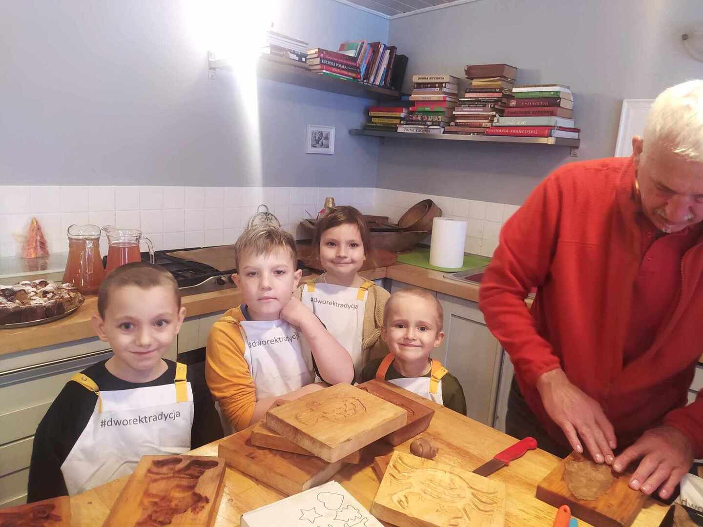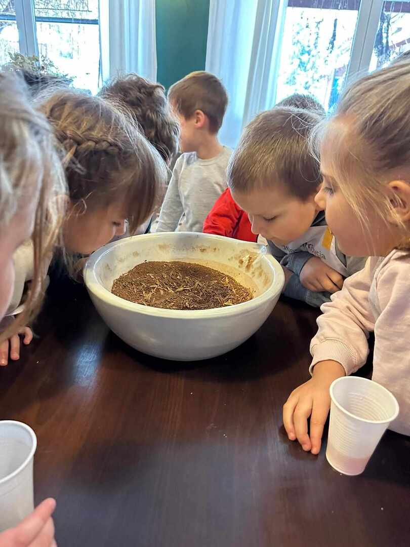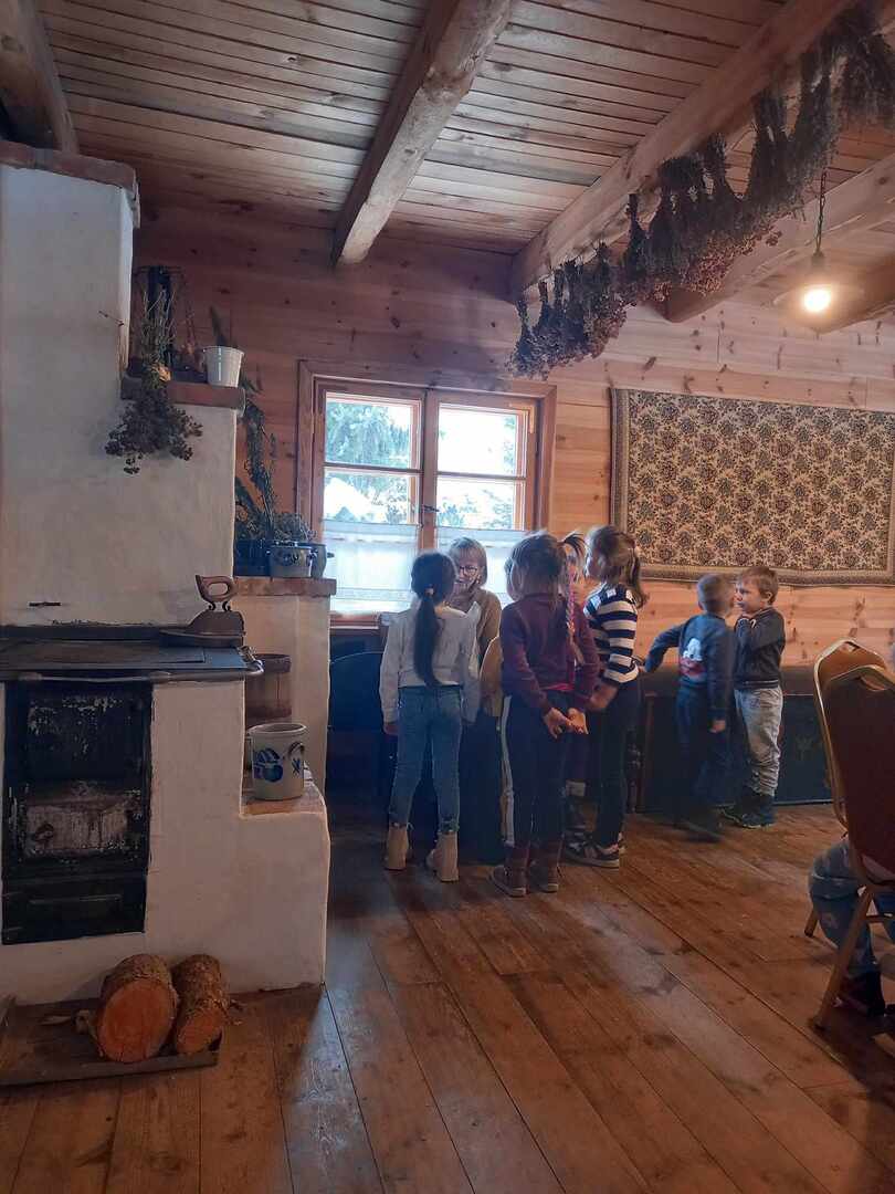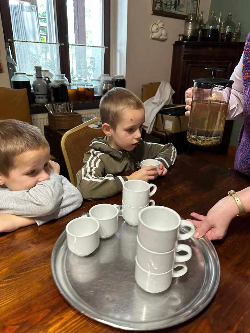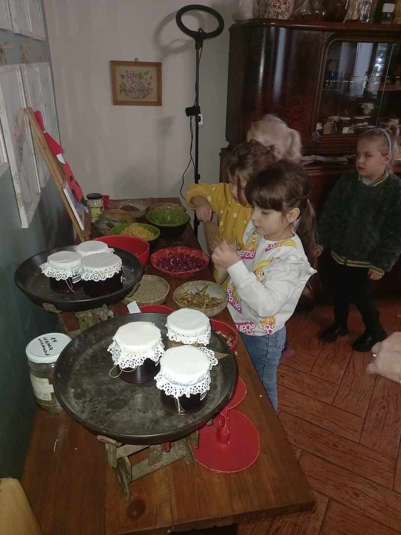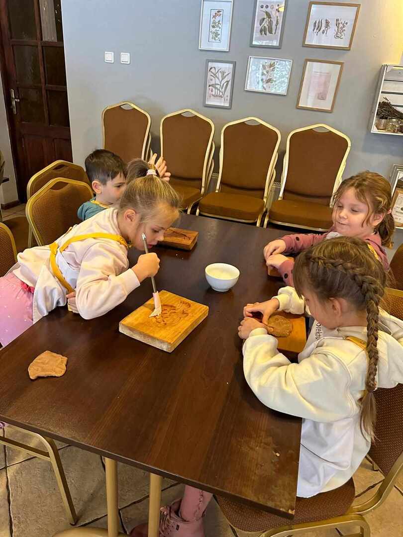 Dworek Tradycja to stary dom z ponad 300 -letnią historią, położony w małej, malowniczej wsi, miejsce to oraz panujący wokół klimat od razu zrobiły na nas ogromne wrażenie. Po przywitaniu się z gospodarzami uczniowie podzielili się na trzy grupy i rozeszli się do osobnych pomieszczeń. W starej kuchni z ogromnym kaflowym piecem, w którym nadal jest wypiekany chleb odbywały się zajęcia poświęcone ziołom i innym składnikom herbaty. Dzieci poznały ich właściwości, zapachy i aromaty oraz skomponowały własną mieszankę herbaty.
