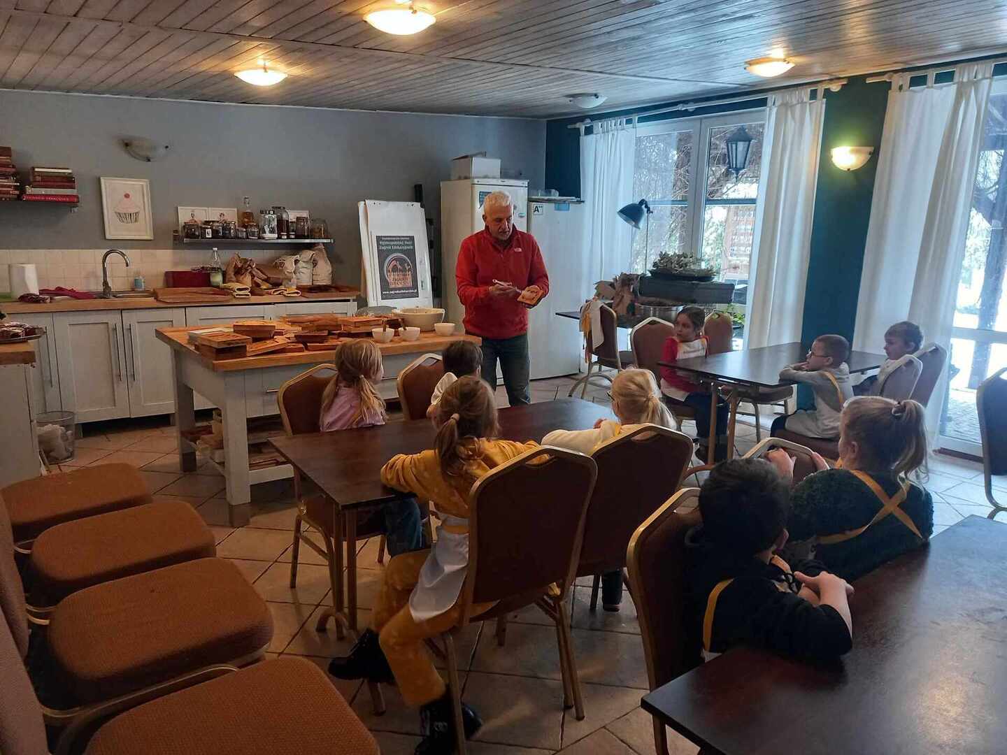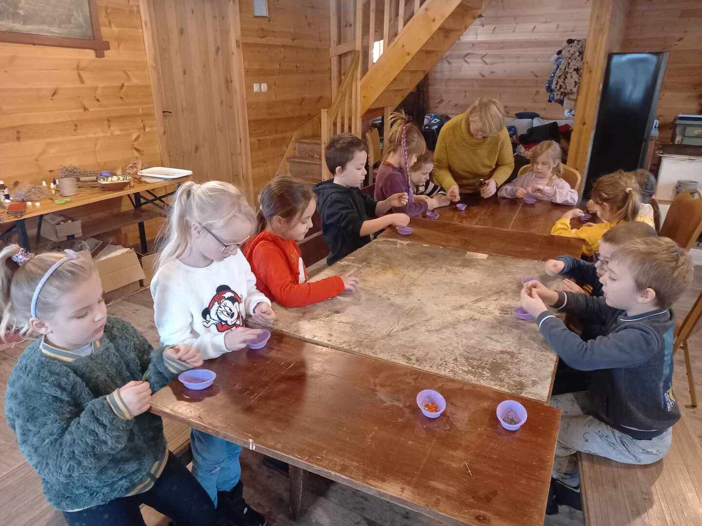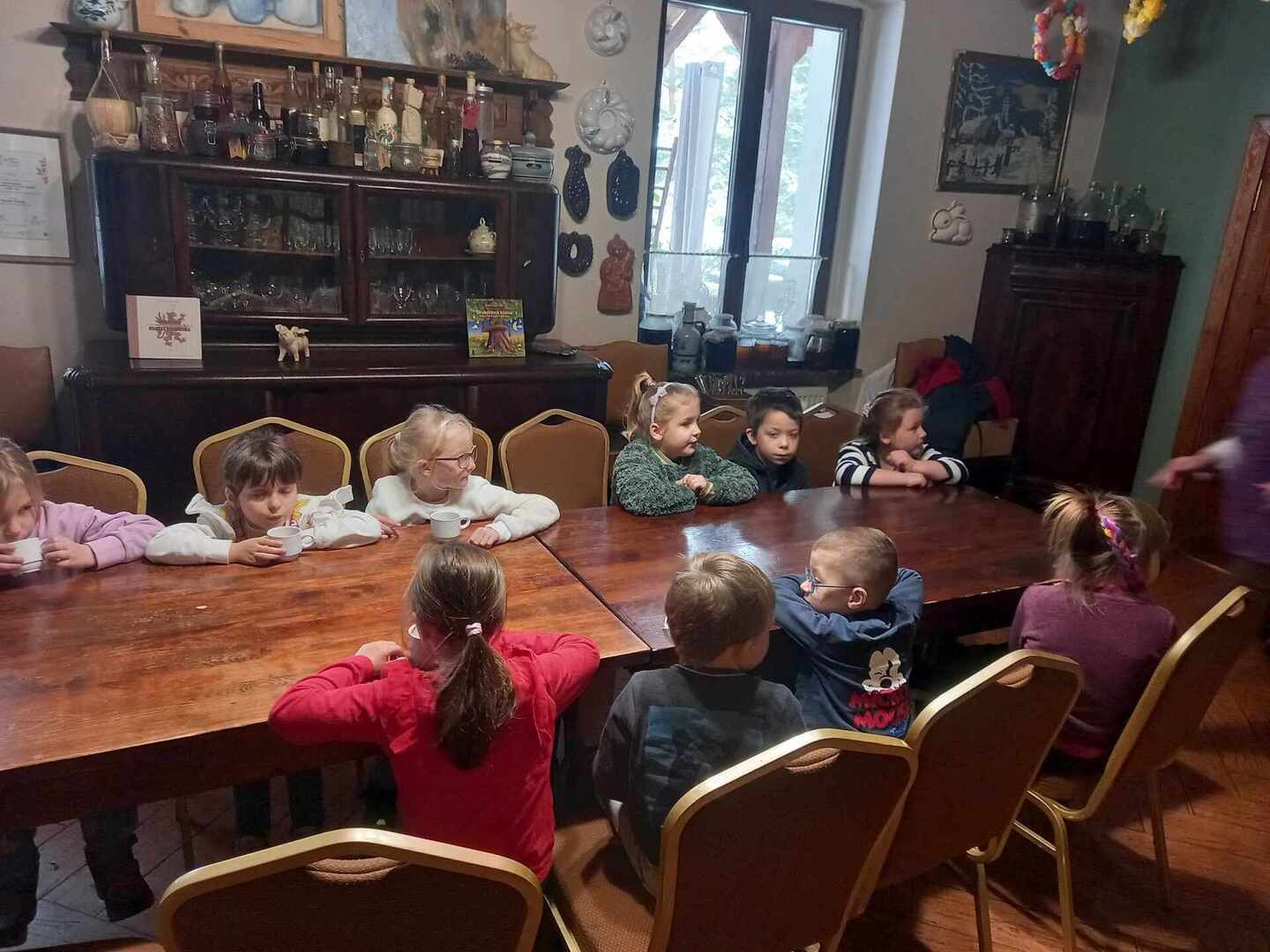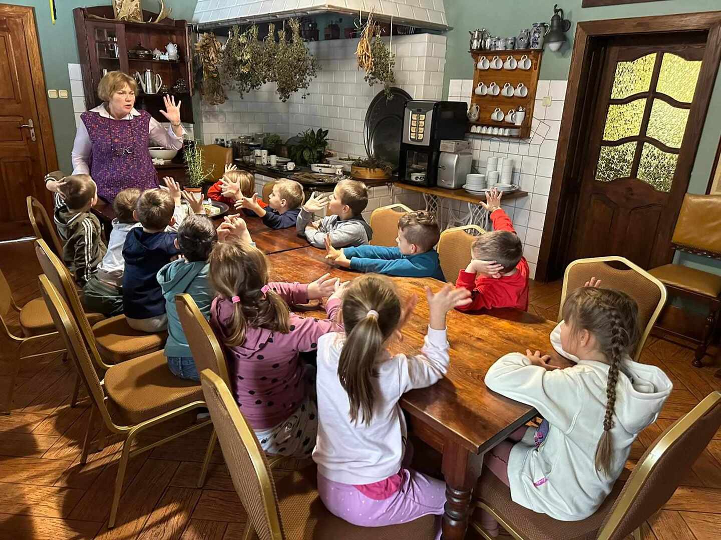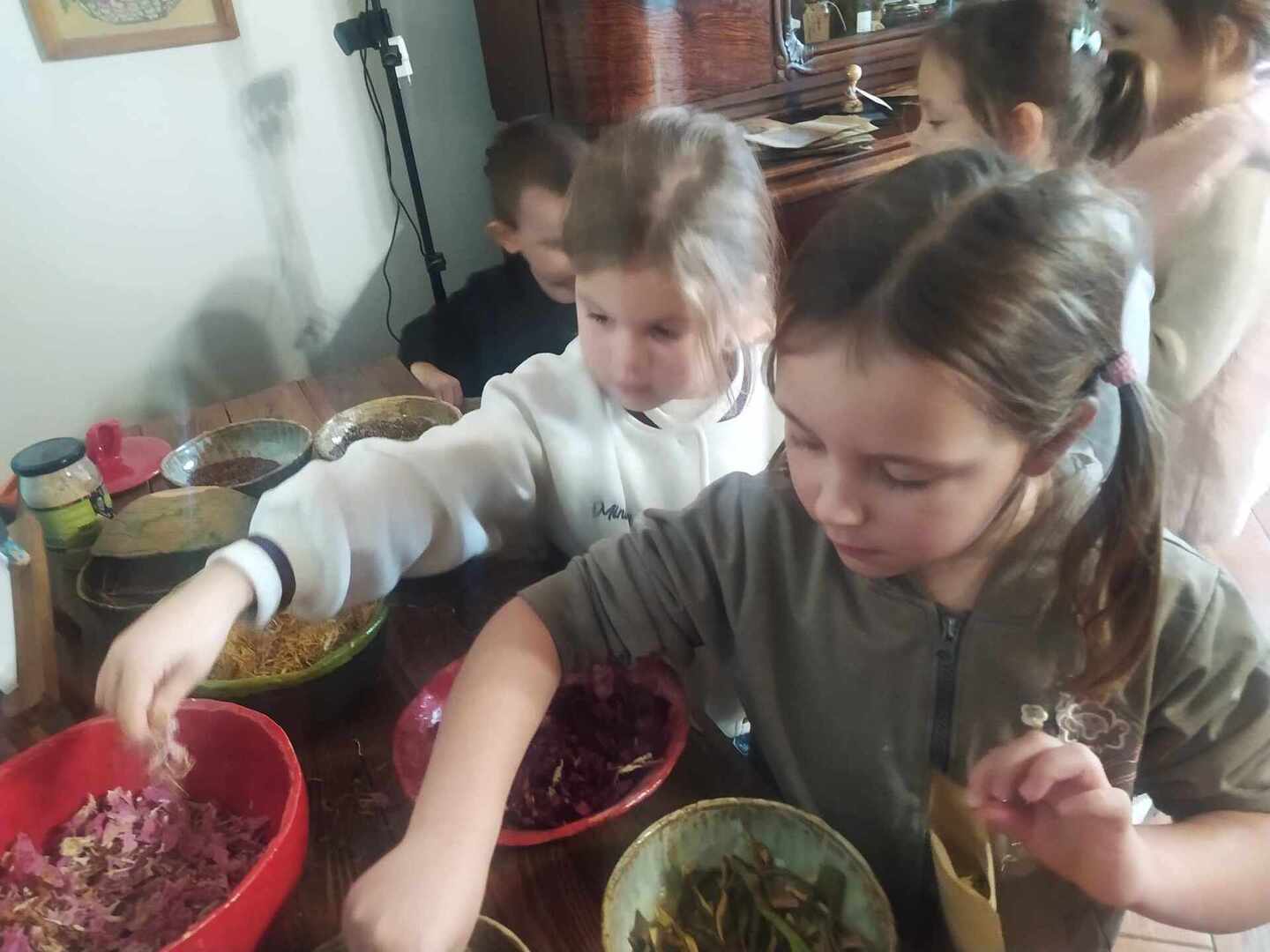 Dworek Tradycja to stary dom z ponad 300 -letnią historią, położony w małej, malowniczej wsi, miejsce to oraz panujący wokół klimat od razu zrobiły na nas ogromne wrażenie. Po przywitaniu się z gospodarzami uczniowie podzielili się na trzy grupy i rozeszli się do osobnych pomieszczeń. W starej kuchni z ogromnym kaflowym piecem, w którym nadal jest wypiekany chleb odbywały się zajęcia poświęcone ziołom i innym składnikom herbaty. Dzieci poznały ich właściwości, zapachy i aromaty oraz skomponowały własną mieszankę herbaty.