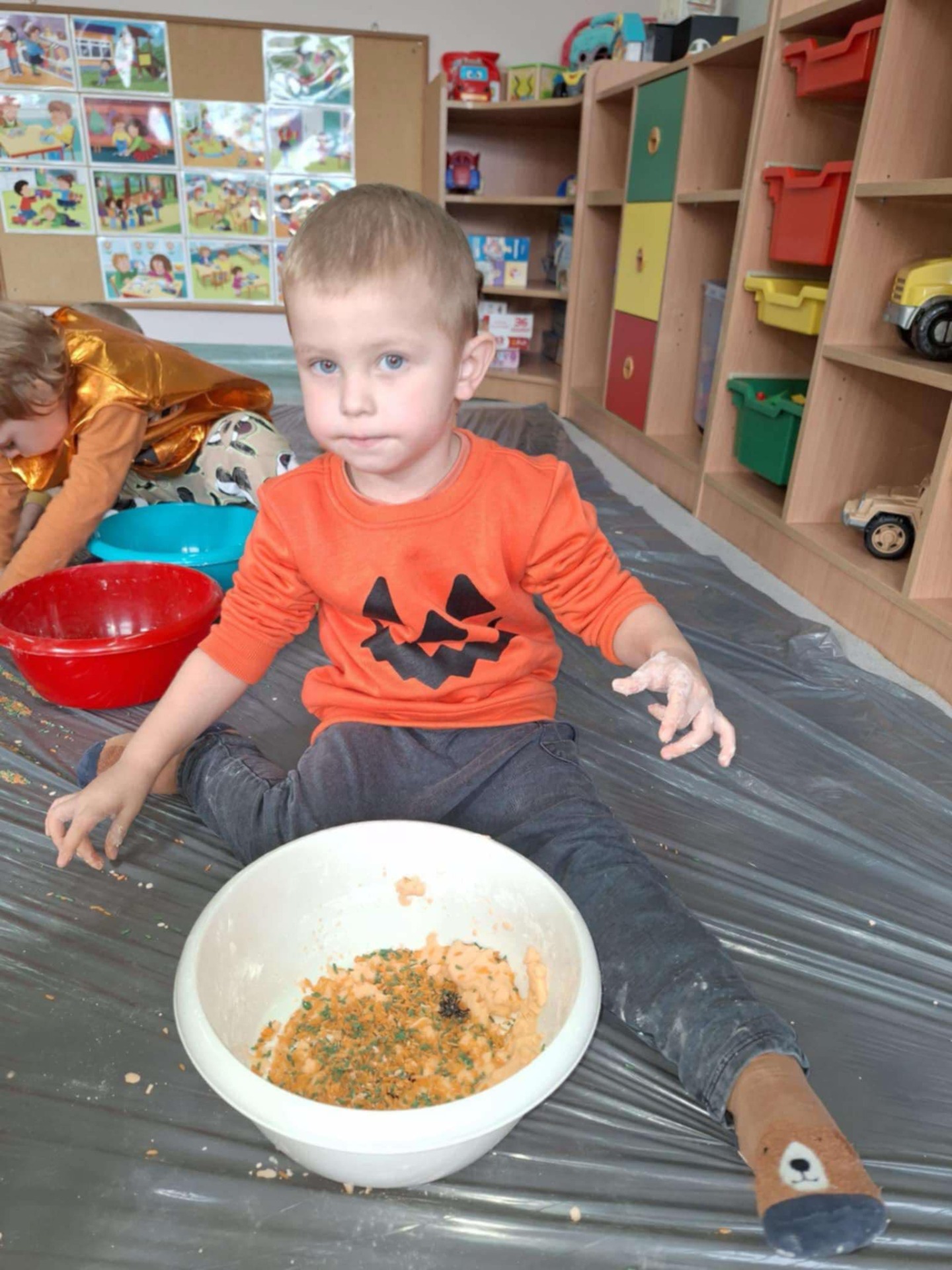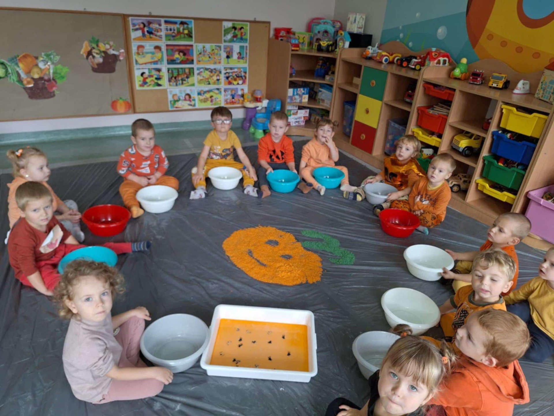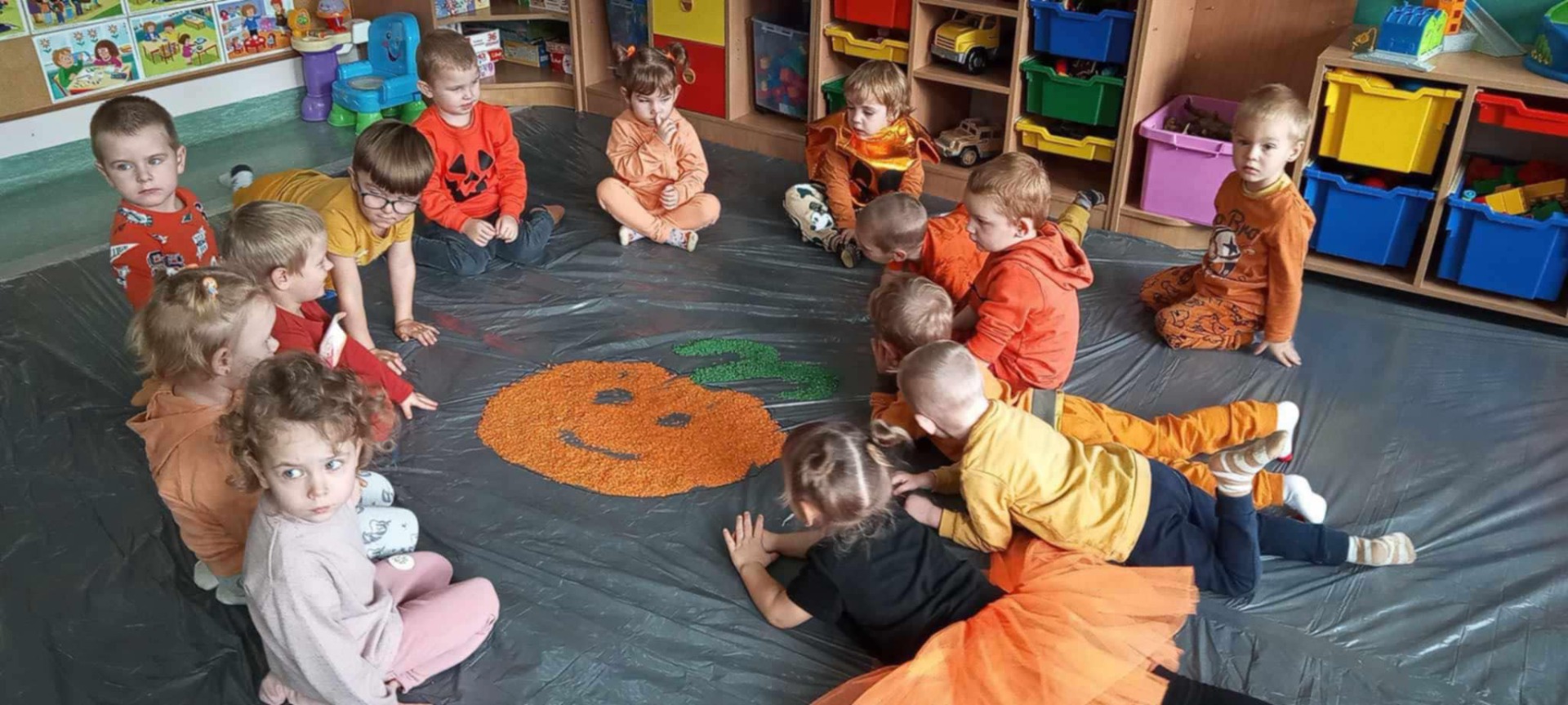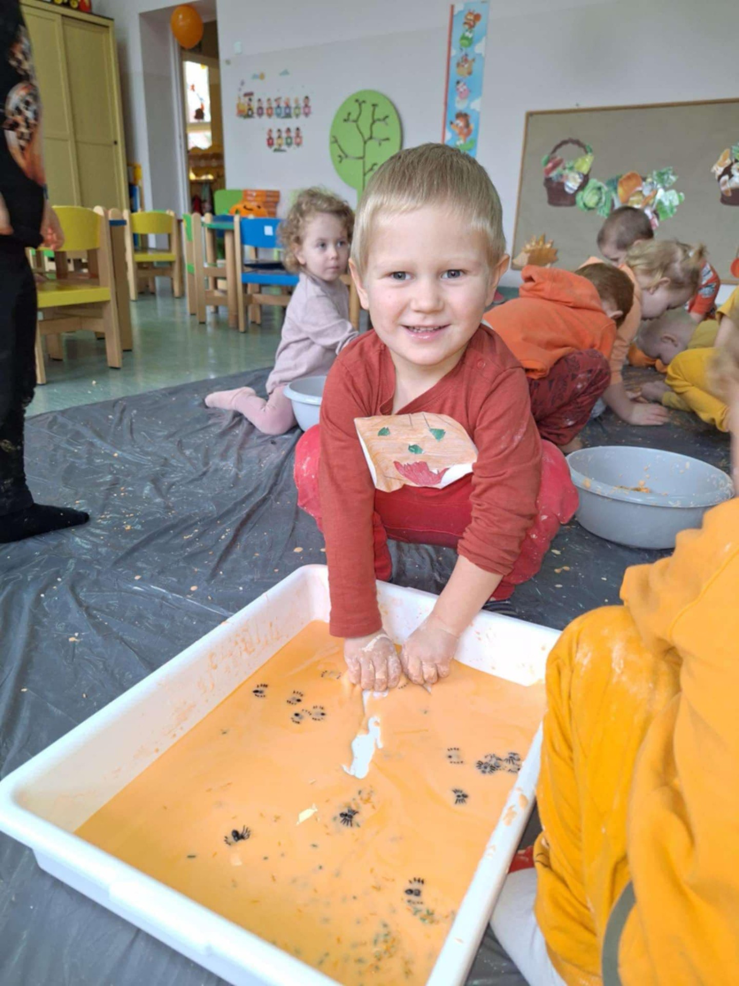 Dziś grupa przedszkolna Krasnoludków wzięła udział we wspólnej zabawie. Dzieci przyniosły ze sobą różne dynie i ubrały się na pomarańczowo. Były tańce, zabawa i to co maluchy lubią najbardziej czyli zajęcia sensoplastyczne.