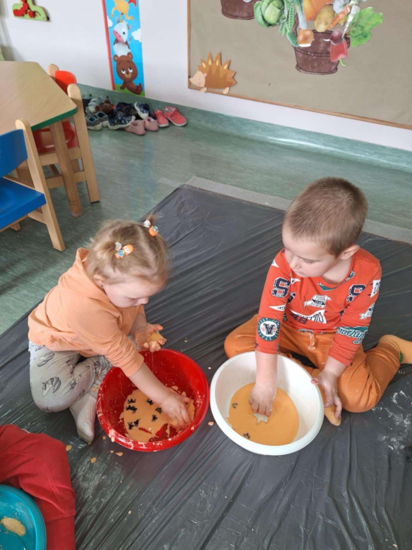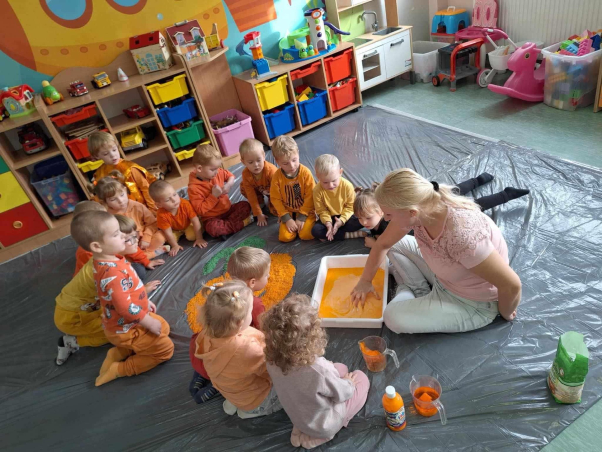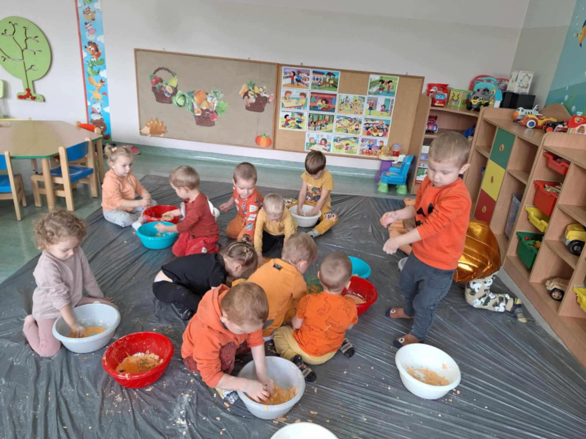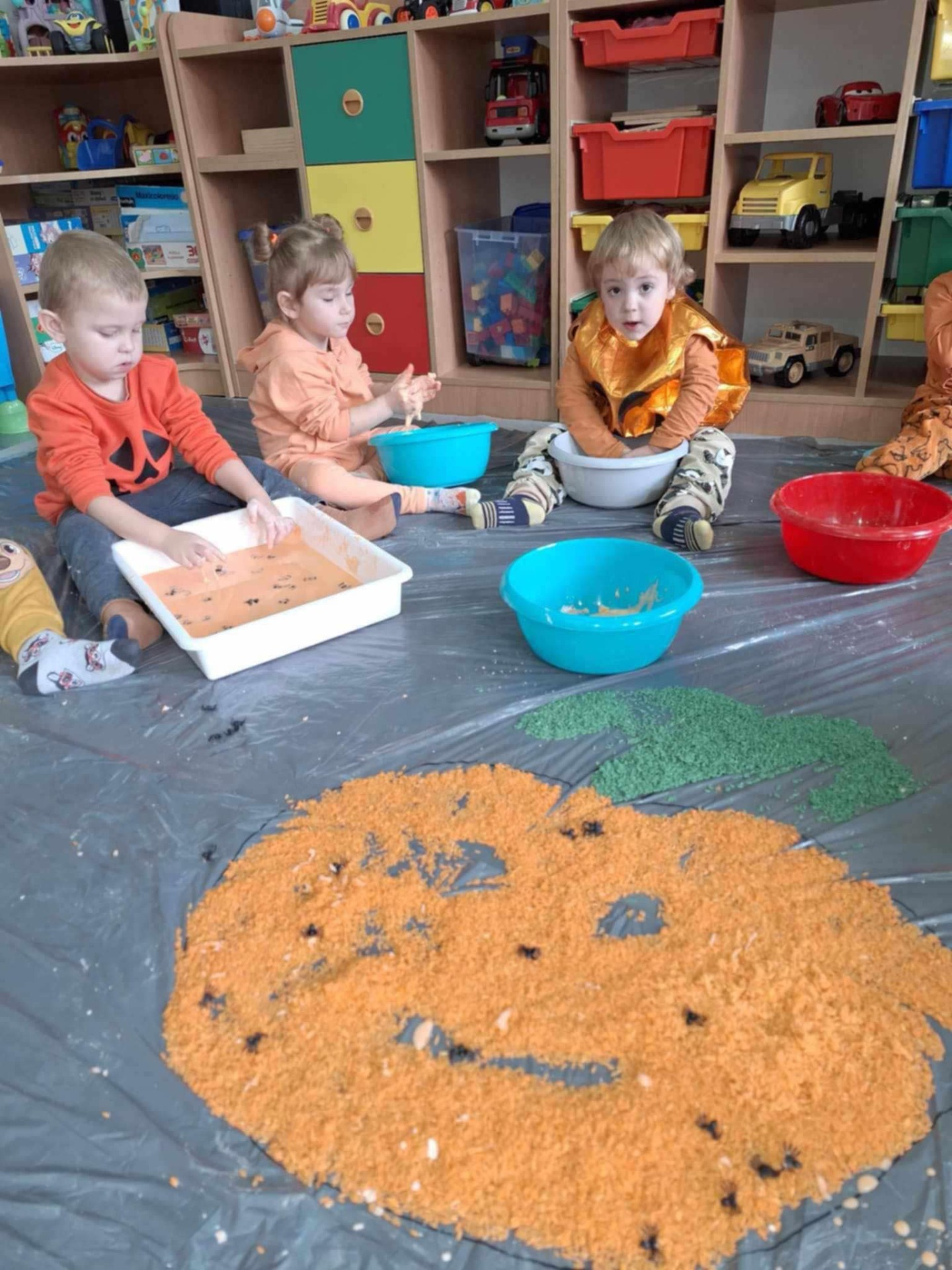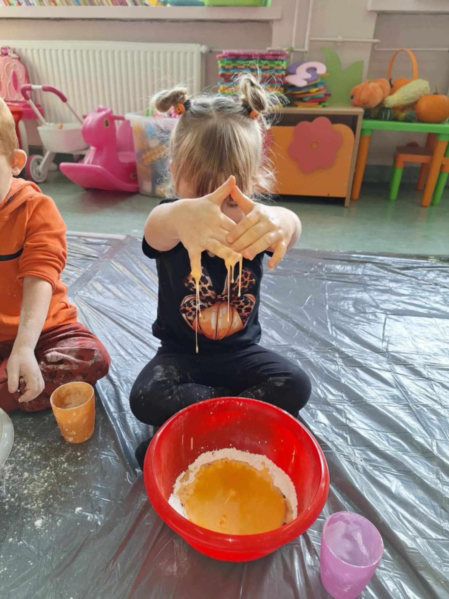 Dziś grupa przedszkolna Krasnoludków wzięła udział we wspólnej zabawie. Dzieci przyniosły ze sobą różne dynie i ubrały się na pomarańczowo. Były tańce, zabawa i to co maluchy lubią najbardziej czyli zajęcia sensoplastyczne.