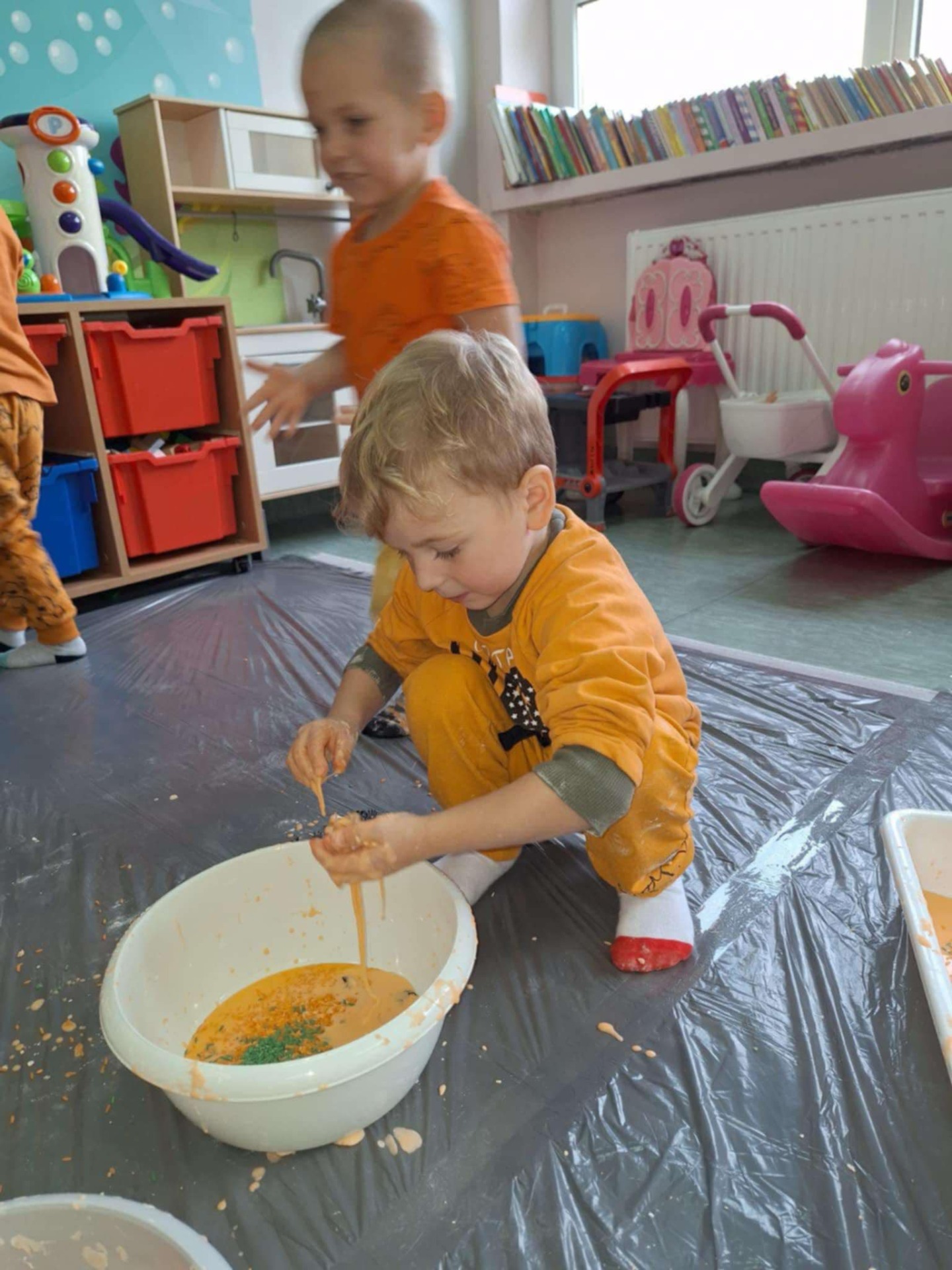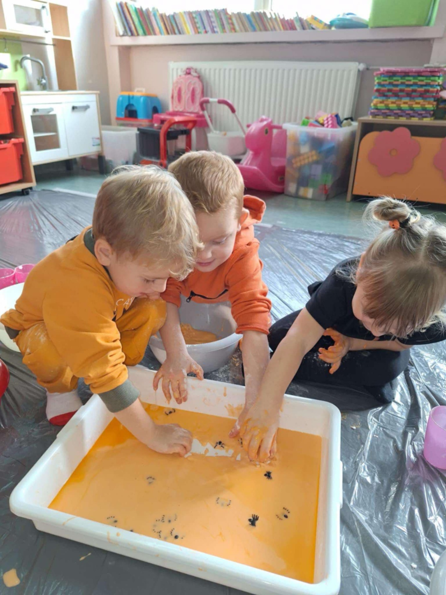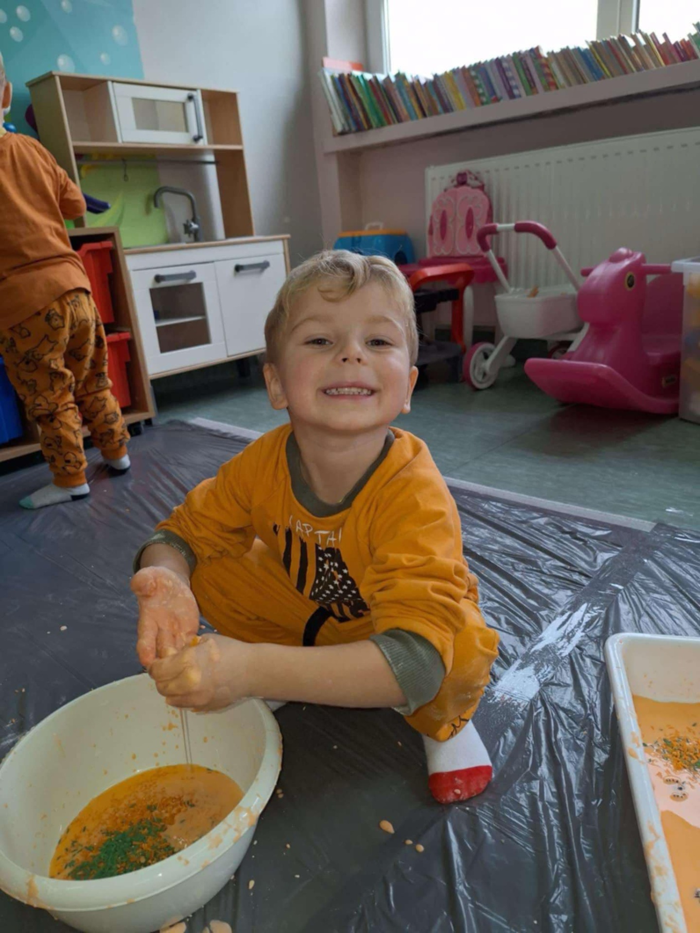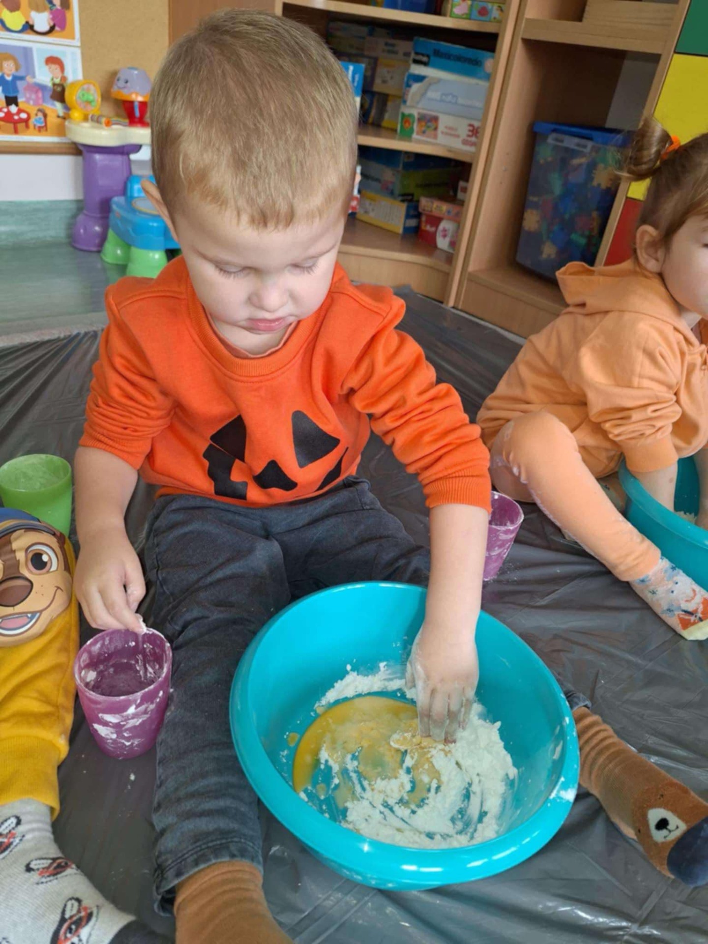 Dziś grupa przedszkolna Krasnoludków wzięła udział we wspólnej zabawie. Dzieci przyniosły ze sobą różne dynie i ubrały się na pomarańczowo. Były tańce, zabawa i to co maluchy lubią najbardziej czyli zajęcia sensoplastyczne.
