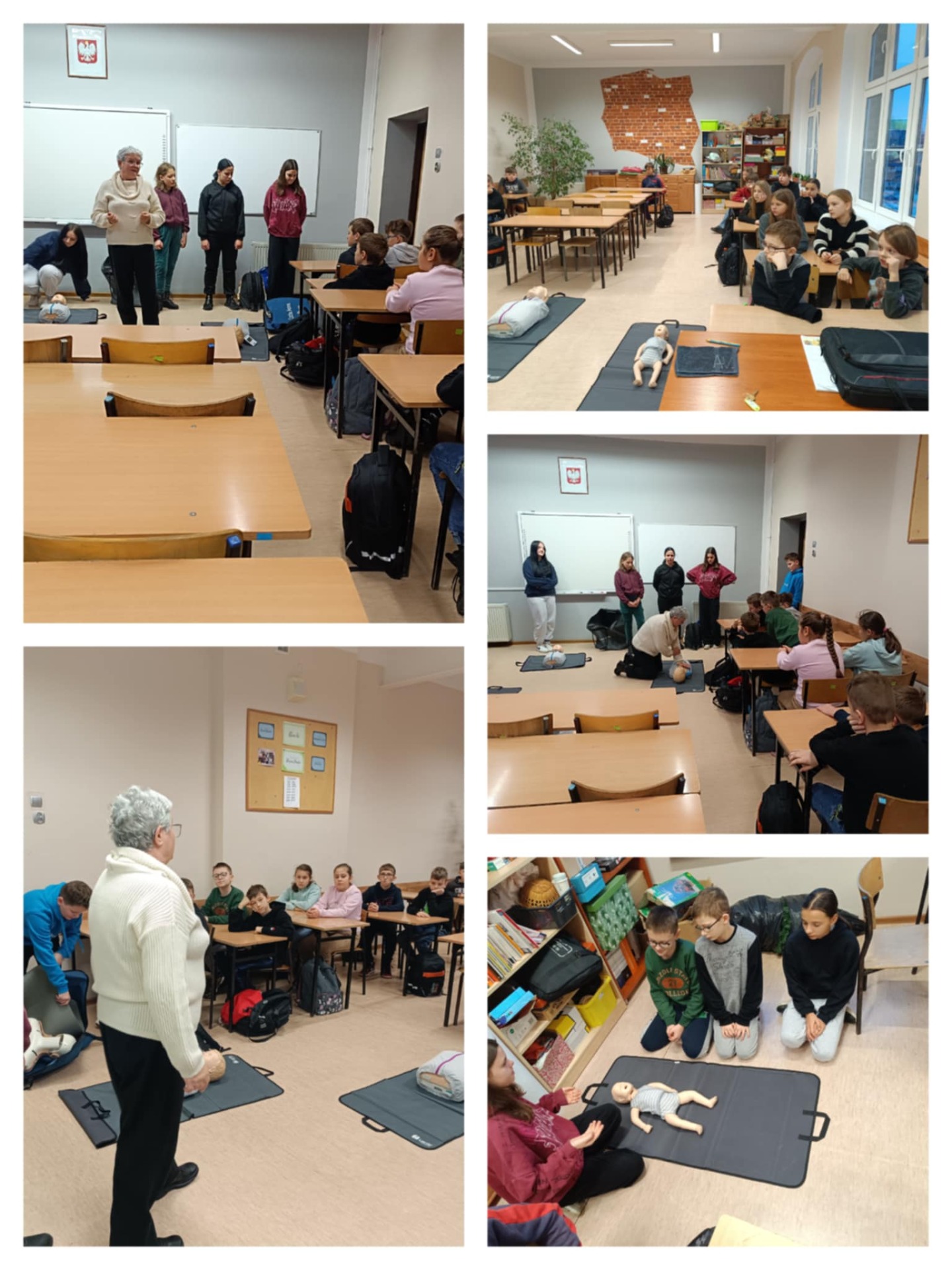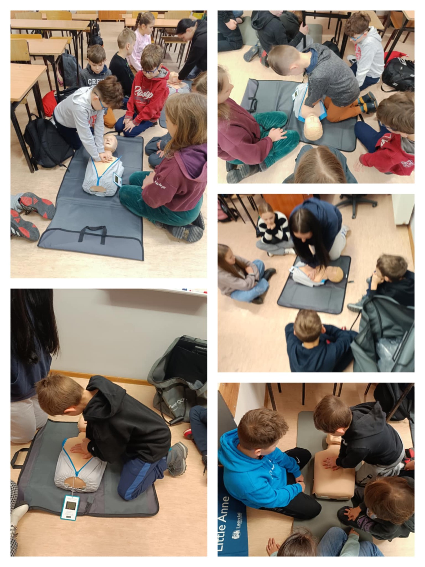 Dnia 9.01.2025 r. szkolna drużyna sanitarna przeprowadziła zajęcia praktyczne w klasie 4b, które miały na celu przypomnienie uczniom podstawowe umiejętności ratowania życia w sytuacjach zagrożenia. Drużyna sanitarna opowiedziała, jak ważna jest umiejętność udzielania pierwszej pomocy, jak ocenić sytuację i upewnić się, że udzielanie pomocy jest bezpieczne zarówno dla poszkodowanego i dla osoby ratującej. Każdy z uczniów miał szansę wykonać resuscytację krążeniowo-oddechową na fantomie. Bardzo dziękujemy za ciekawe zajęcia!