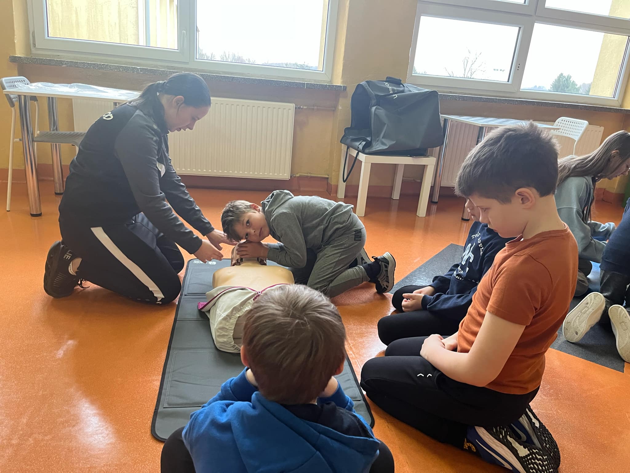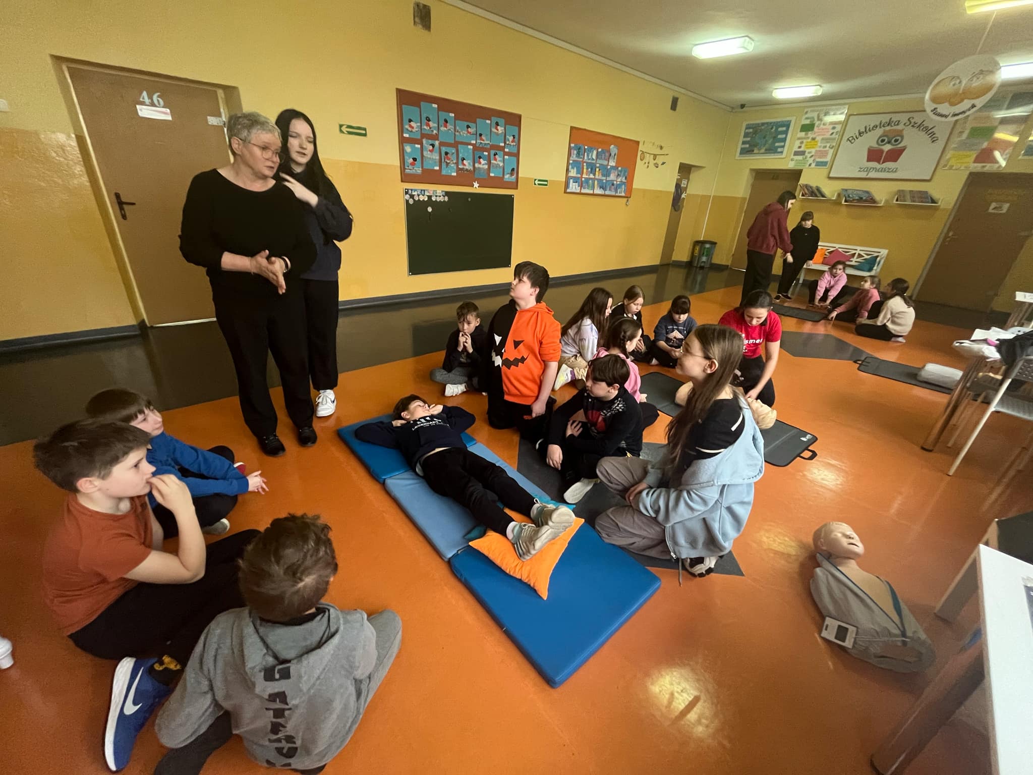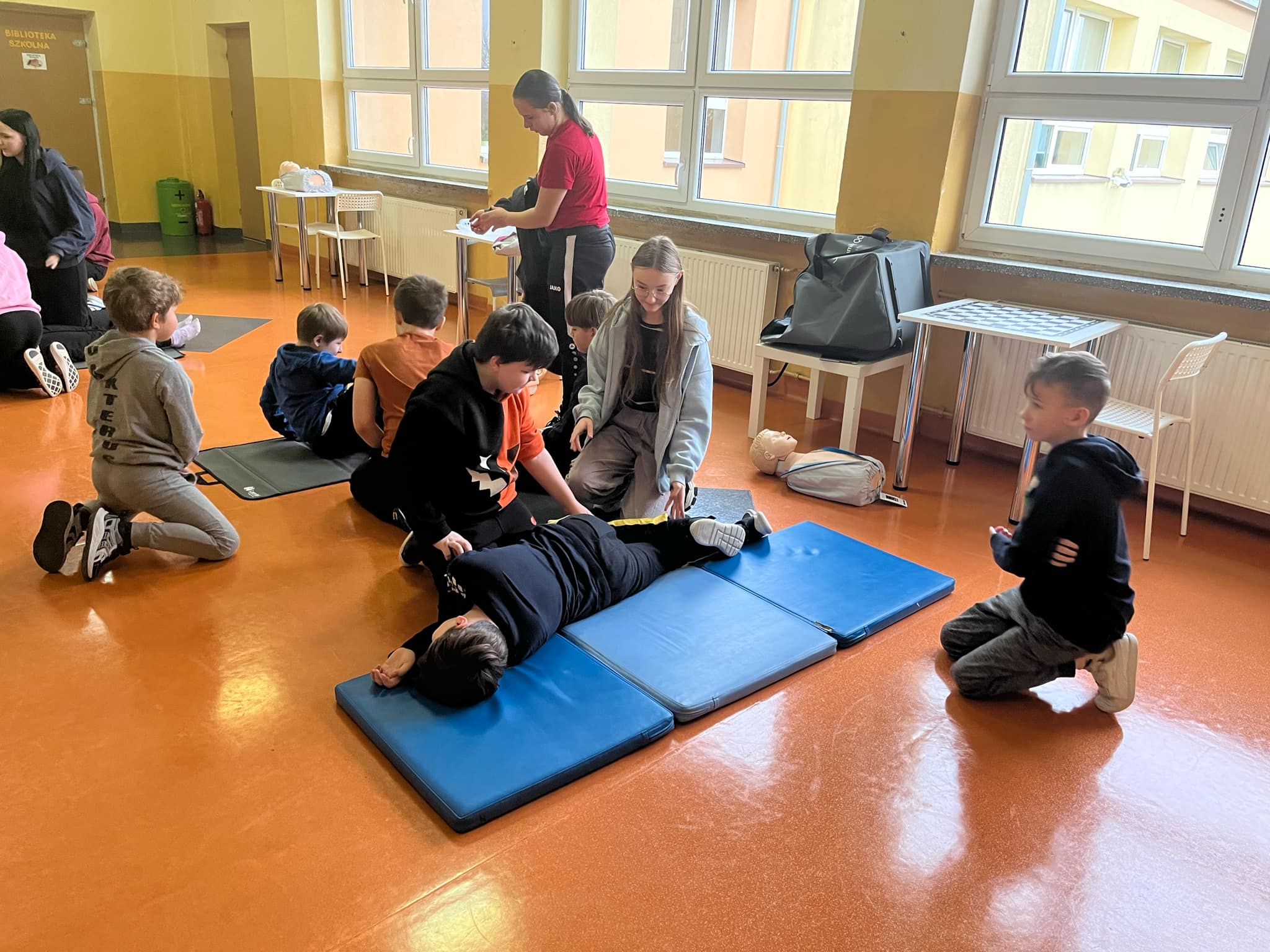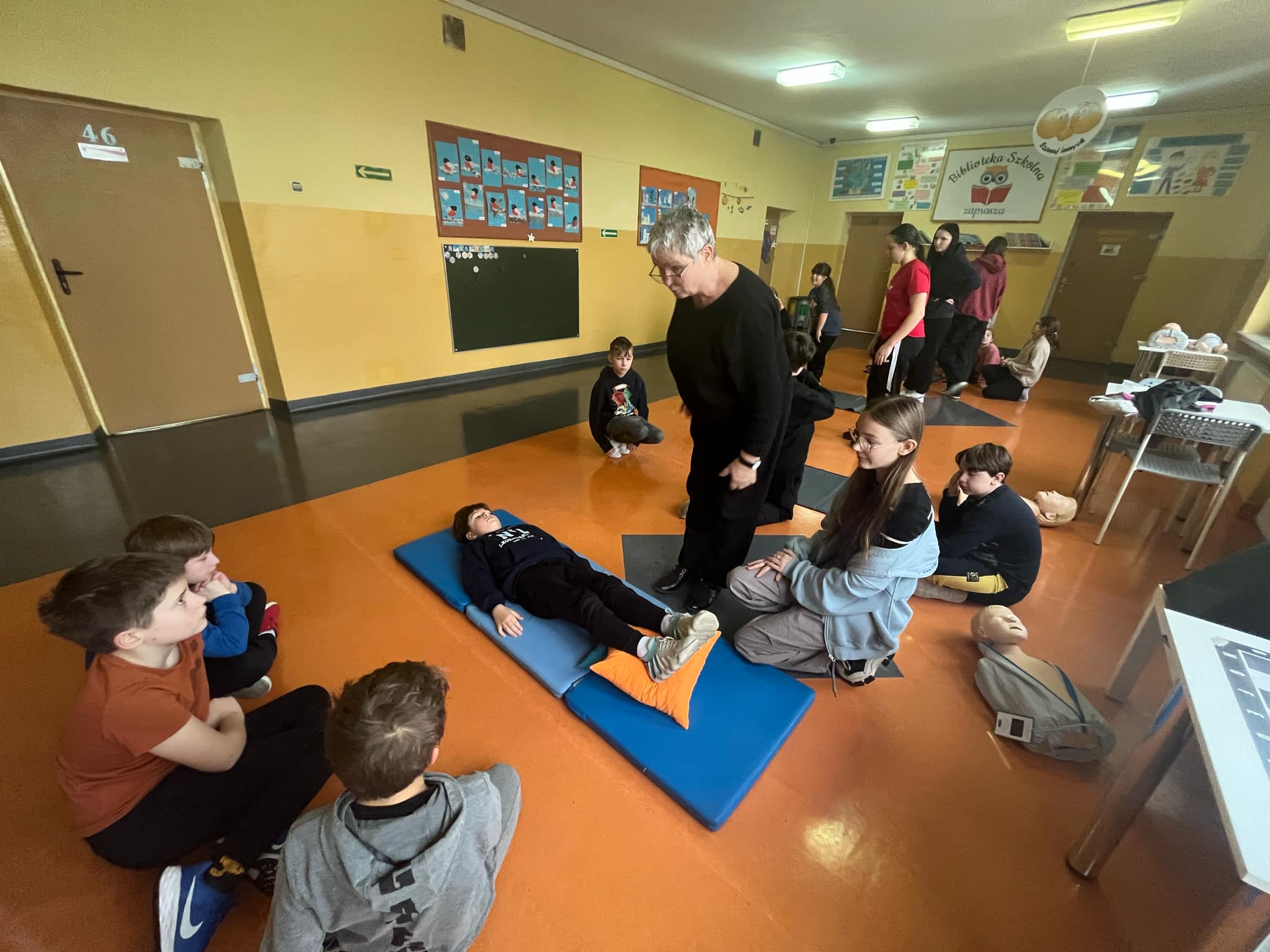 👩🏫 Szkolenie prowadziła doświadczona instruktorka pierwszej pomocy p. Danuta Kostrzewska, która w przystępny sposób wprowadziła uczniów w tematykę ratowania życia. Dzieci poznały zasady działania w sytuacjach kryzysowych, a także nauczyły się, jak wezwać pomoc i ocenić stan poszkodowanego.