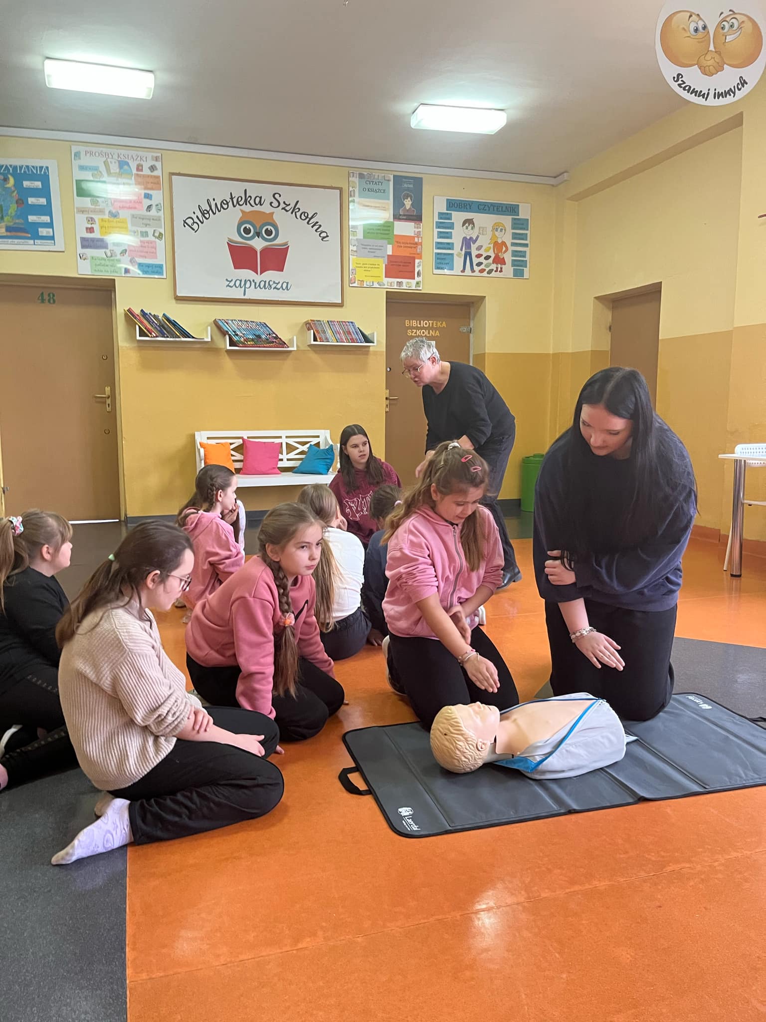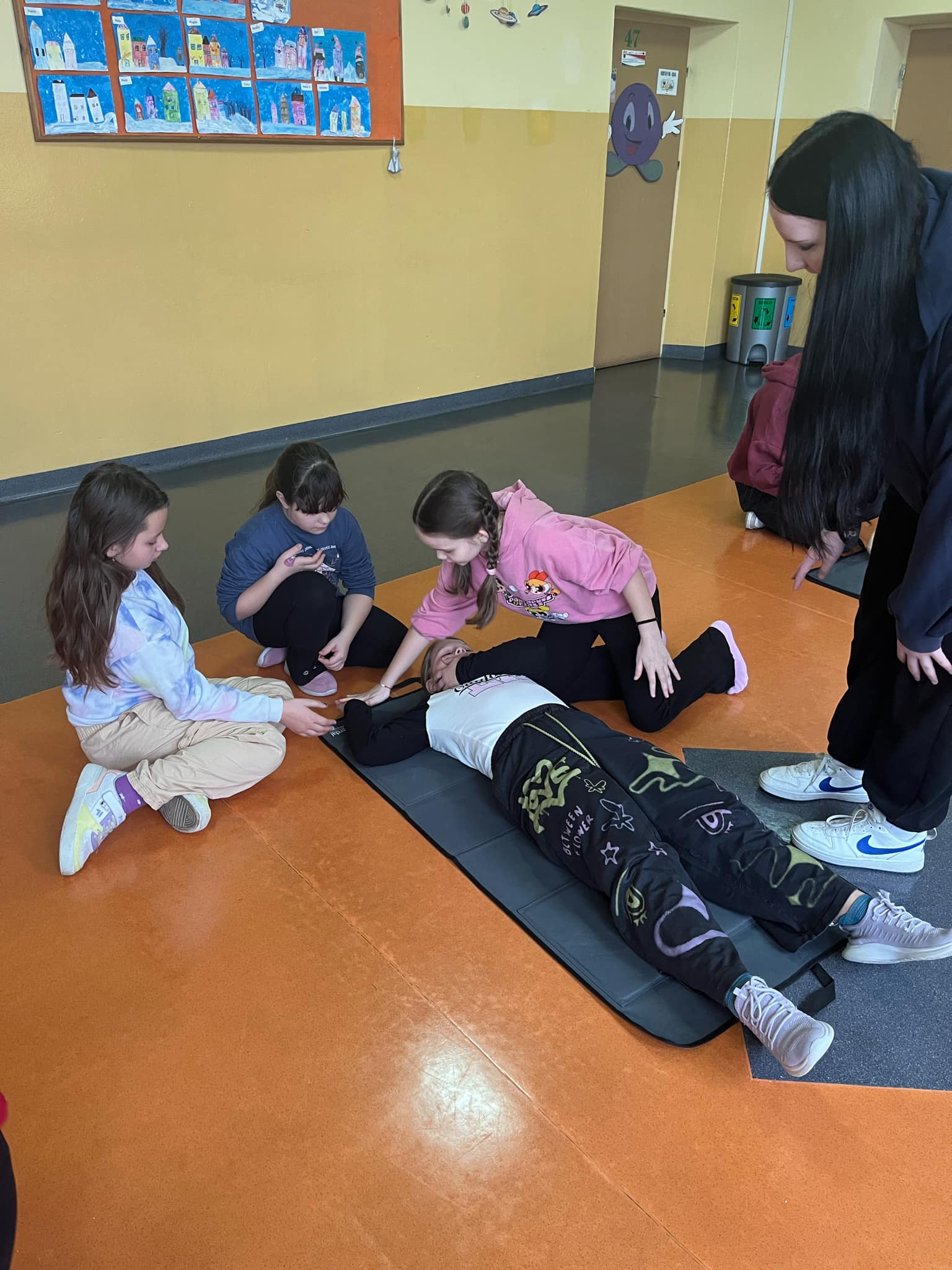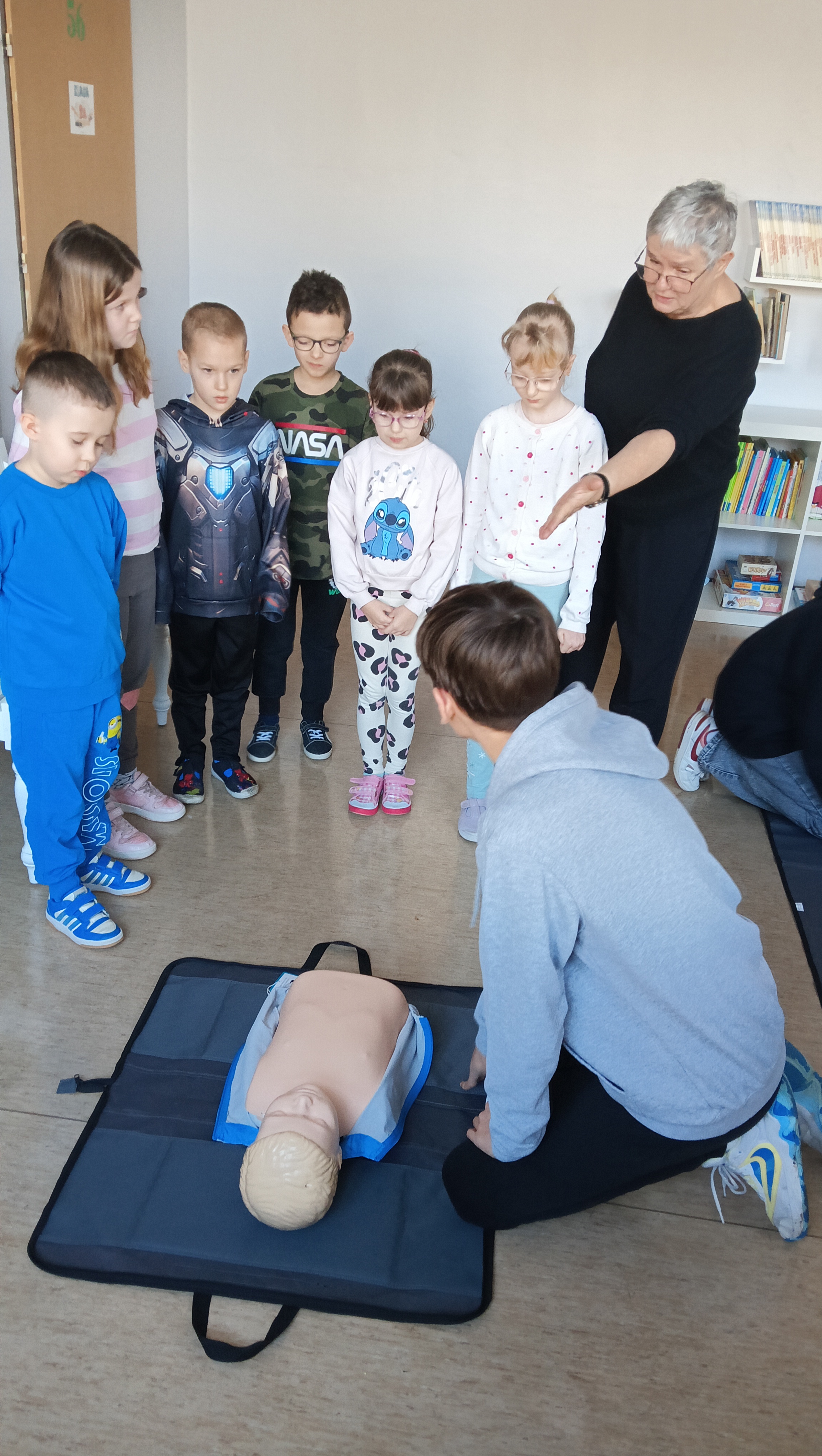 👩🏫 Szkolenie prowadziła doświadczona instruktorka pierwszej pomocy p. Danuta Kostrzewska, która w przystępny sposób wprowadziła uczniów w tematykę ratowania życia. Dzieci poznały zasady działania w sytuacjach kryzysowych, a także nauczyły się, jak wezwać pomoc i ocenić stan poszkodowanego.