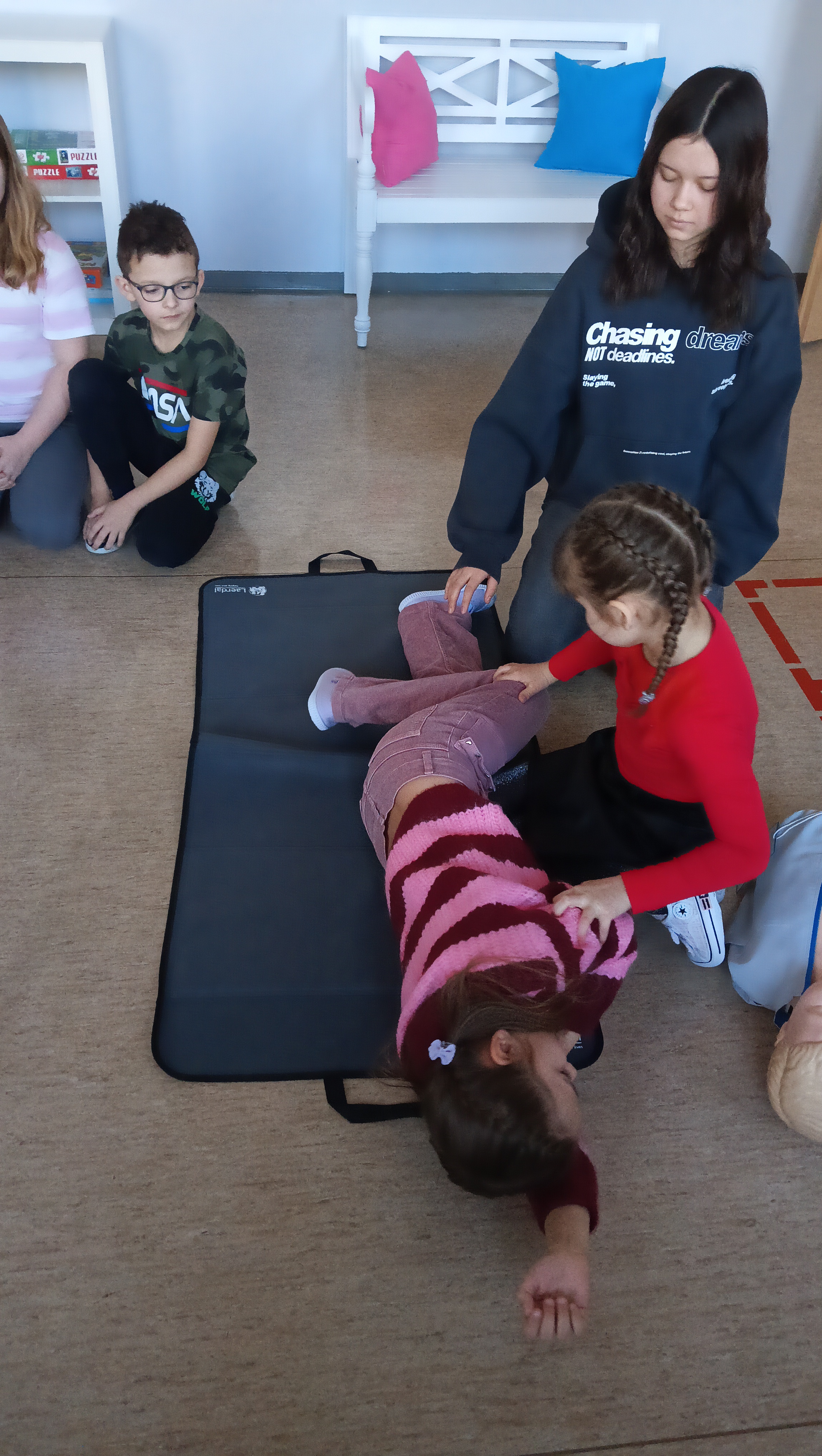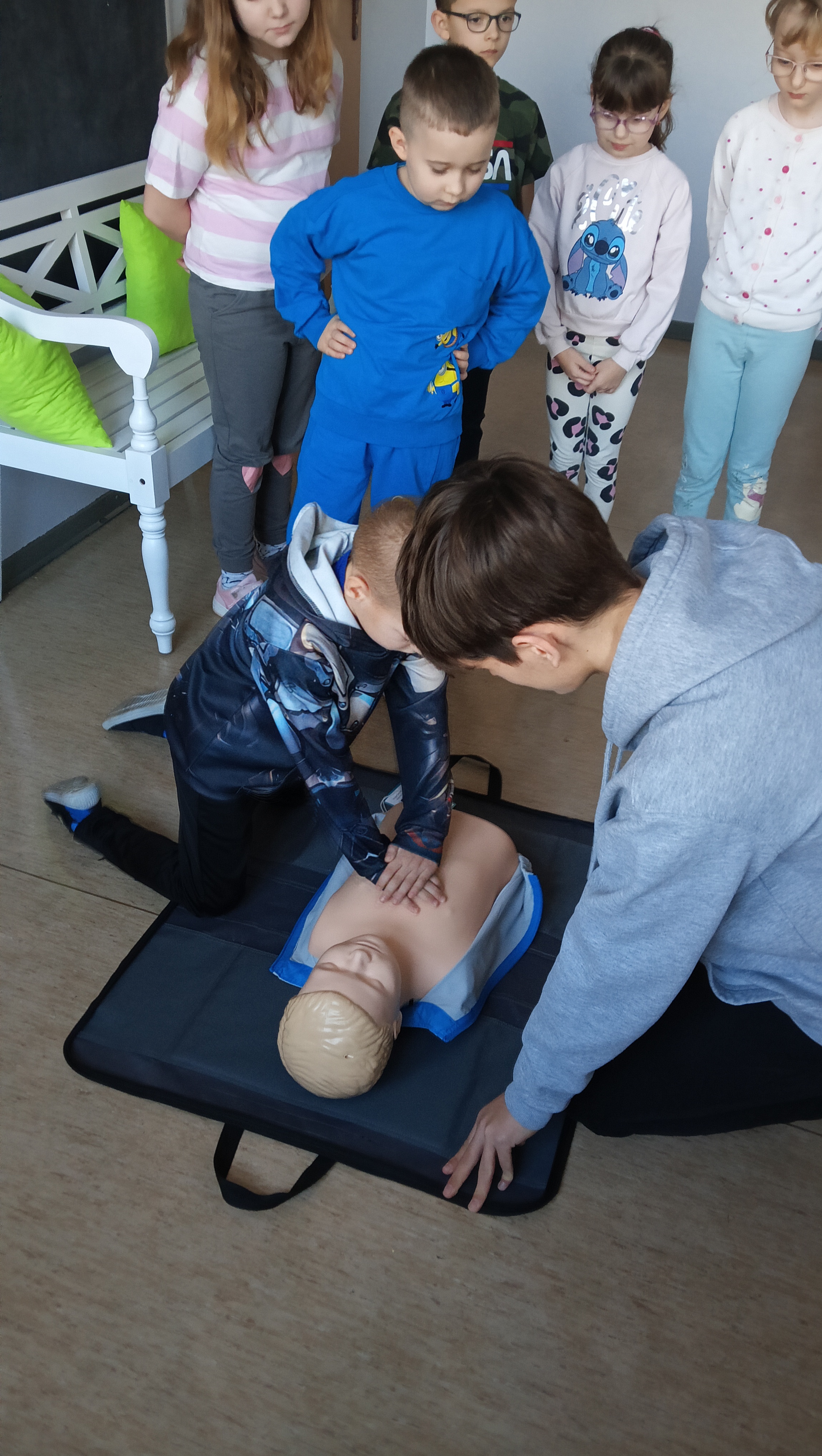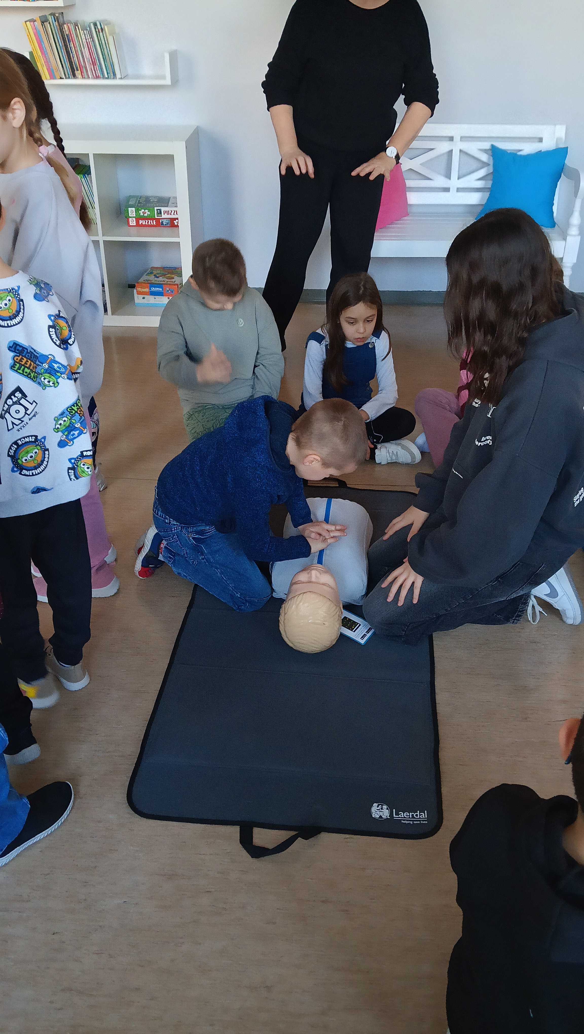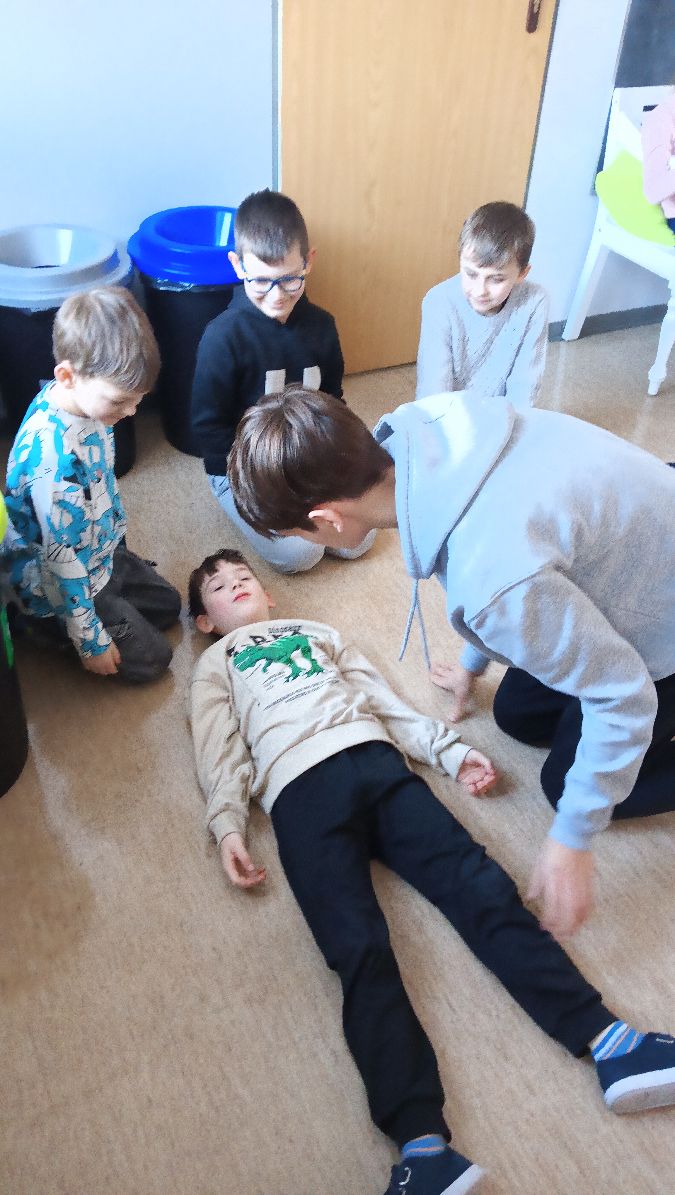 👩🏫 Szkolenie prowadziła doświadczona instruktorka pierwszej pomocy p. Danuta Kostrzewska, która w przystępny sposób wprowadziła uczniów w tematykę ratowania życia. Dzieci poznały zasady działania w sytuacjach kryzysowych, a także nauczyły się, jak wezwać pomoc i ocenić stan poszkodowanego.