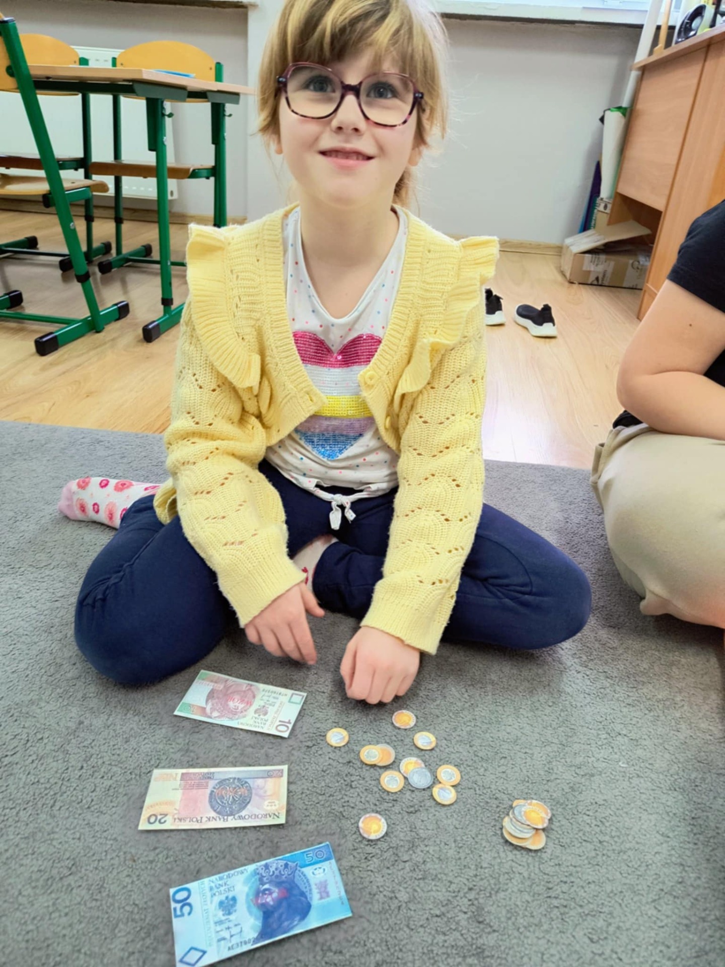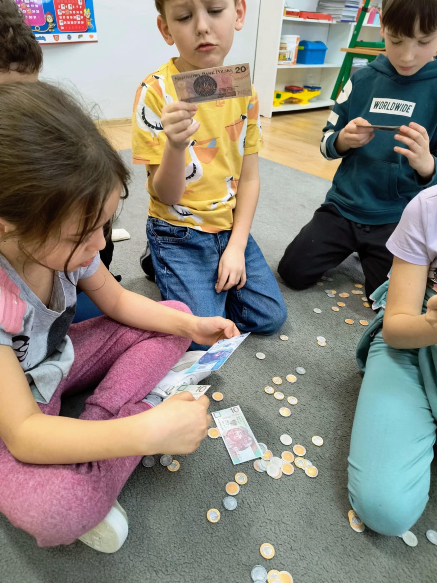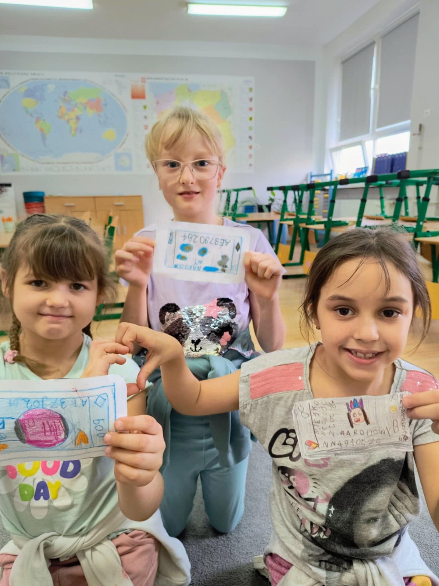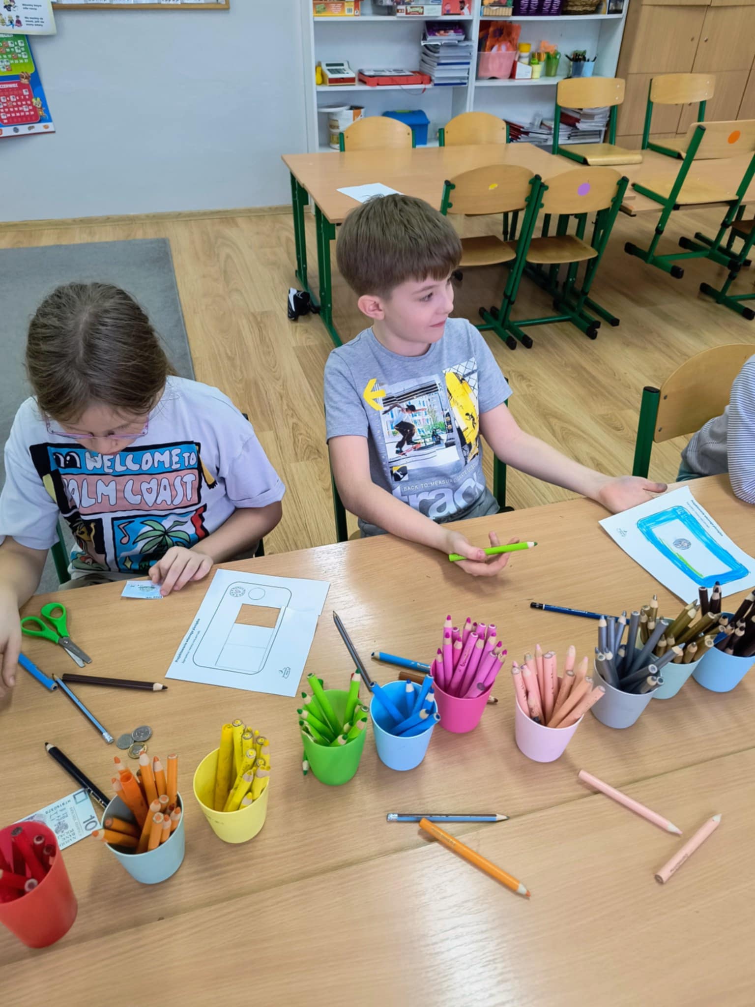 Podczas zajęć "Matematyka z TIK" uczniowie klas pierwszych i drugich poznali różne rodzaje środków płatniczych, dowiedzieli się jakimi przedmiotami płacono dawniej oraz jak wyglądały pierwsze pieniądze. Wychowankowie, zwielkim zainteresowaniem dokonali szczegółowej analizy elementów awersu i rewersu monet a także elementów zabezpieczających banknotów, samodzielnie sprawdzali czy banknoty posiadają znak wodny i nitkę zabezpieczającą. Podsumowaniem ciekawej lekcji matematyki było zaprojektowanie własnych banknotów.