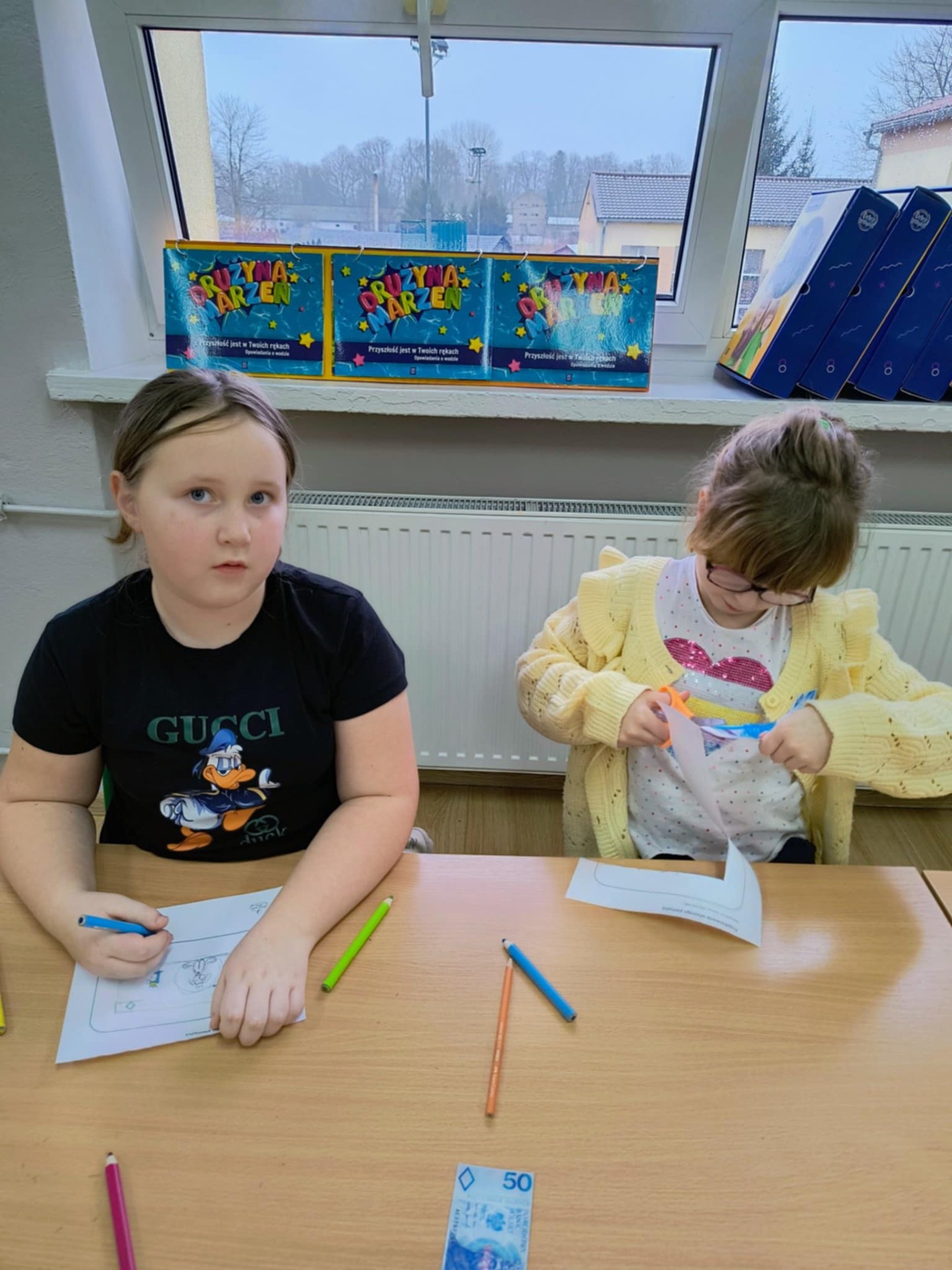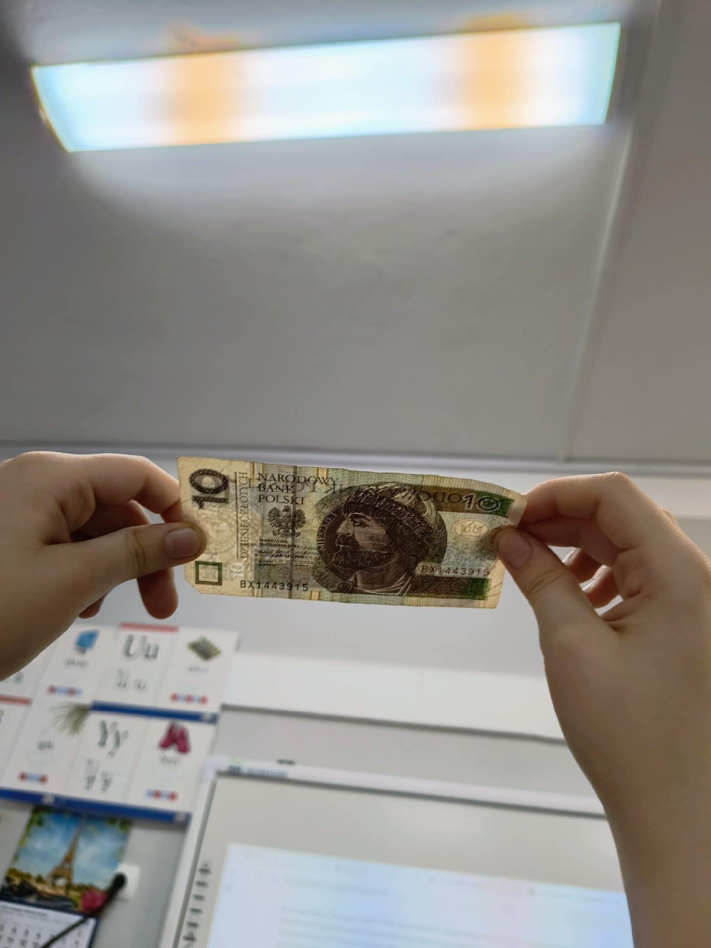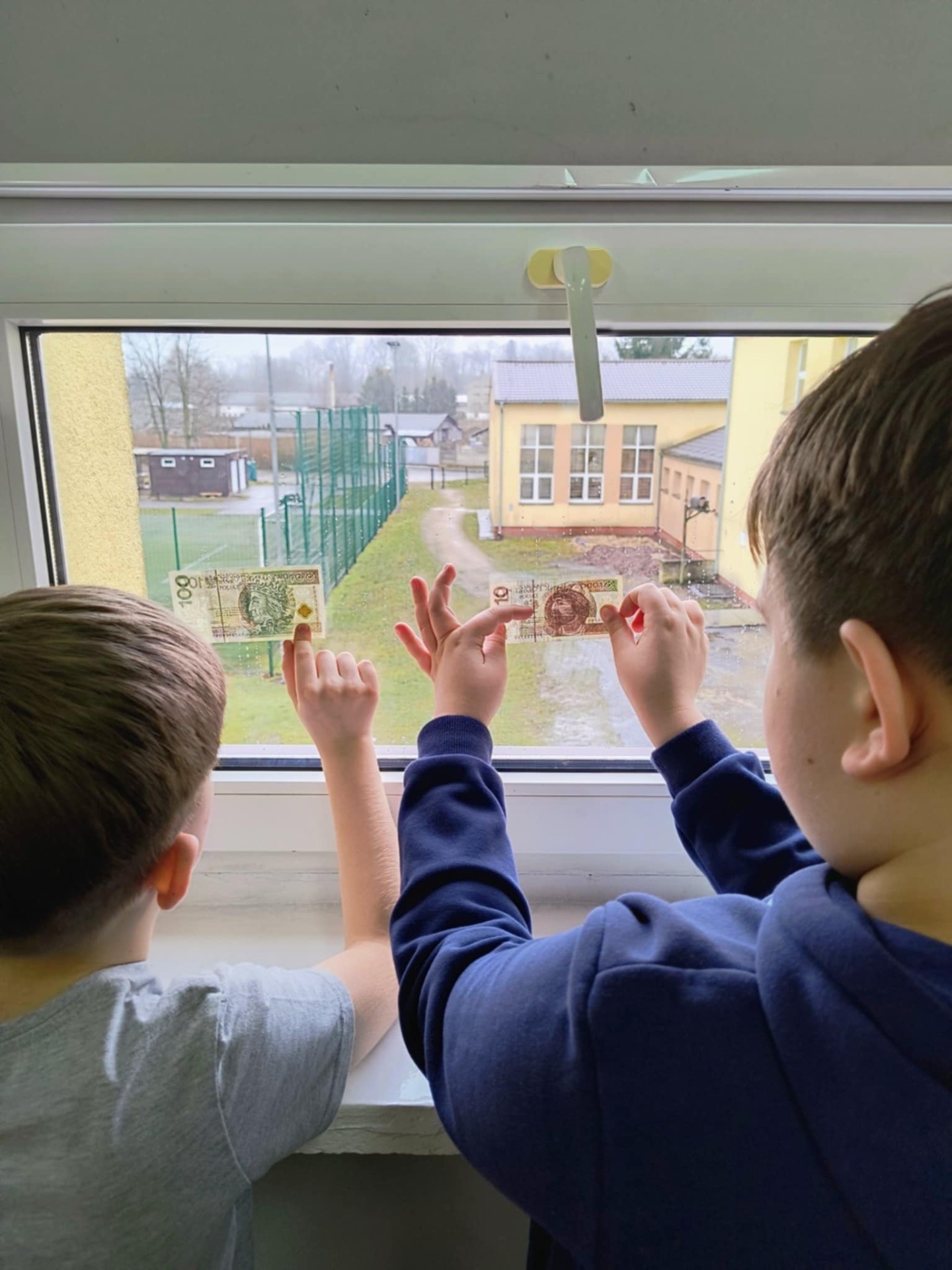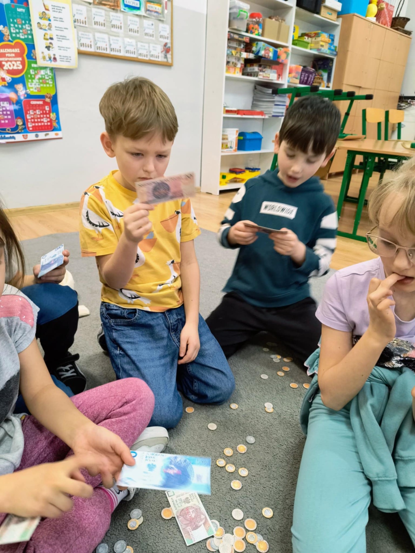 Podczas zajęć "Matematyka z TIK" uczniowie klas pierwszych i drugich poznali różne rodzaje środków płatniczych, dowiedzieli się jakimi przedmiotami płacono dawniej oraz jak wyglądały pierwsze pieniądze. Wychowankowie, zwielkim zainteresowaniem dokonali szczegółowej analizy elementów awersu i rewersu monet a także elementów zabezpieczających banknotów, samodzielnie sprawdzali czy banknoty posiadają znak wodny i nitkę zabezpieczającą. Podsumowaniem ciekawej lekcji matematyki było zaprojektowanie własnych banknotów.