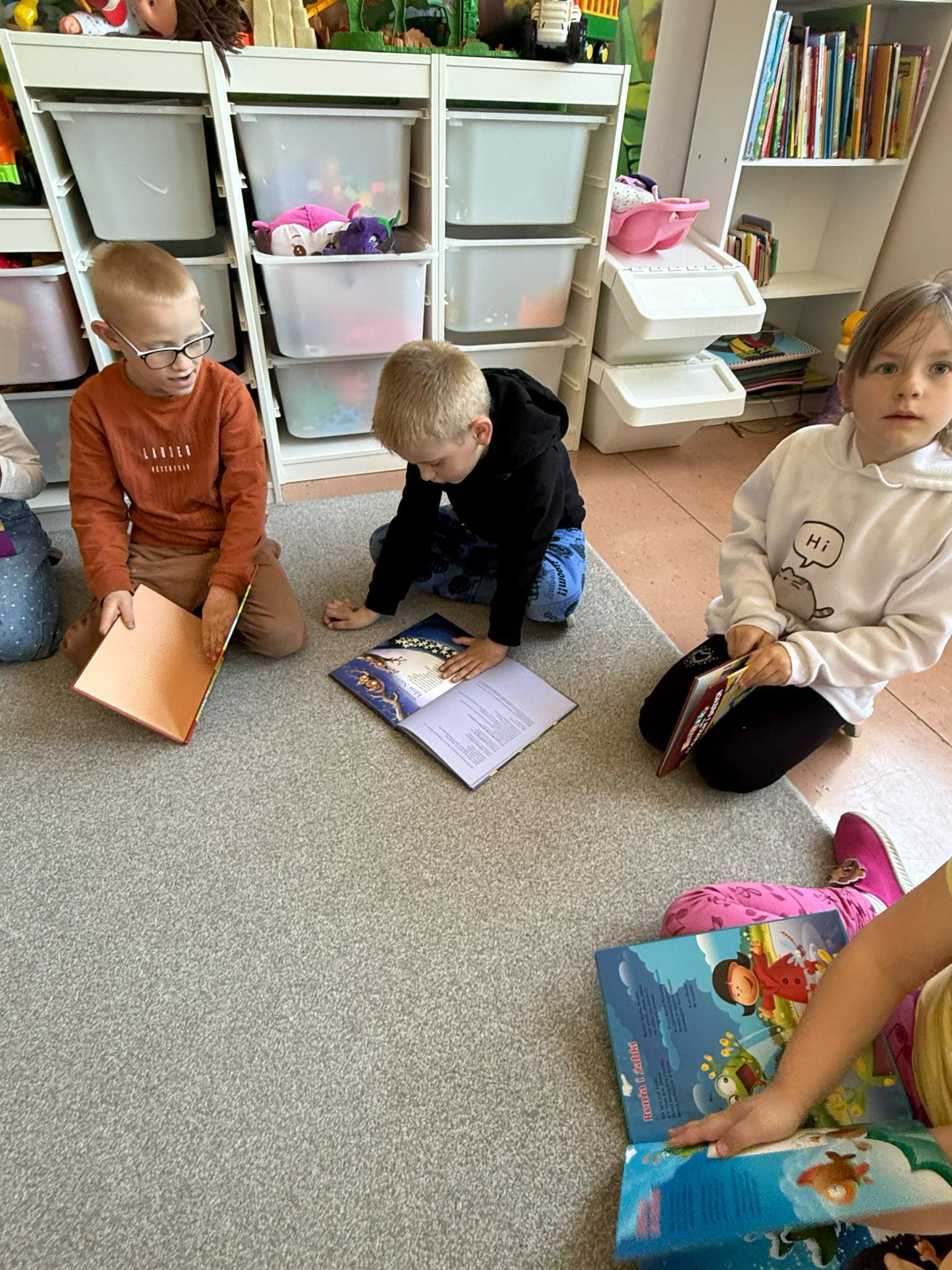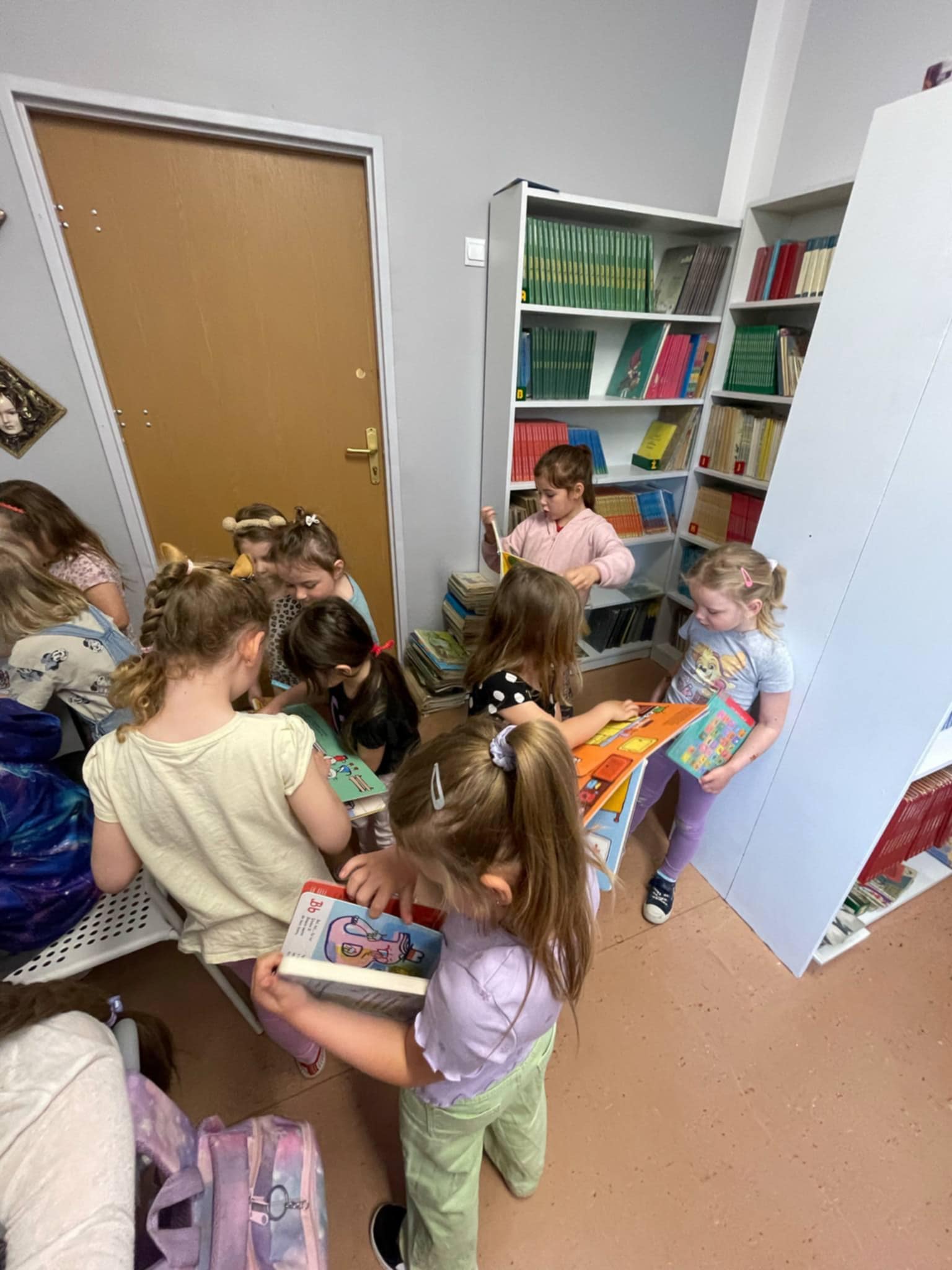 5-latki wypożyczyły książki z biblioteki szkolnej do przeczytania w domach.