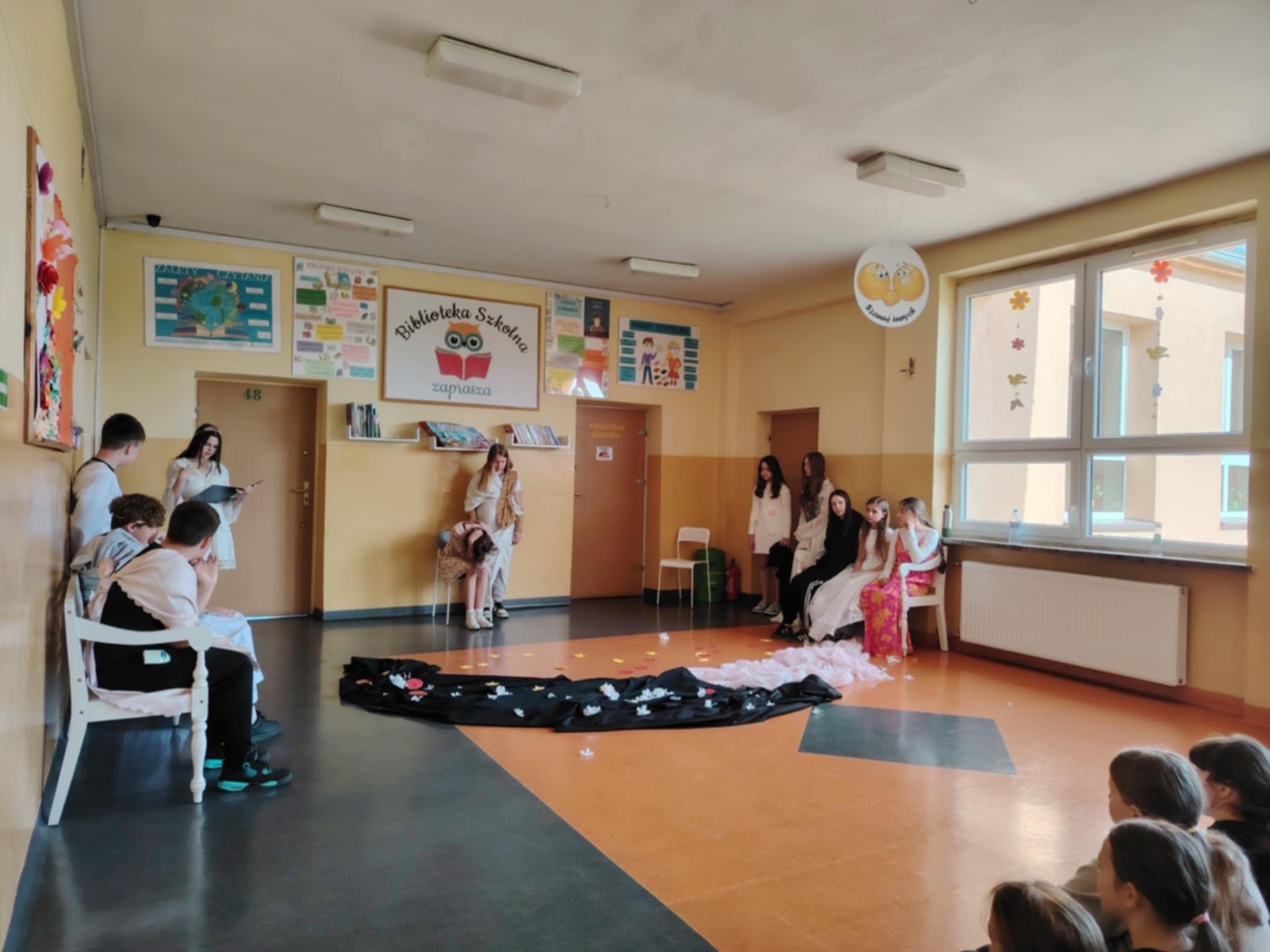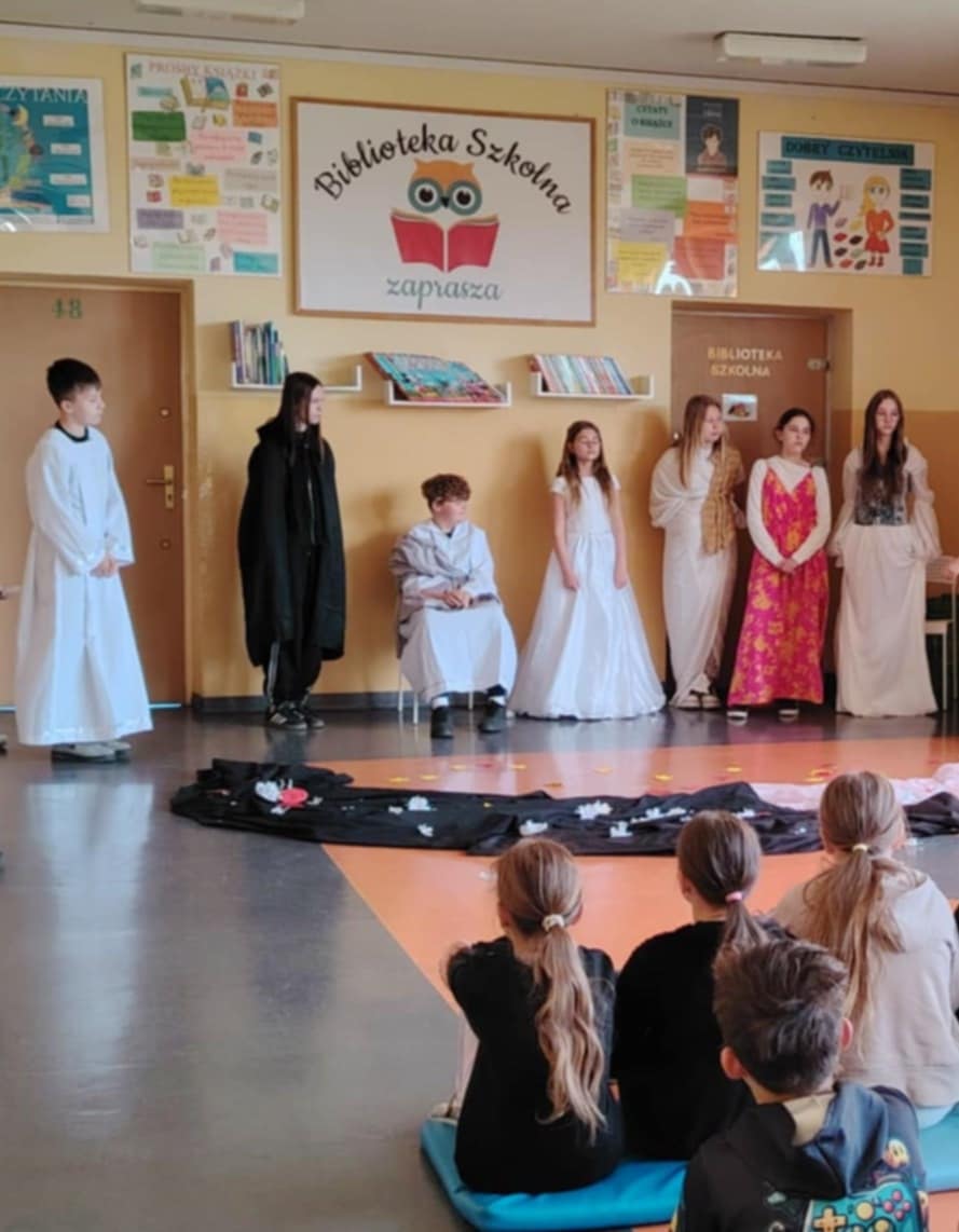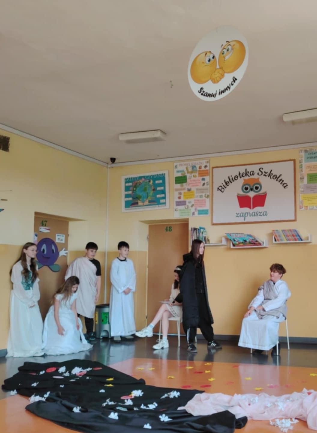 W kręgu zainteresowania naszych młodych aktorów znalazła się mitologia grecka, więc z entuzjazmem przygotowali przedstawienie pt. „Demeter i Kora”. Występ adresowany był do koleżanek i kolegów z klas III, IV oraz V. Efekty ciężkiej pracy zostały docenione przez widownię, co stanowiło dla uczniów z kółka teatralnego powód do dumy i motywację do dalszego rozwoju umiejętności aktorskich.