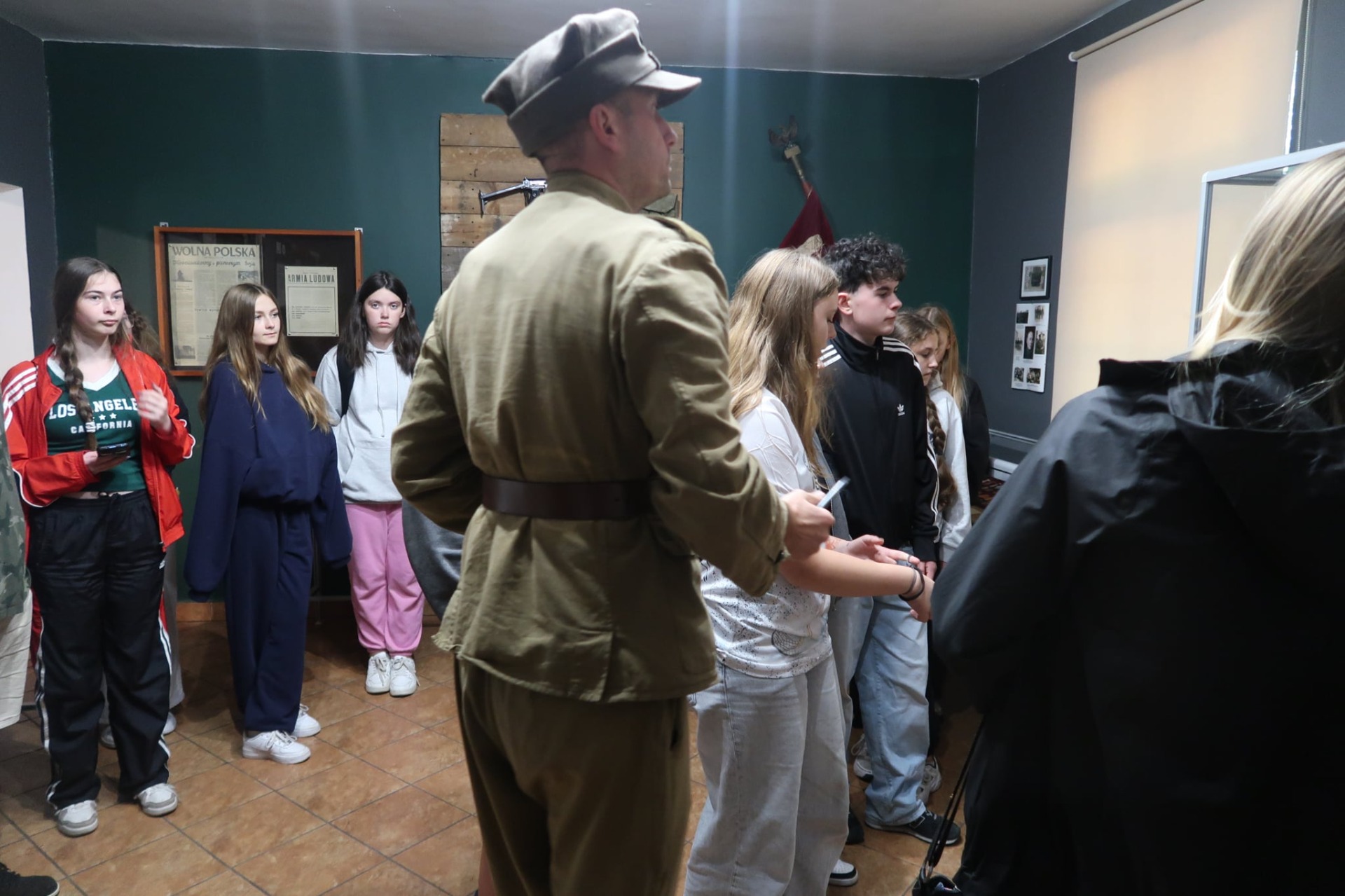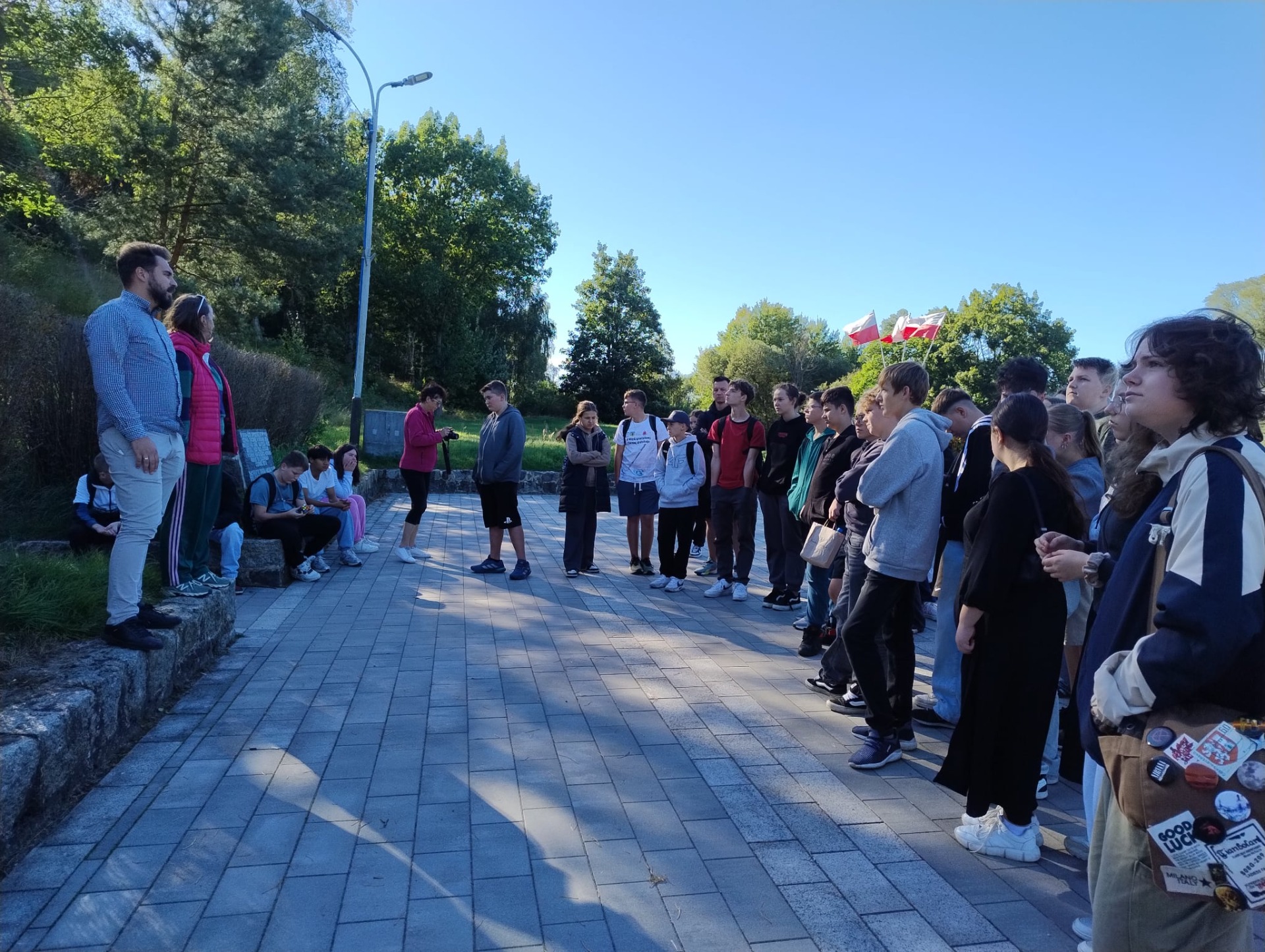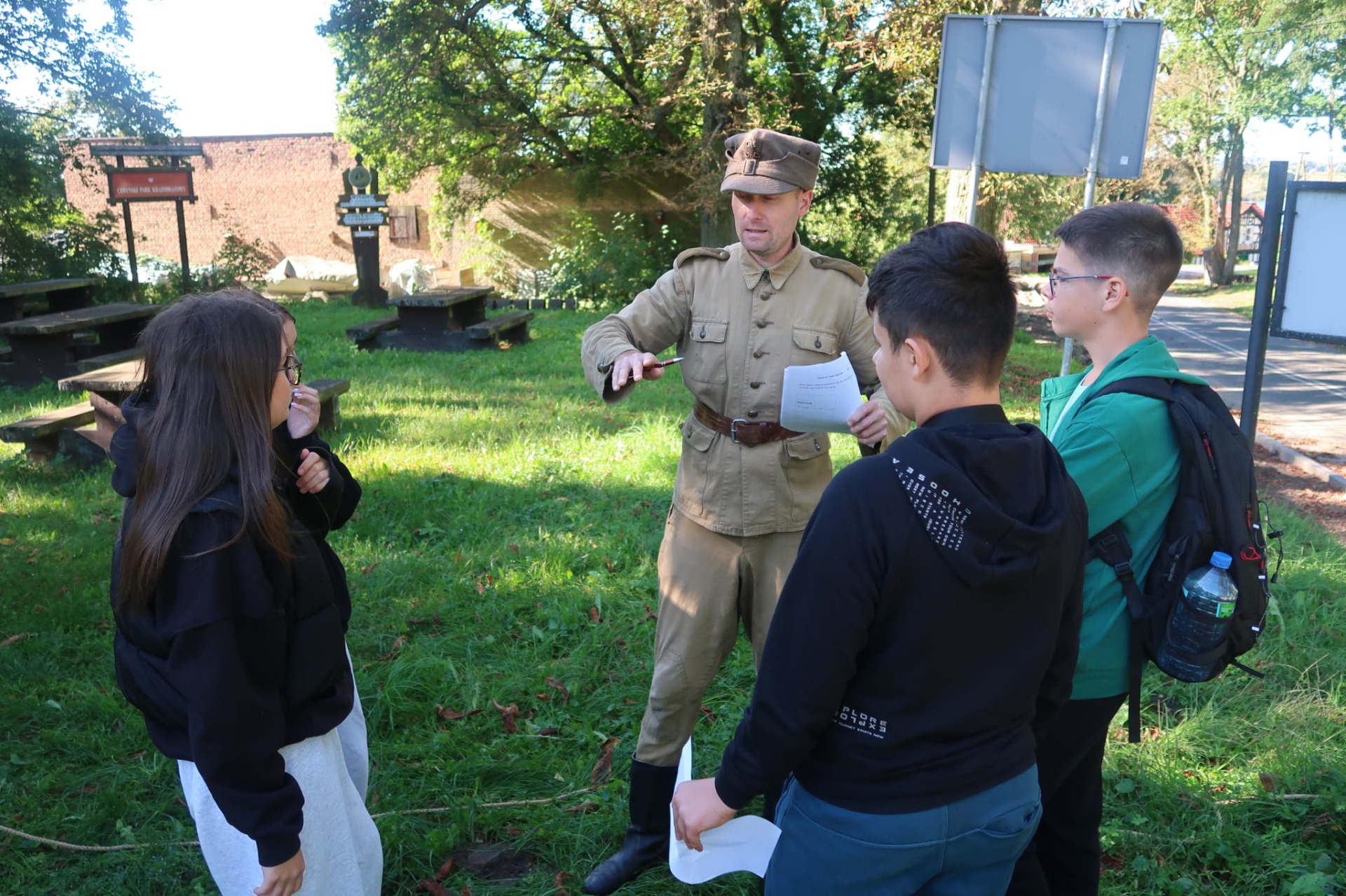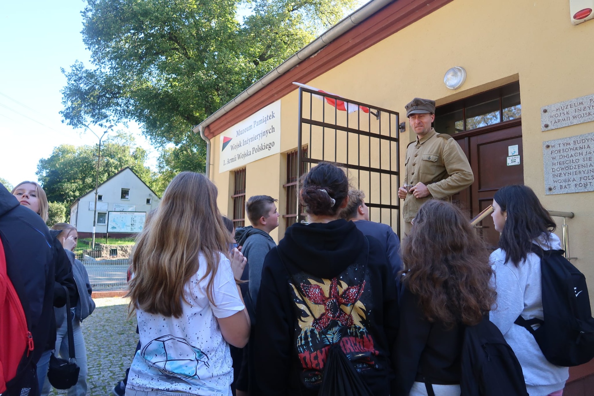 🥐 Dzień rozpoczęliśmy od pożywnego śniadania w CKW Mróz 🍞🥛🍳, które dodało nam energii na pełne przygód przedpołudnie. Wraz z uczniami z partnerskiej szkoły Regionale Schule Albert Einstein w Torgelow 👩🎓👨🎓 wyruszyliśmy w pierwszą podróż w czasie i przestrzeni – do Muzeum Pamiątek 1. Armii Wojska Polskiego w Gozdowicach 🏛️📜. To miejsce okazało się prawdziwą lekcją historii – mogliśmy zobaczyć z bliska eksponaty z czasów walk na tych terenach ⚔️🪖 i poczuć atmosferę tamtych wydarzeń. Na uczestników czekała też gra terenowa 🗺️🔍, podczas której szukaliśmy skrzynek ukrytych w różnych miejscach, odnajdywaliśmy punkty widokowe 🏞️🌳 i uzupełnialiśmy specjalne karty pracy 📝✏️. Każdy „ukryty skarb” 💎 przybliżał nas do końcowego celu i pozwalał odkrywać historię na żywo, nie tylko w murach muzeum, ale także wokół kościoła ⛪ i pomnika 🗿.