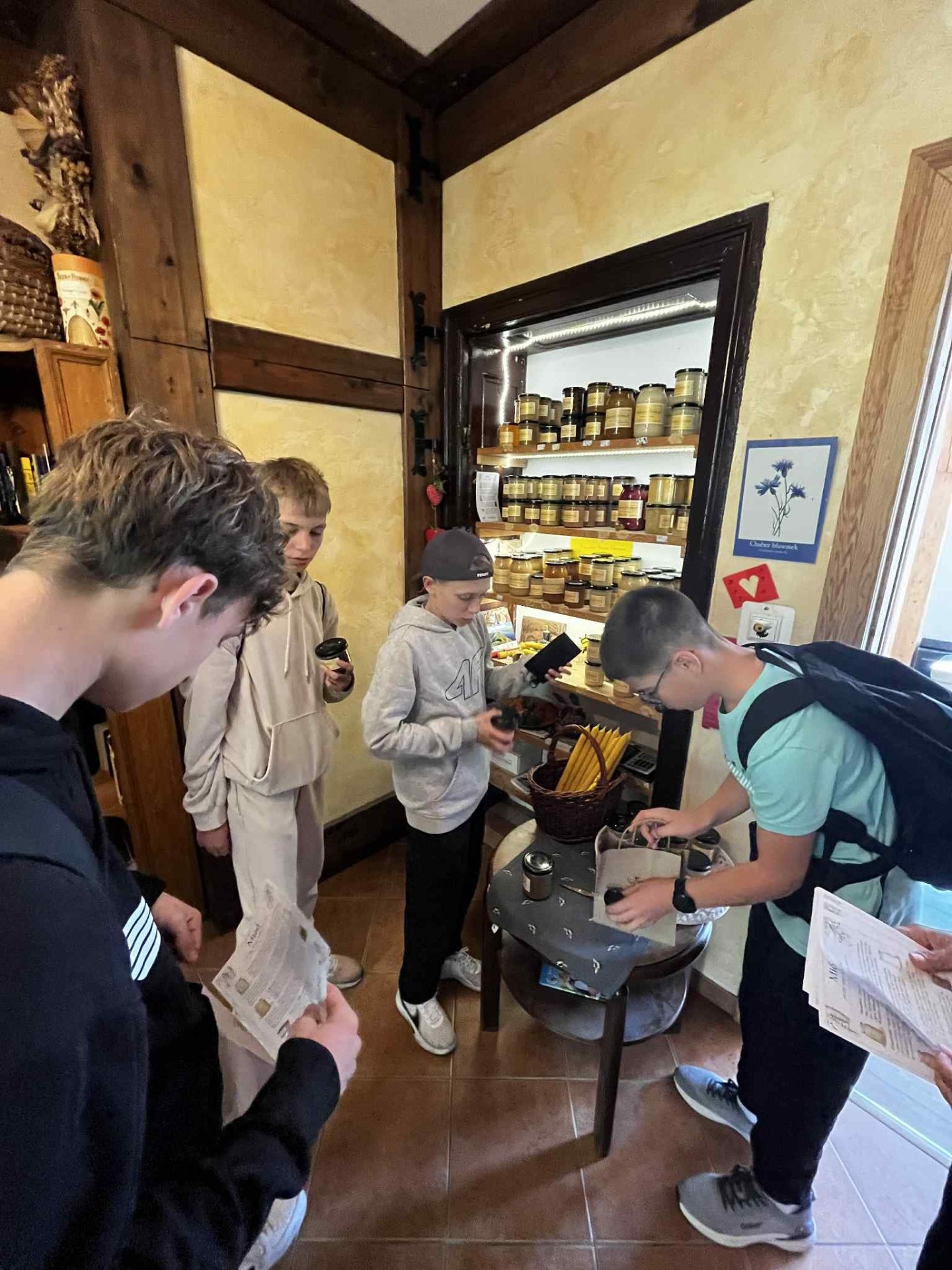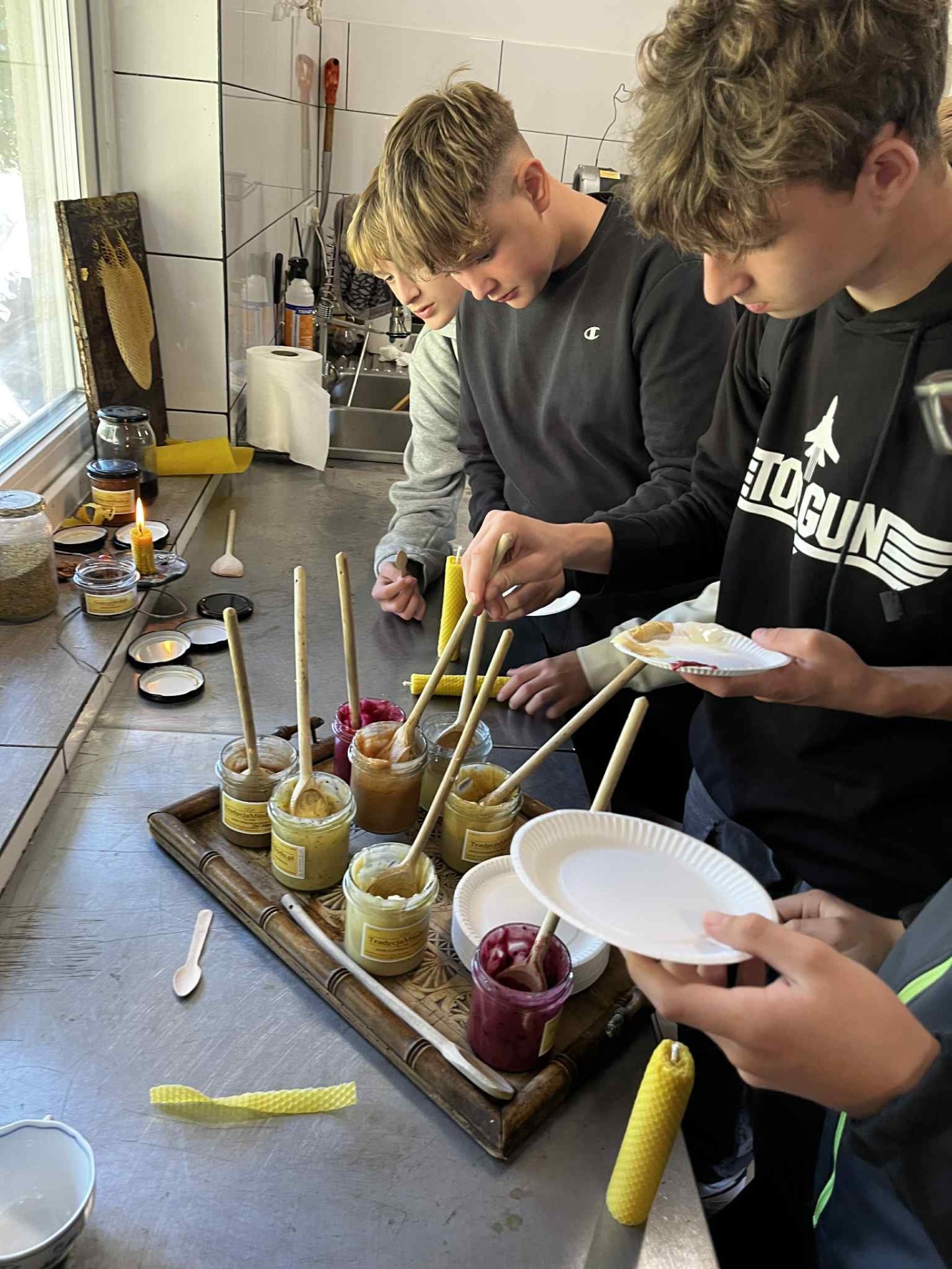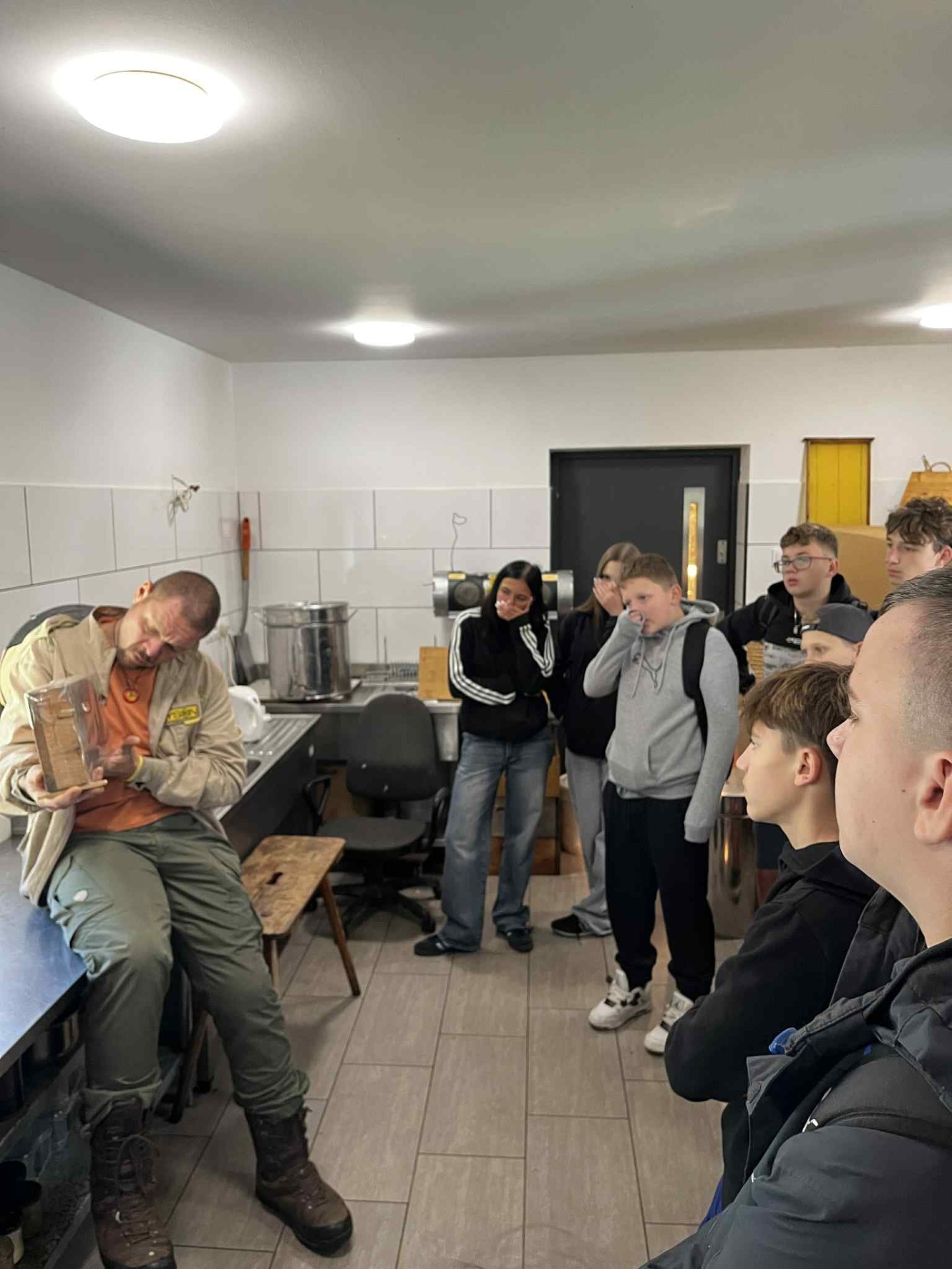🍯 Po intensywnym poranku przyszedł czas na słodkie doświadczenia u Jacka Atroszko – warsztatów pszczelarskich 🐝🍯. Mogliśmy poczuć się jak w ulu 🍯🐝 – wszystko pachniało świeżym woskiem 🕯️, a wokół nas latały pszczółki 🐝💨. Dowiedzieliśmy się, jak pszczoły produkują miód i jakie są jego rodzaje 🍯🍯🍯. Najbardziej wyczekiwanym momentem była degustacja świeżego miodu prosto z pasieki 😋🥄, a zwieńczeniem warsztatów była wizyta w pasiecznym sklepiku 🏪🛒, gdzie każdy mógł zakupić przygotowane słoiczki miodu 🍯🎁.