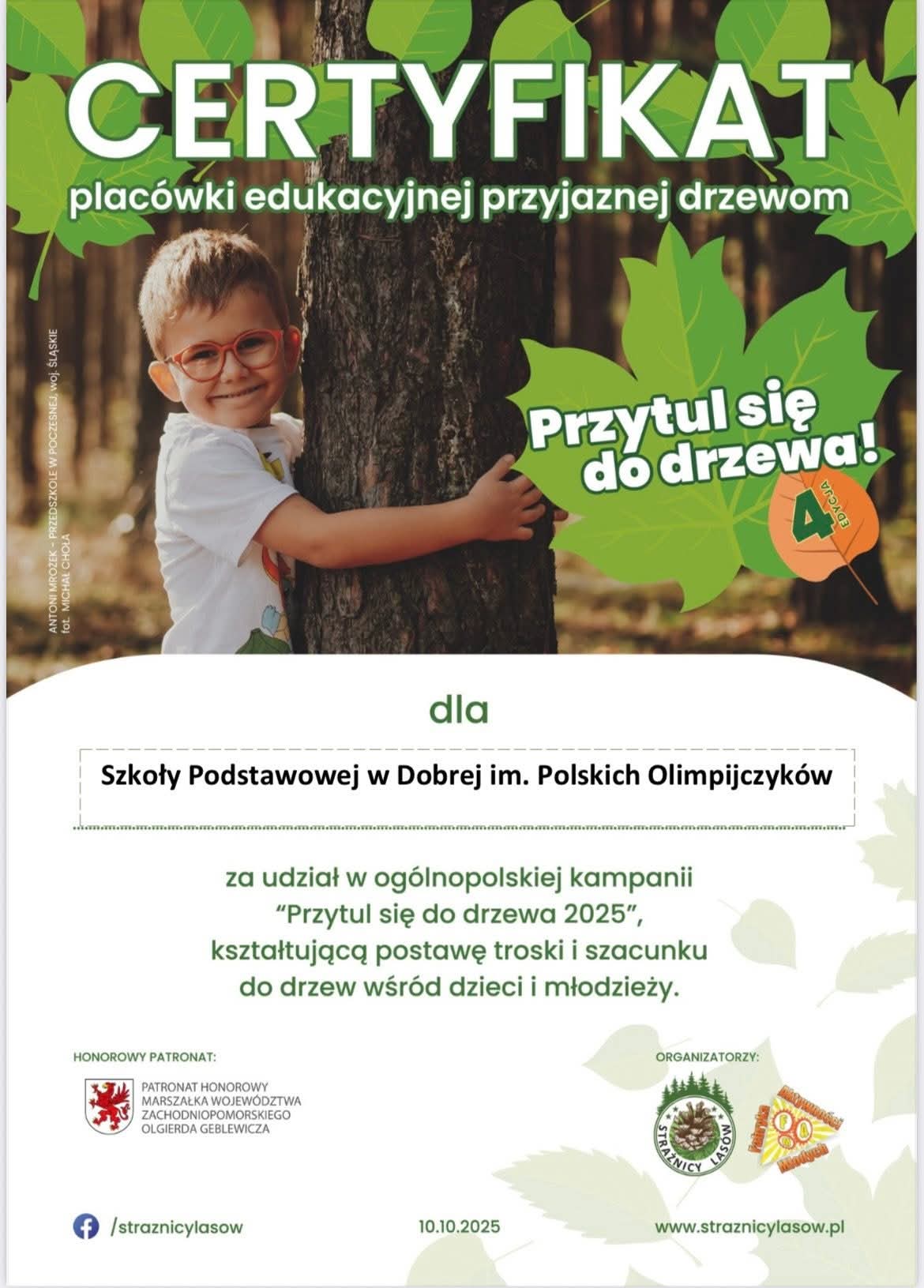 Z radością informujemy, że uczniowie naszej szkoły wzięli udział w ogólnopolskiej akcji „Przytul się do drzewa” – Edycja 2025. 🌳🍀