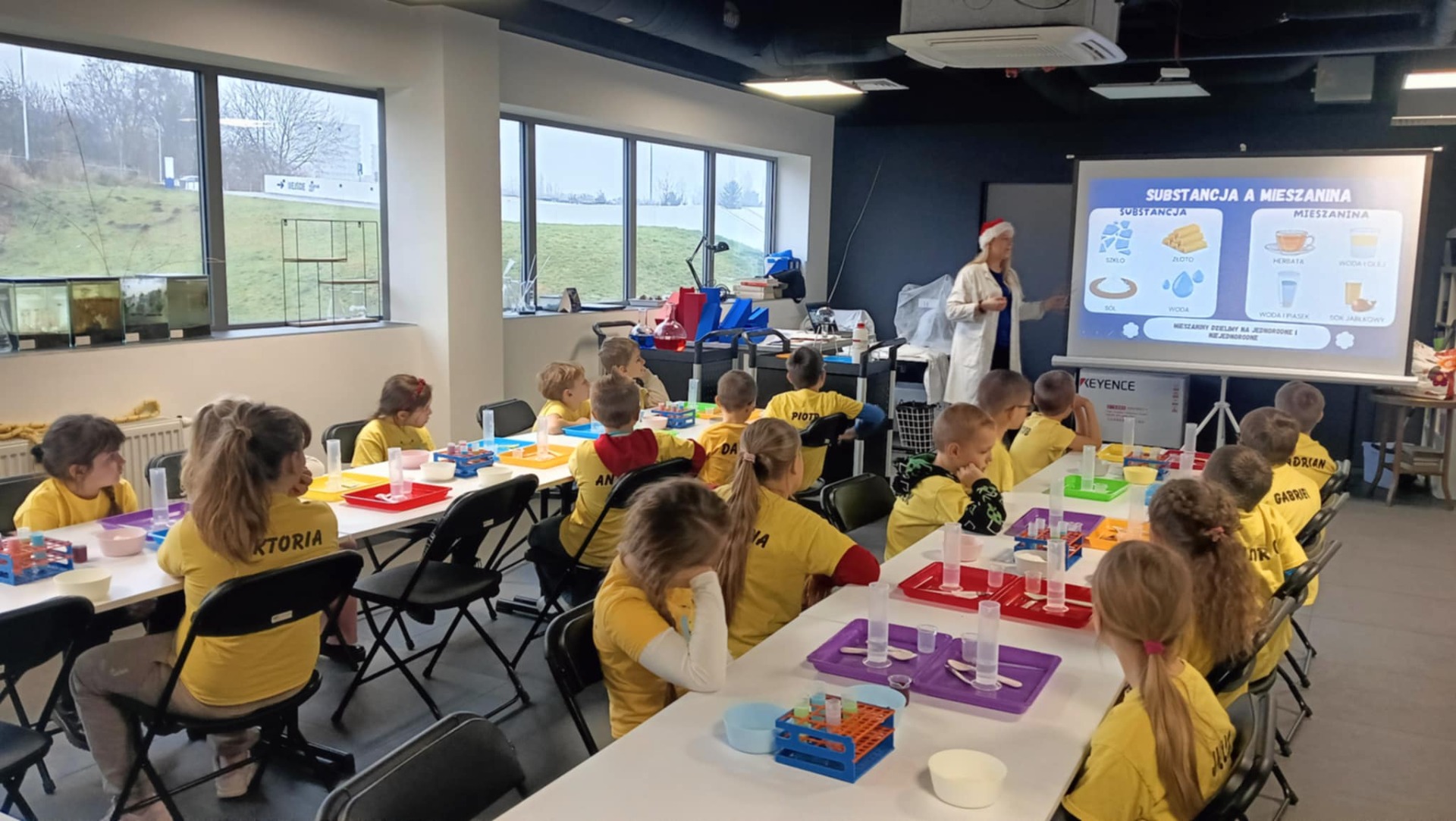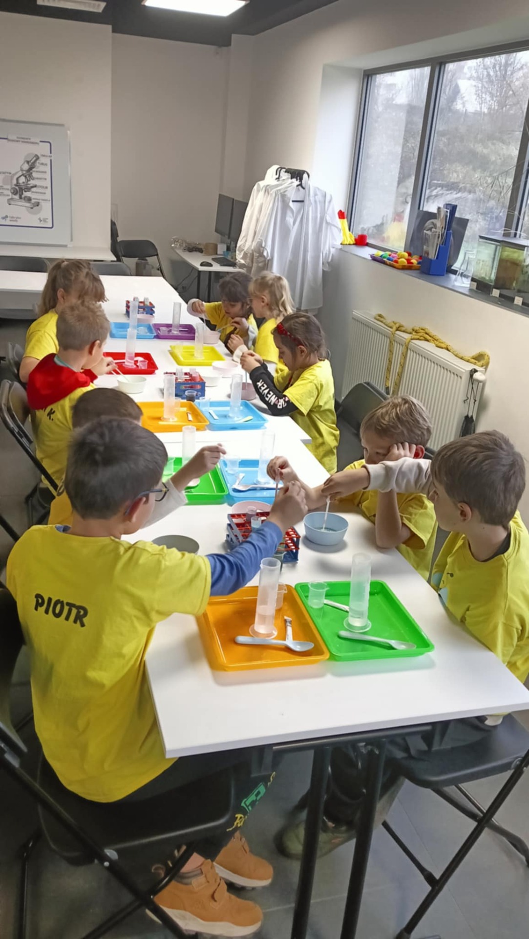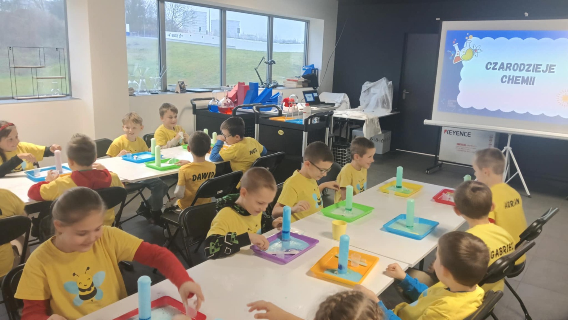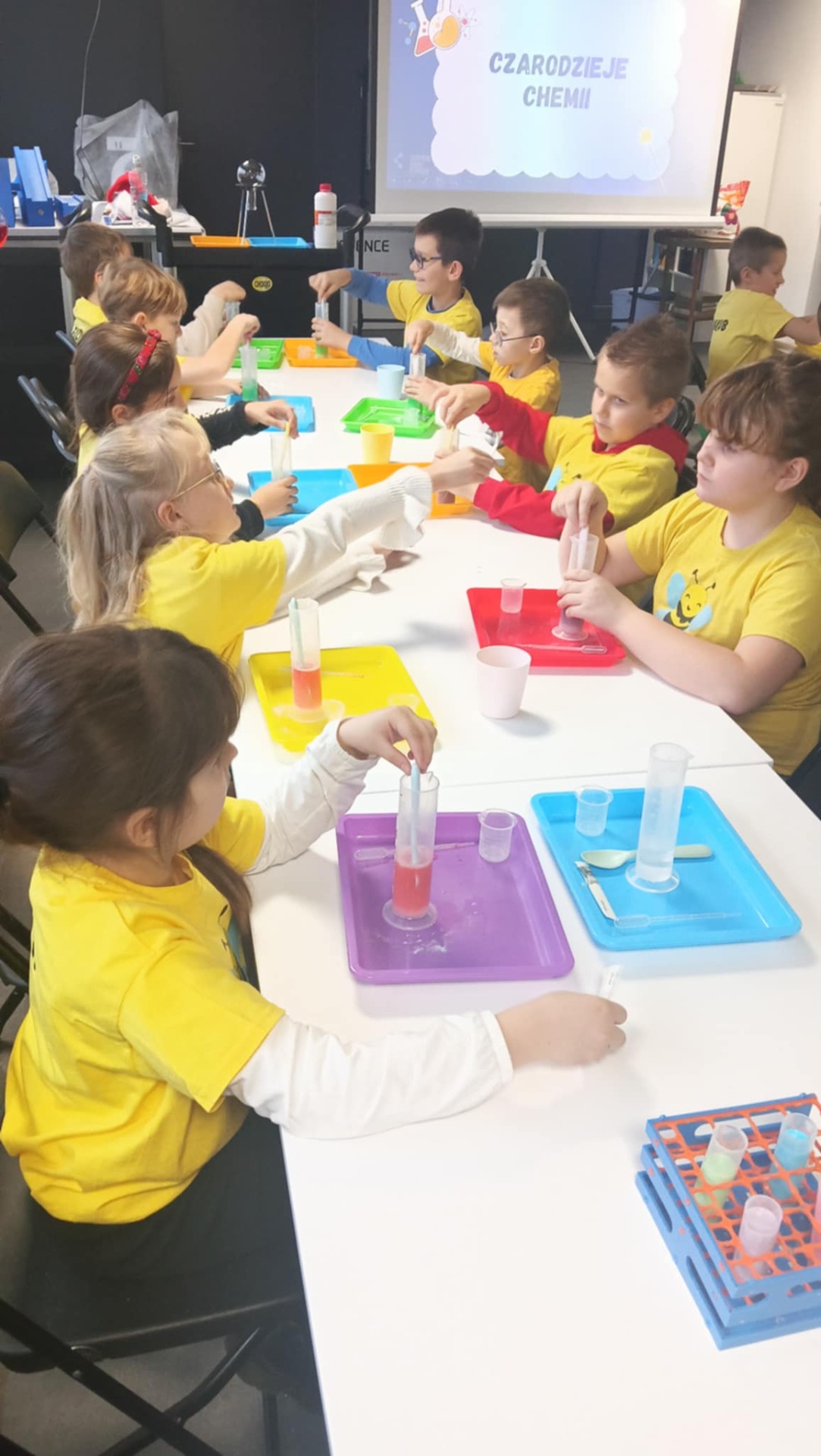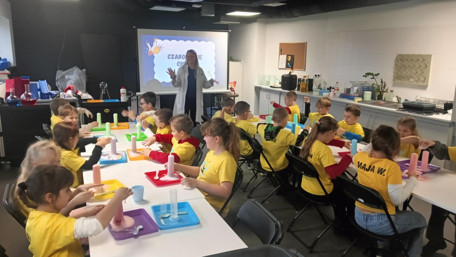 Następnie klasa udała się na warsztaty „Czarodzieje chemii” 🧪🔮. Uczniowie zamienili się w małych naukowców, samodzielnie wykonując doświadczenia i obserwując fascynujące reakcje chemiczne. Nauka połączona z zabawą sprawiła wszystkim ogromną frajdę 🤗.