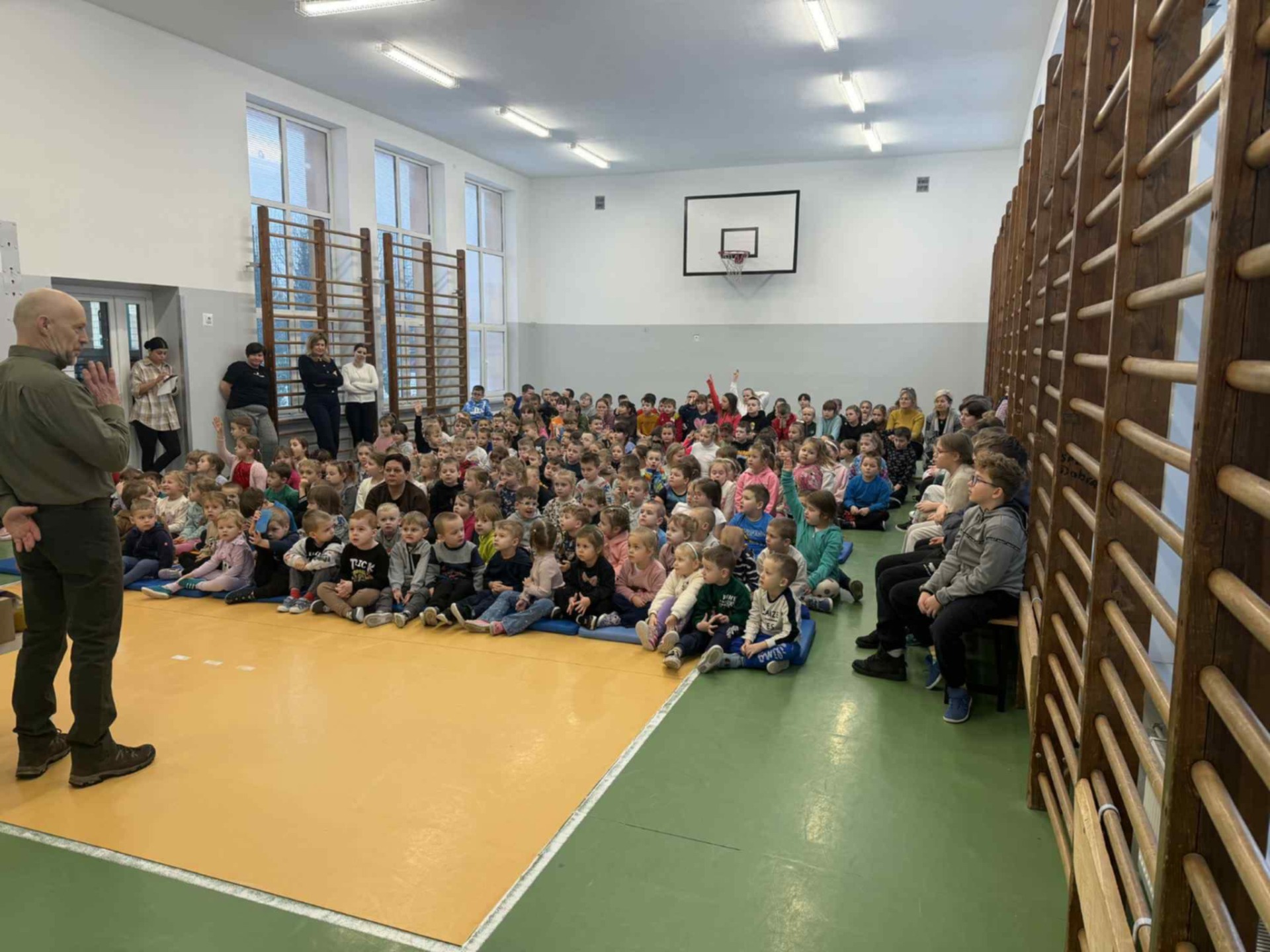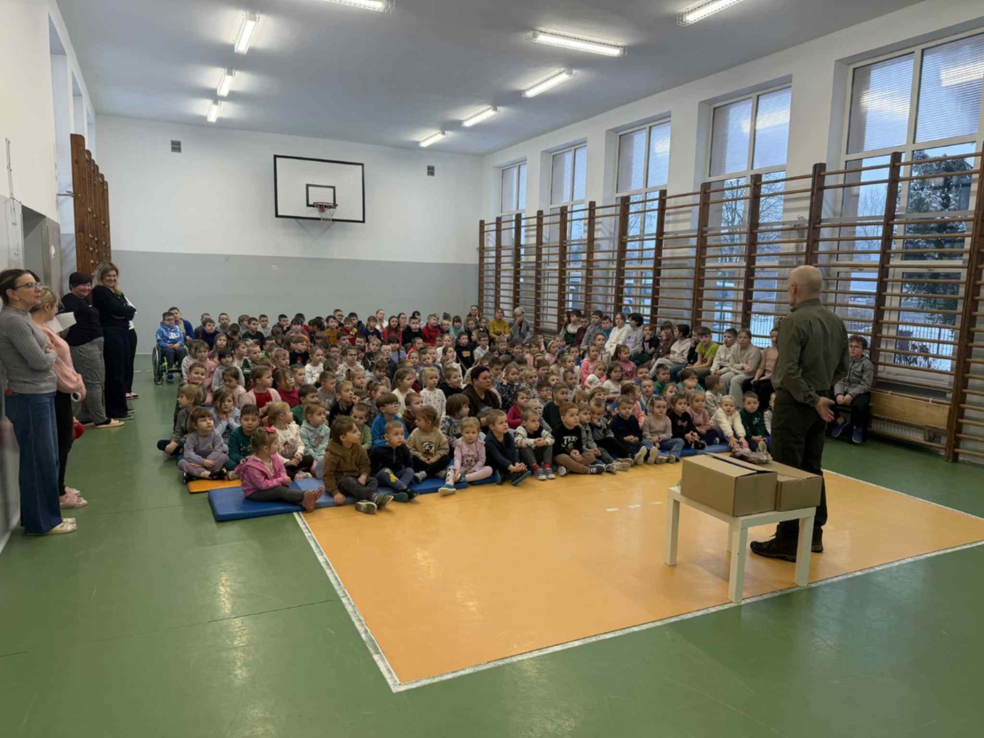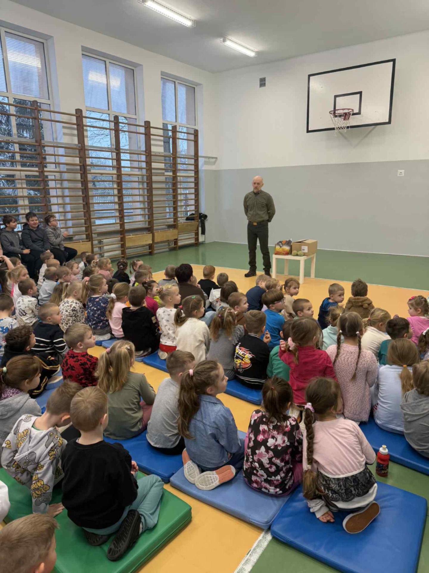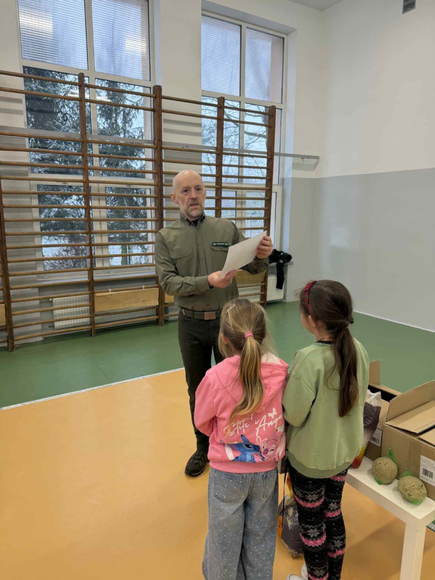 Przedszkolaki oraz uczniowie klas I–III mieli okazję spotkać się z leśniczym, który opowiedział o dokarmianiu ptaków zimą 🐦❄️