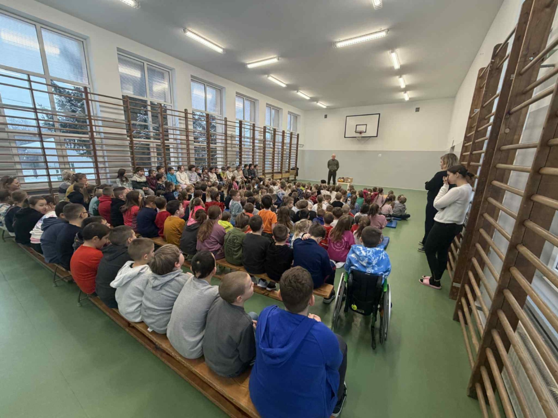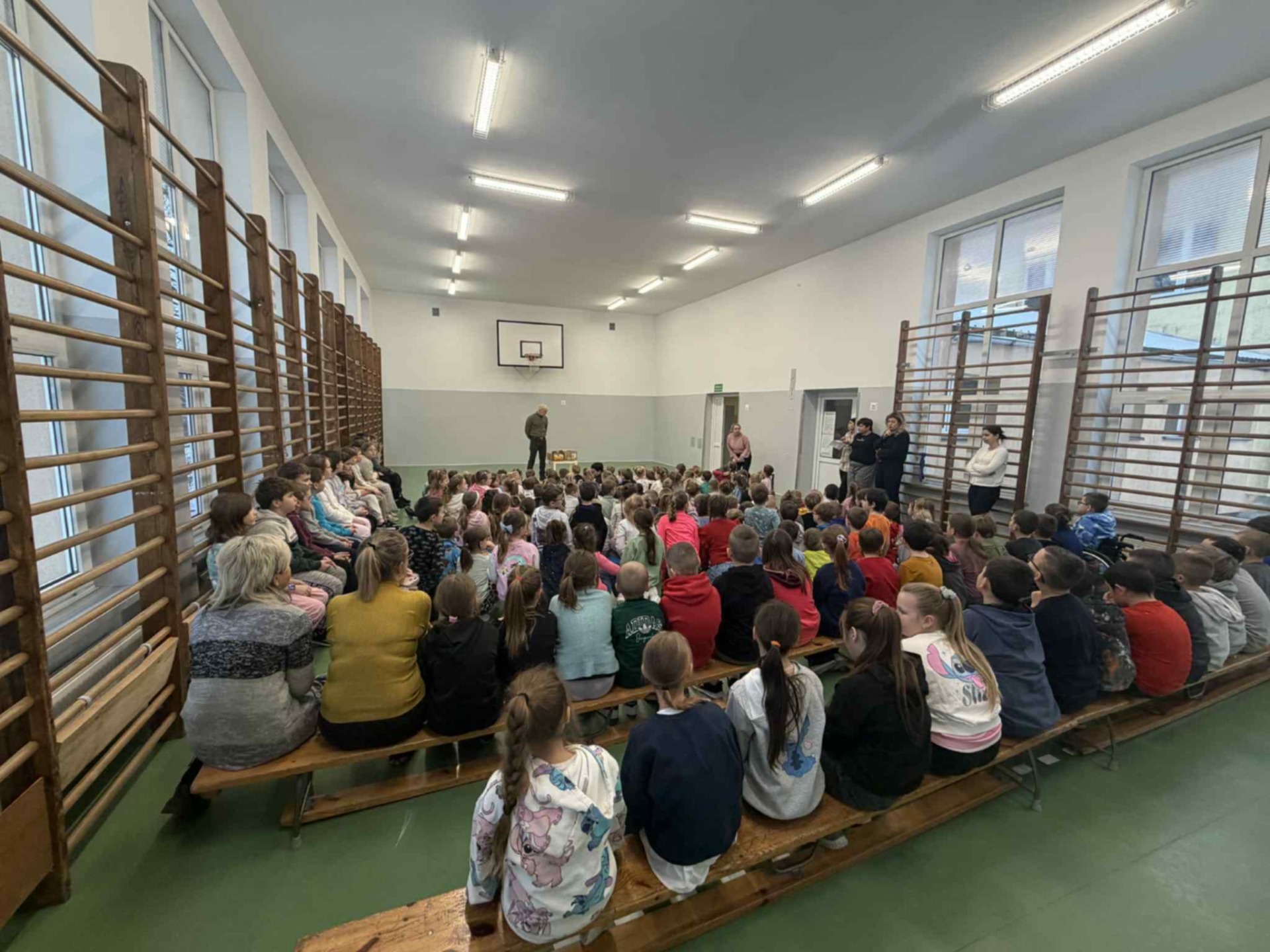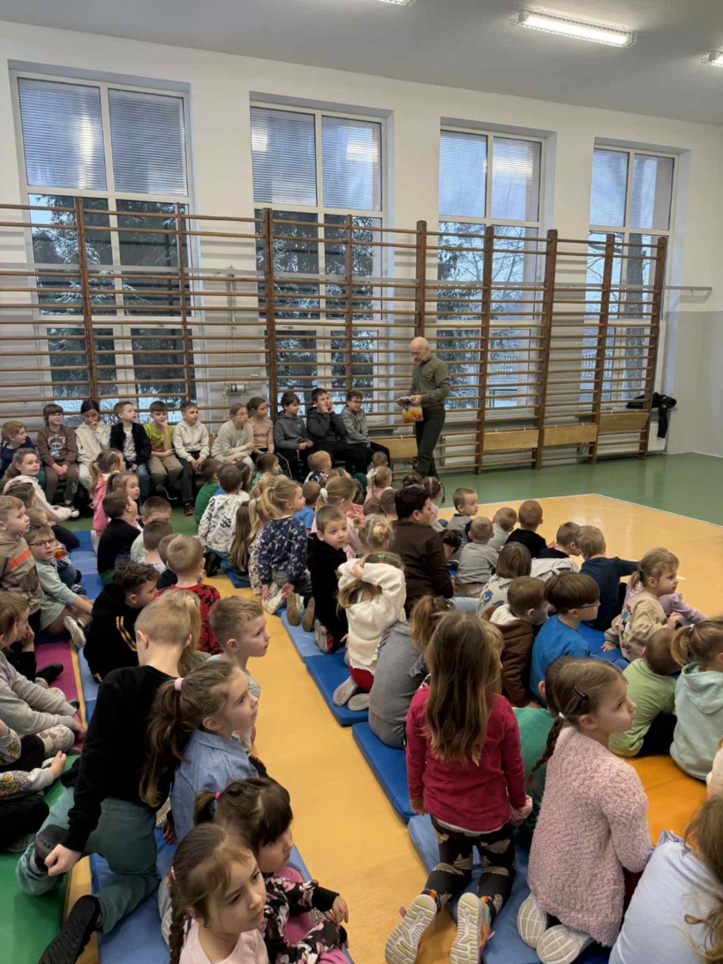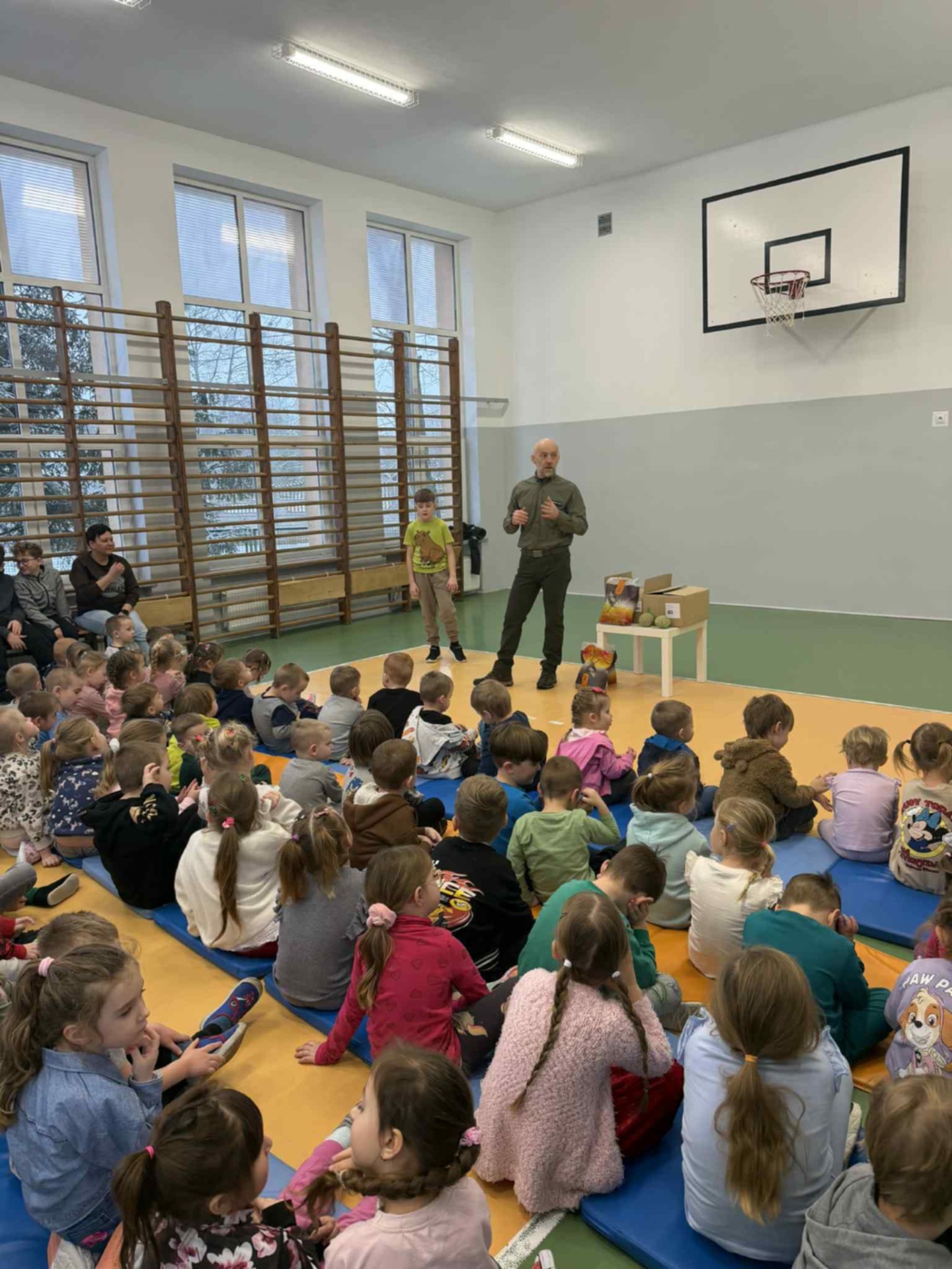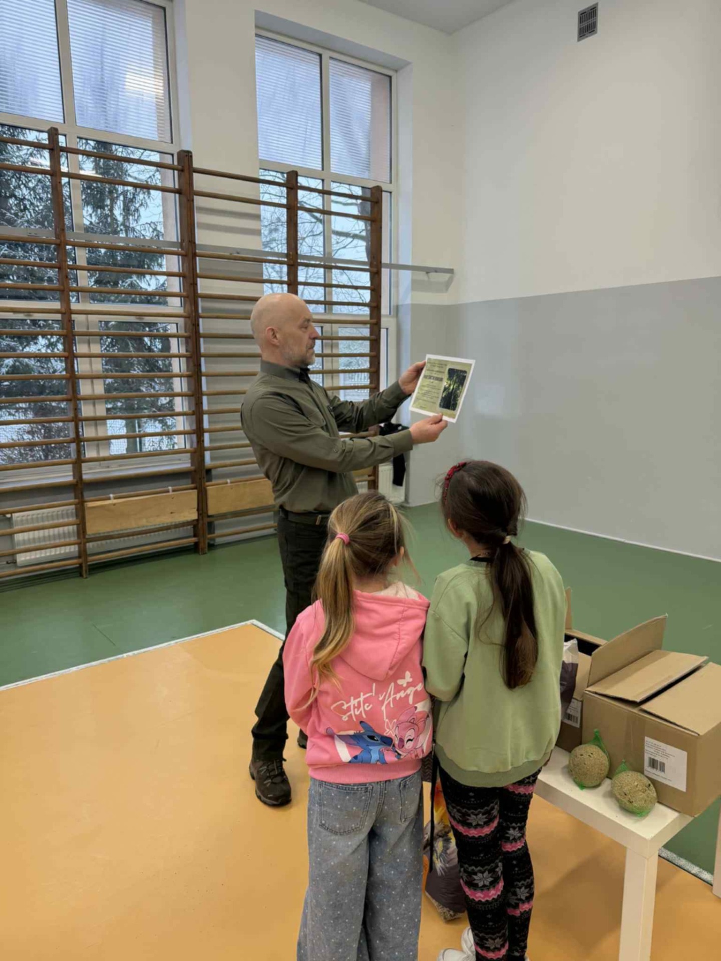 Przedszkolaki oraz uczniowie klas I–III mieli okazję spotkać się z leśniczym, który opowiedział o dokarmianiu ptaków zimą 🐦❄️